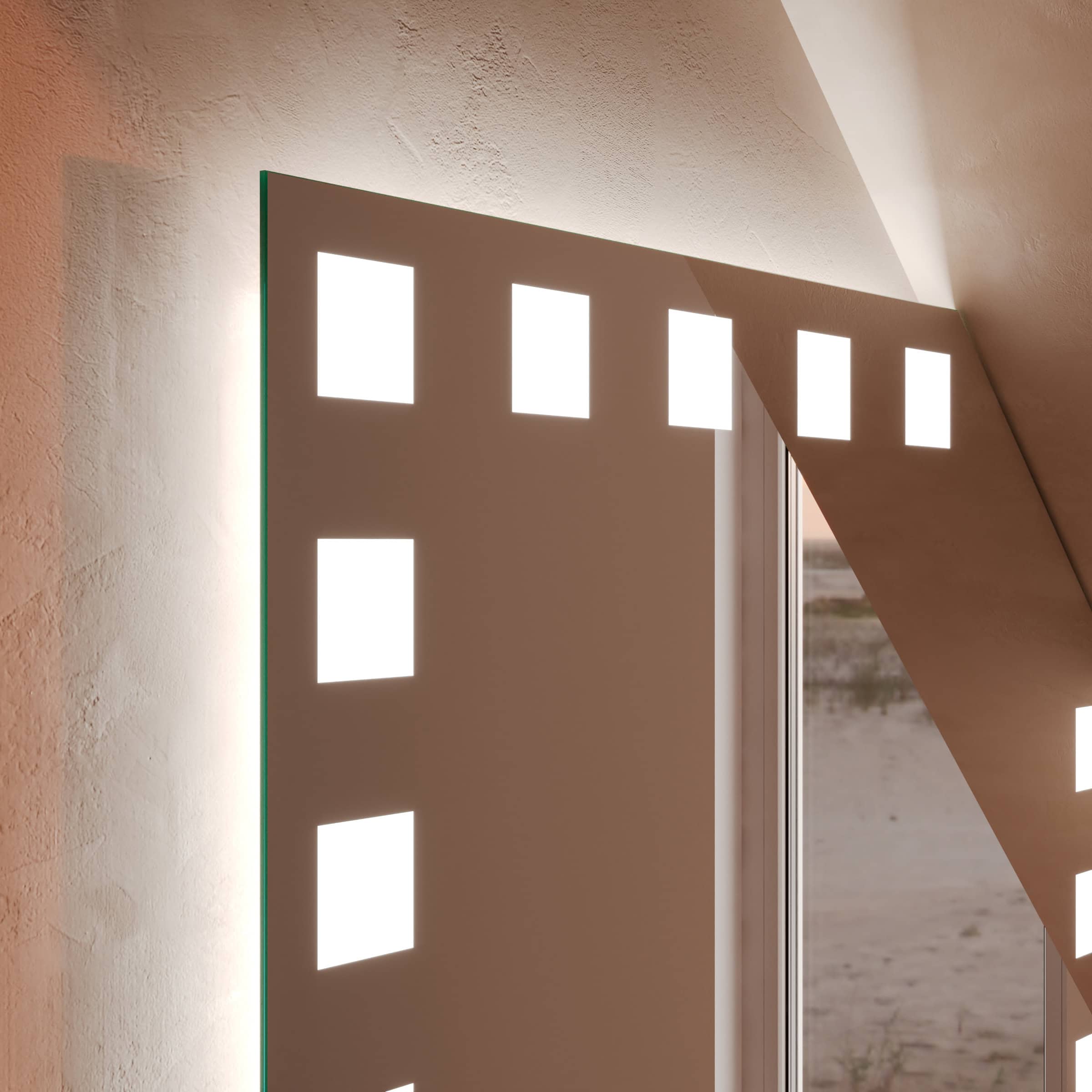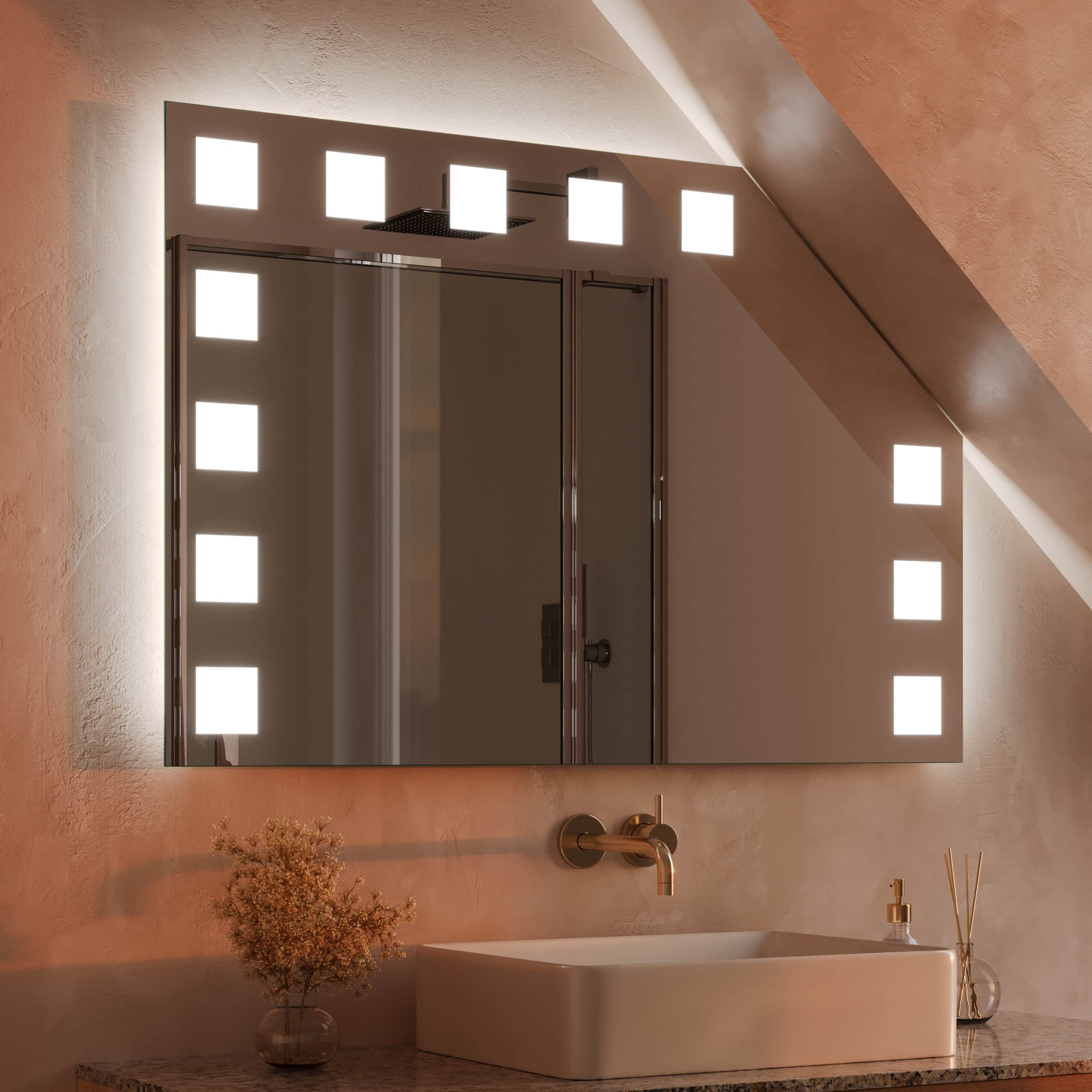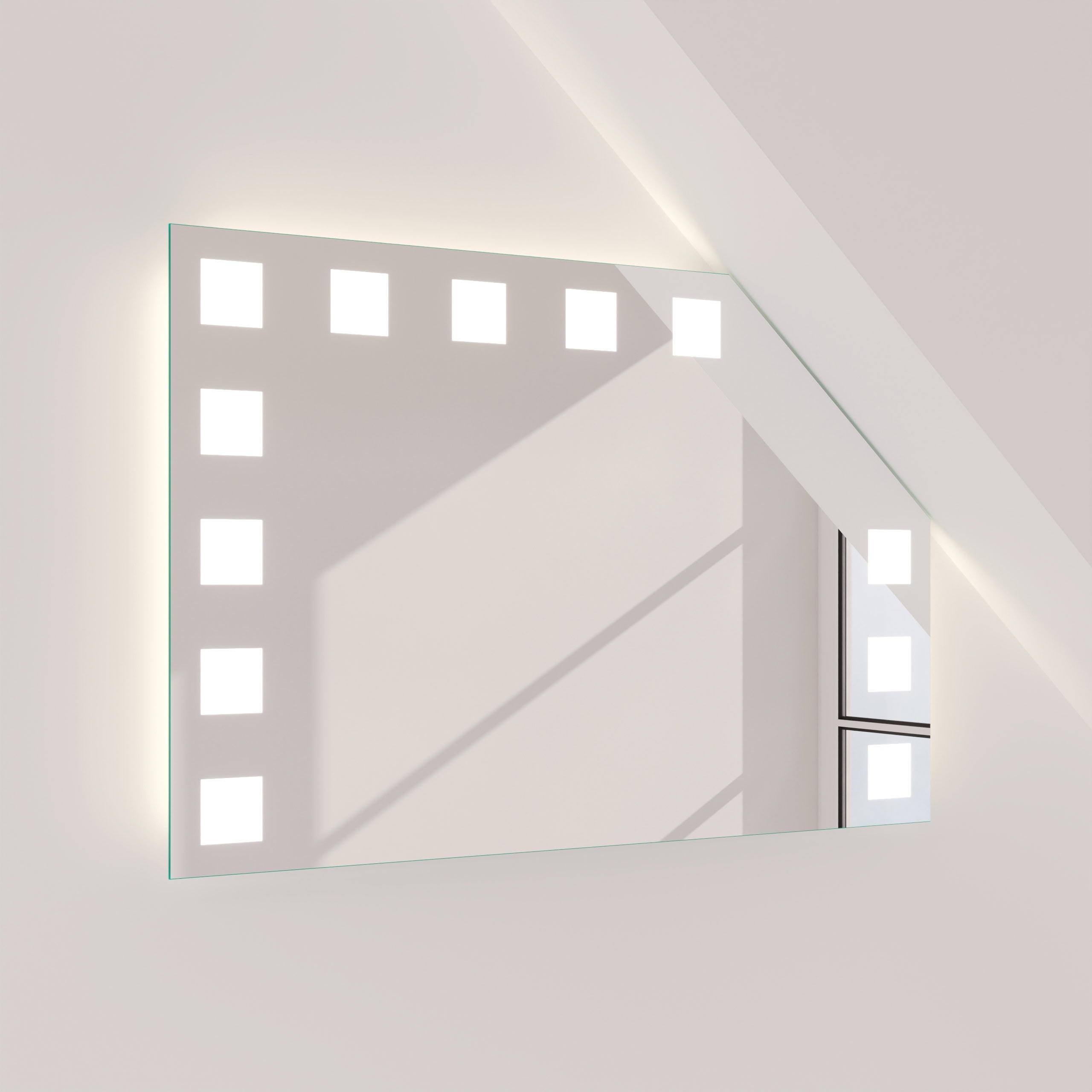 Der Badspiegel Hollywood Dice C wurde speziell für Bäder mit Dachschrägen konzipiert und fügt sich als maßgefertigtes Unikat nahtlos in Ihre individuelle Raumarchitektur ein. Die asymmetrische Anordnung der Beleuchtung an der linken, oberen und rechten Seite schafft nicht nur einen spannenden visuellen Akzent, sondern sorgt auch für eine funktionale Ausleuchtung. Das für Kosmetik optimierte LED-Licht wirft ein schattenfreies, klares Licht auf Ihr Gesicht – ideal für die tägliche Pflegeroutine. Durch die indirekte Erhellung der Leuchtfelder entsteht eine sanfte, blendfreie Lichtatmosphäre, die Ihr Badezimmer in eine Oase der Ruhe verwandelt. Gefertigt aus 5mm starkem Kristallspiegelglas, garantiert der Spiegel eine außergewöhnliche Brillanz und eine unverfälschte Reflexion. Die sorgfältig geschliffenen und veredelten Kanten unterstreichen die hochwertige Verarbeitung und sorgen für eine elegante, sichere Haptik.