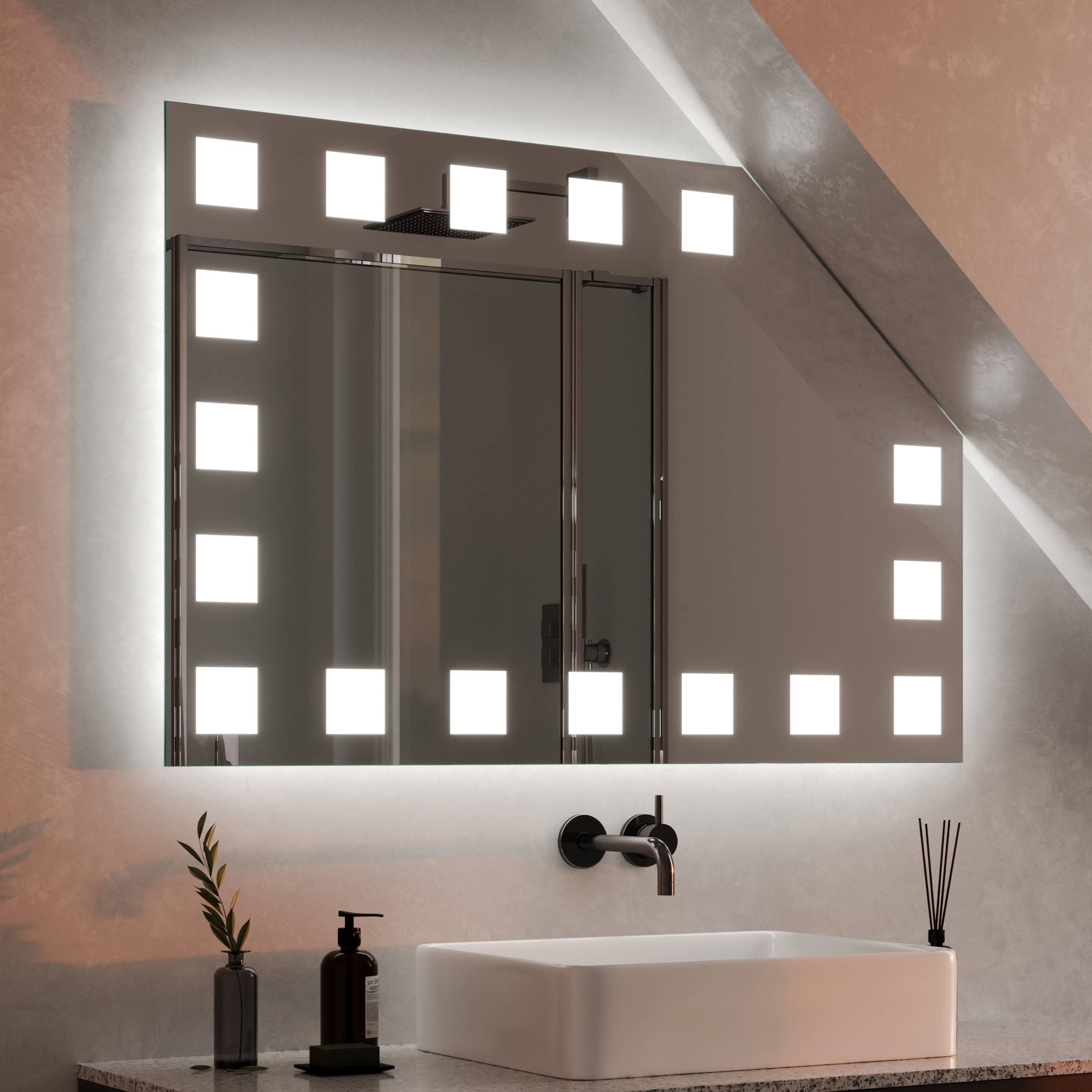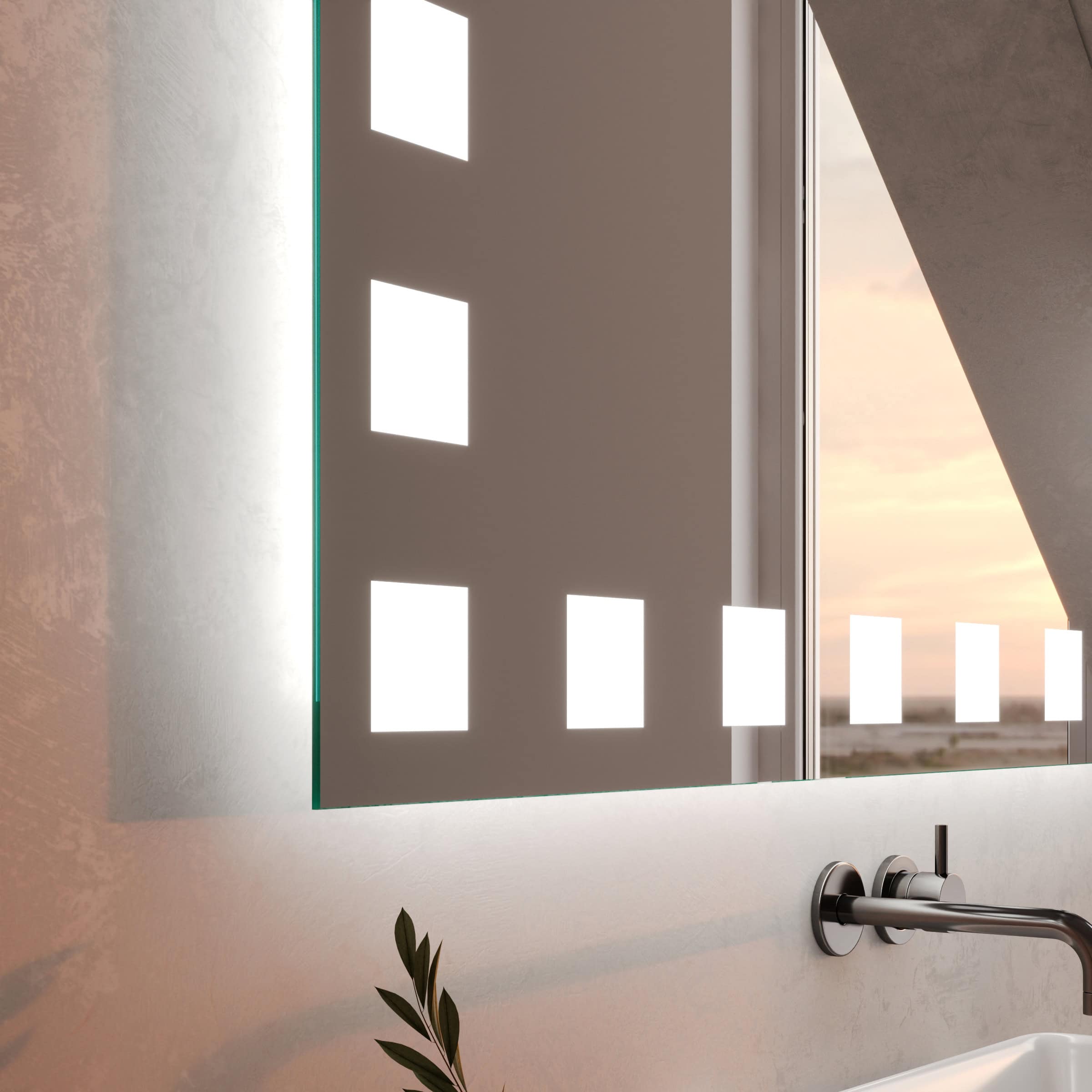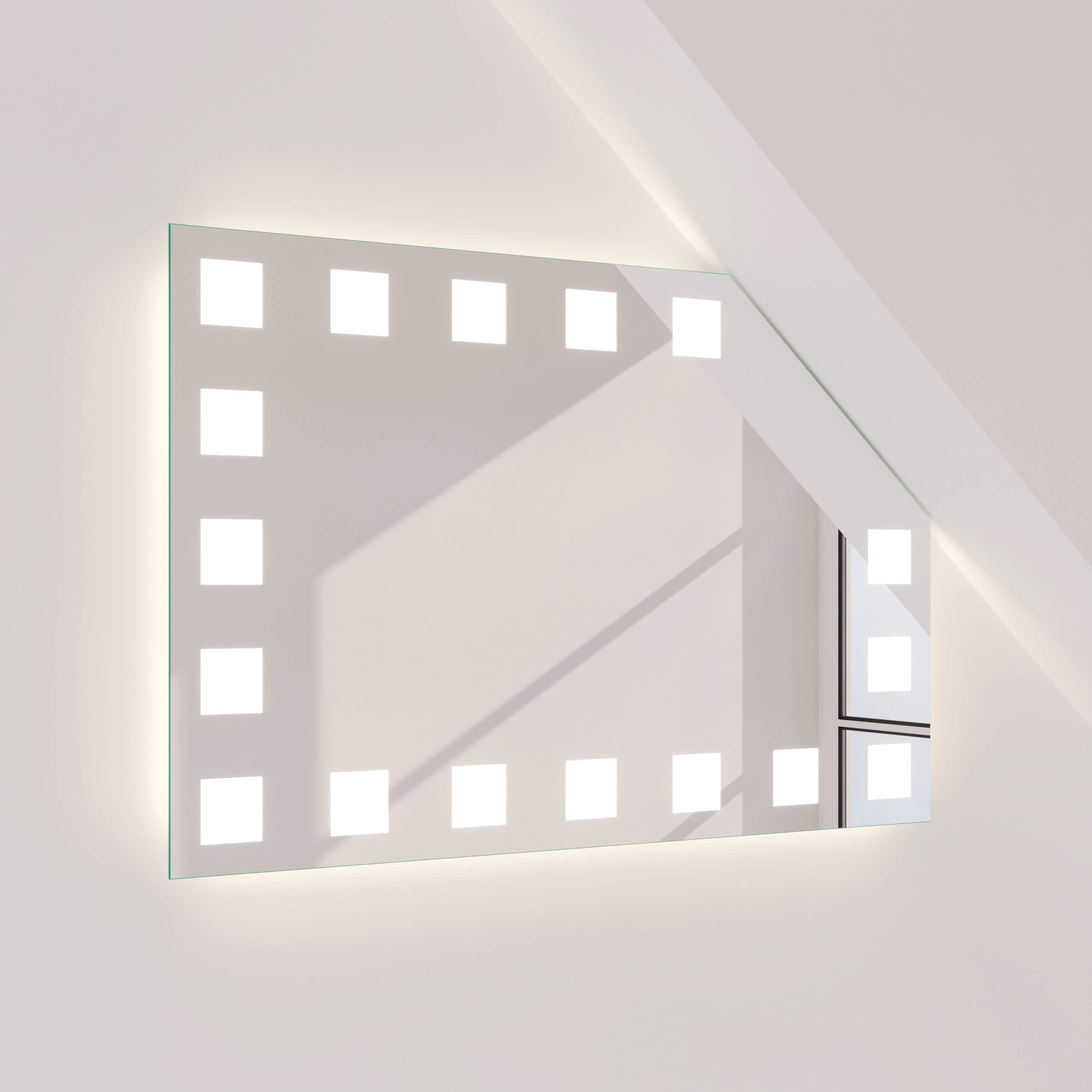 Der Badspiegel Hollywood Dice C wurde speziell für anspruchsvolle Raumsituationen wie die Dachschräge konzipiert. Dank der individuellen Maßanfertigung fügt er sich millimetergenau und harmonisch in Ihr Badezimmer ein und schafft eine optische Weite, wo Standardlösungen versagen. Gefertigt aus einem 5mm starken Kristallspiegel, garantiert er eine brillante, verzerrungsfreie Reflexion, während die sorgfältig geschliffenen und veredelten Glaskanten von höchster Verarbeitungsqualität zeugen. Das Besondere ist die umlaufende Beleuchtung: Die Leuchtfelder werden indirekt erhellt und erzeugen so ein sanftes, diffuses Licht. Diese speziell für den kosmetischen Einsatz optimierte Lichtatmosphäre leuchtet Ihr Gesicht schattenfrei und authentisch aus – ideal für Ihr tägliches Pflegeritual. Mit einer eleganten Tiefe von nur 35mm wirkt der Spiegel beinahe schwebend an der Wand und verleiht Ihrem Raum eine exklusive, aufgeräumte Ästhetik.