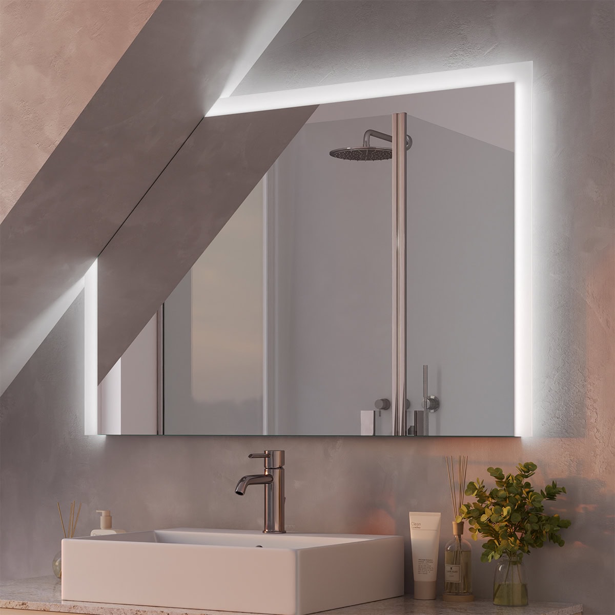 Der Badspiegel Noemi C ist die maßgeschneiderte Antwort auf die anspruchsvolle Geometrie von Badezimmern mit Dachschräge. Anstatt einen Kompromiss einzugehen, integriert sich dieser Spiegel millimetergenau in Ihr Raumkonzept und nutzt jeden Winkel optimal aus. Gefertigt aus 5mm starkem Kristallspiegelglas, garantiert er eine brillante, verzerrungsfreie Reflexion, während die sorgfältig geschliffenen und veredelten Kanten von höchster Verarbeitungsqualität zeugen. Das Herzstück ist die durchdachte LED-Lichtführung: Drei satinierte Leuchtfelder an der linken, oberen und rechten Seite rahmen Ihr Spiegelbild mit einem schattenfreien und für die Kosmetik optimierten Licht. Die innovative Technik erhellt die 4cm breiten Felder indirekt, was für eine besonders sanfte, blendfreie Aura im gesamten Raum sorgt. Im ausgeschalteten Zustand präsentieren sich die Leuchtfelder in einer dezenten Milchglas-Optik, die sich harmonisch in das Gesamtbild einfügt und das puristische Design unterstreicht.