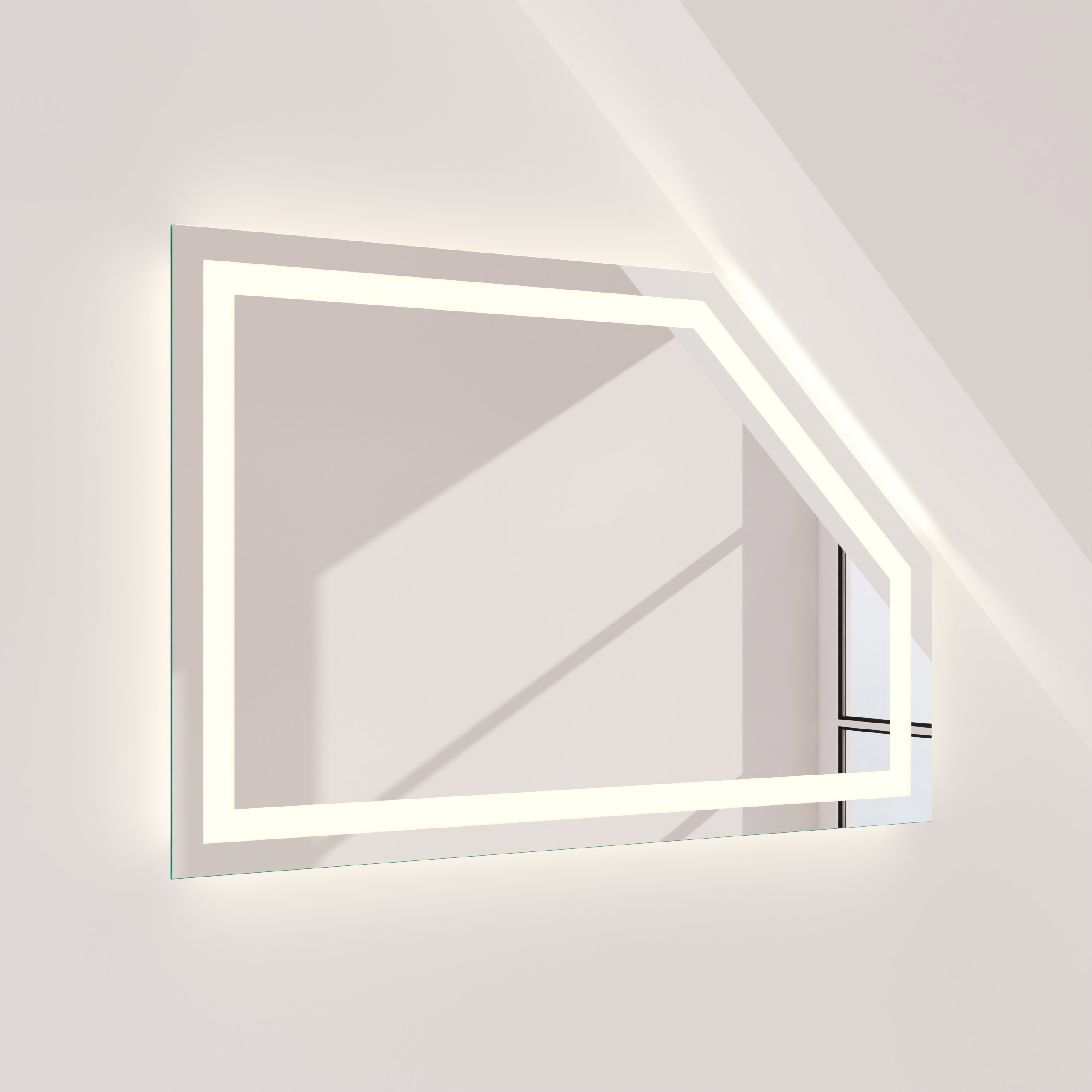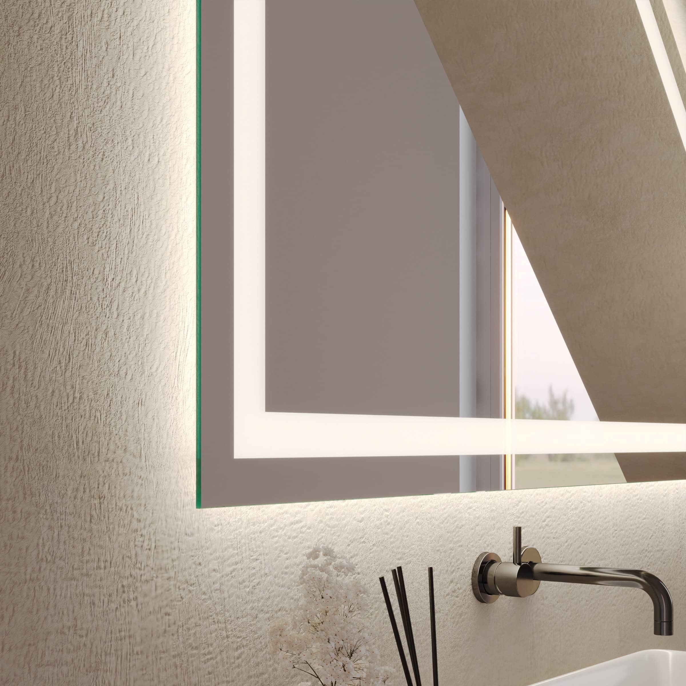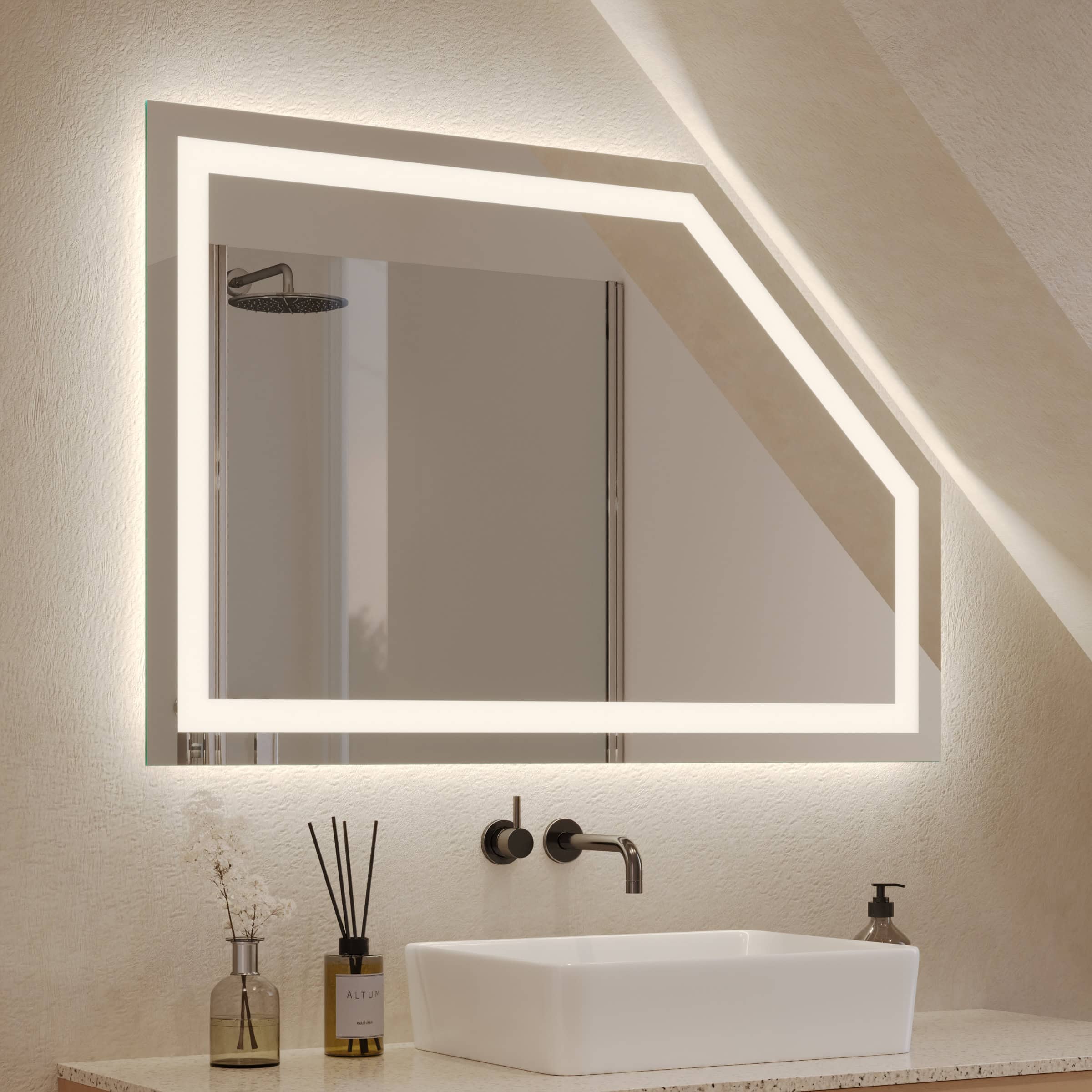 Der Badspiegel Noera wurde speziell konzipiert, um architektonische Herausforderungen elegant zu meistern. Dank der individuellen Maßanfertigung fügt sich dieser Spiegel für die Dachschräge millimetergenau in Ihr Bad ein und schafft ein harmonisches, aufgeräumtes Gesamtbild. Das umlaufende LED-Lichtband, dessen Lichtstärke speziell für die kosmetische Anwendung optimiert ist, sorgt für eine schattenfreie und natürliche Ausleuchtung Ihres Gesichts. Die 4 cm breiten Leuchtfelder werden indirekt erhellt und erzeugen ein sanftes, diffuses Licht, das den Raum in eine Wohlfühlatmosphäre taucht. Gefertigt aus 5 mm starkem Kristallspiegel mit sorgfältig geschliffenen und veredelten Kanten, verspricht der Spiegel nicht nur eine brillante Reflexion, sondern auch höchste Qualität und Langlebigkeit. Im ausgeschalteten Zustand präsentieren sich die satinierten Glasflächen in einer dezenten Milchglas-Optik, die das puristische Design unterstreicht.