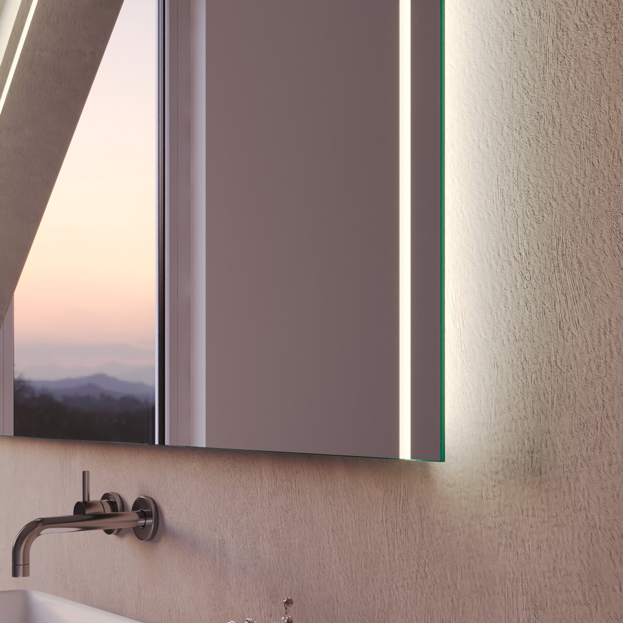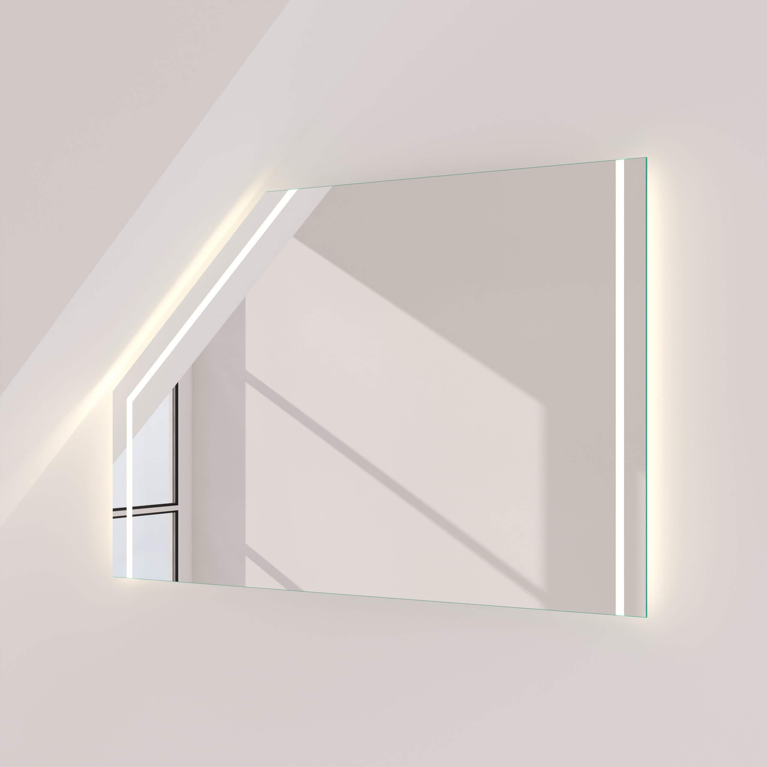 Der Badspiegel Viela wurde speziell für Räume mit Dachschrägen konzipiert und fügt sich als präzise Maßanfertigung nahtlos und harmonisch in Ihre individuelle Architektur ein. Gefertigt aus 5mm starkem Kristallspiegelglas, dessen Kanten sorgfältig geschliffen und veredelt sind, zeugt jedes Detail von höchstem Qualitätsanspruch. Die beidseitig links und rechts positionierte LED-Beleuchtung ist gezielt für die kosmetische Anwendung optimiert und garantiert eine schattenfreie, natürliche Ausleuchtung Ihres Gesichts. Das Licht tritt dabei sanft durch satinierte Leuchtfelder aus, die im ausgeschalteten Zustand dezent wie Milchglas wirken und eingeschaltet eine weiche, blendfreie Helligkeit verbreiten. So entsteht nicht nur ein funktional überlegener Ort für die tägliche Pflege, sondern auch ein Ambiente von Ruhe und Eleganz.