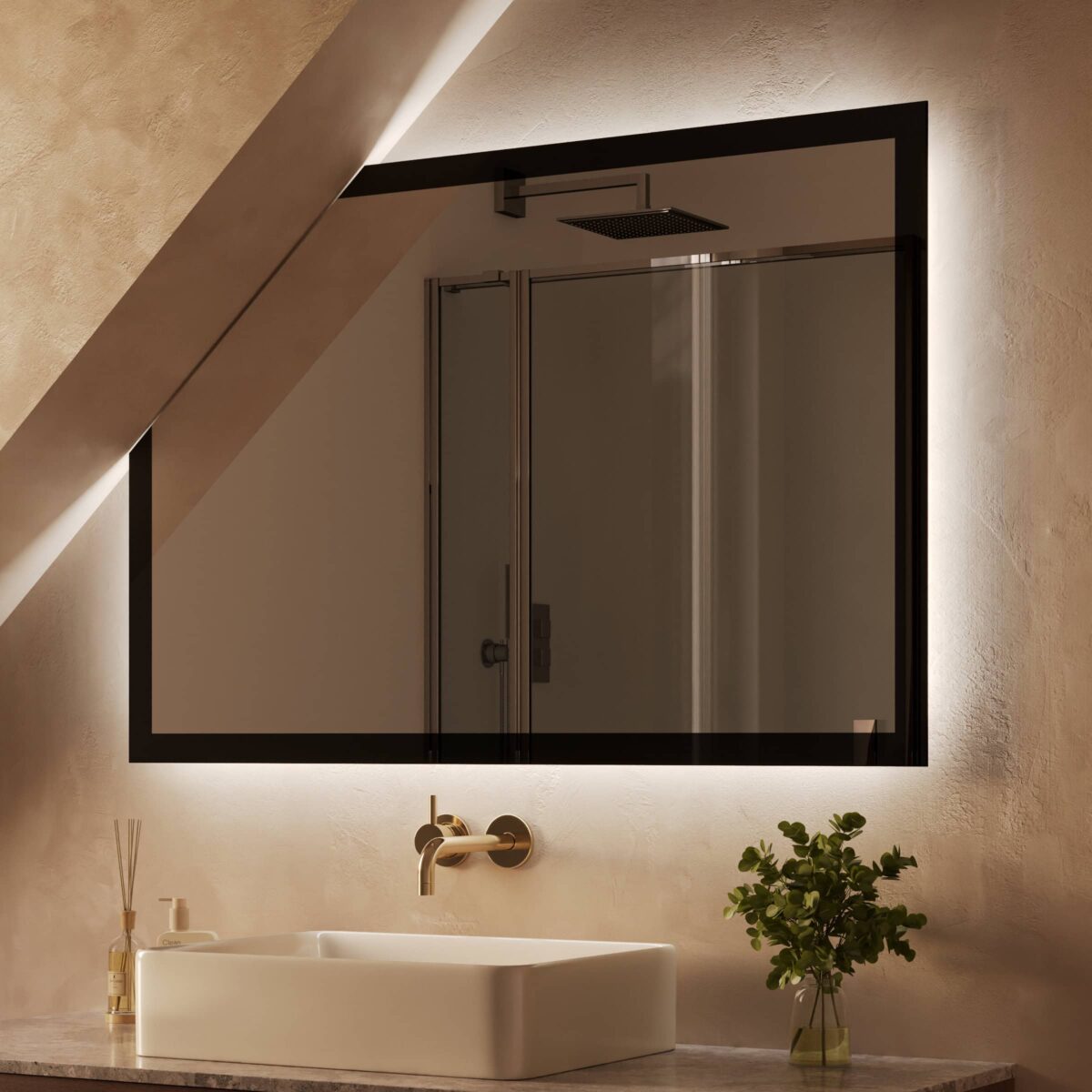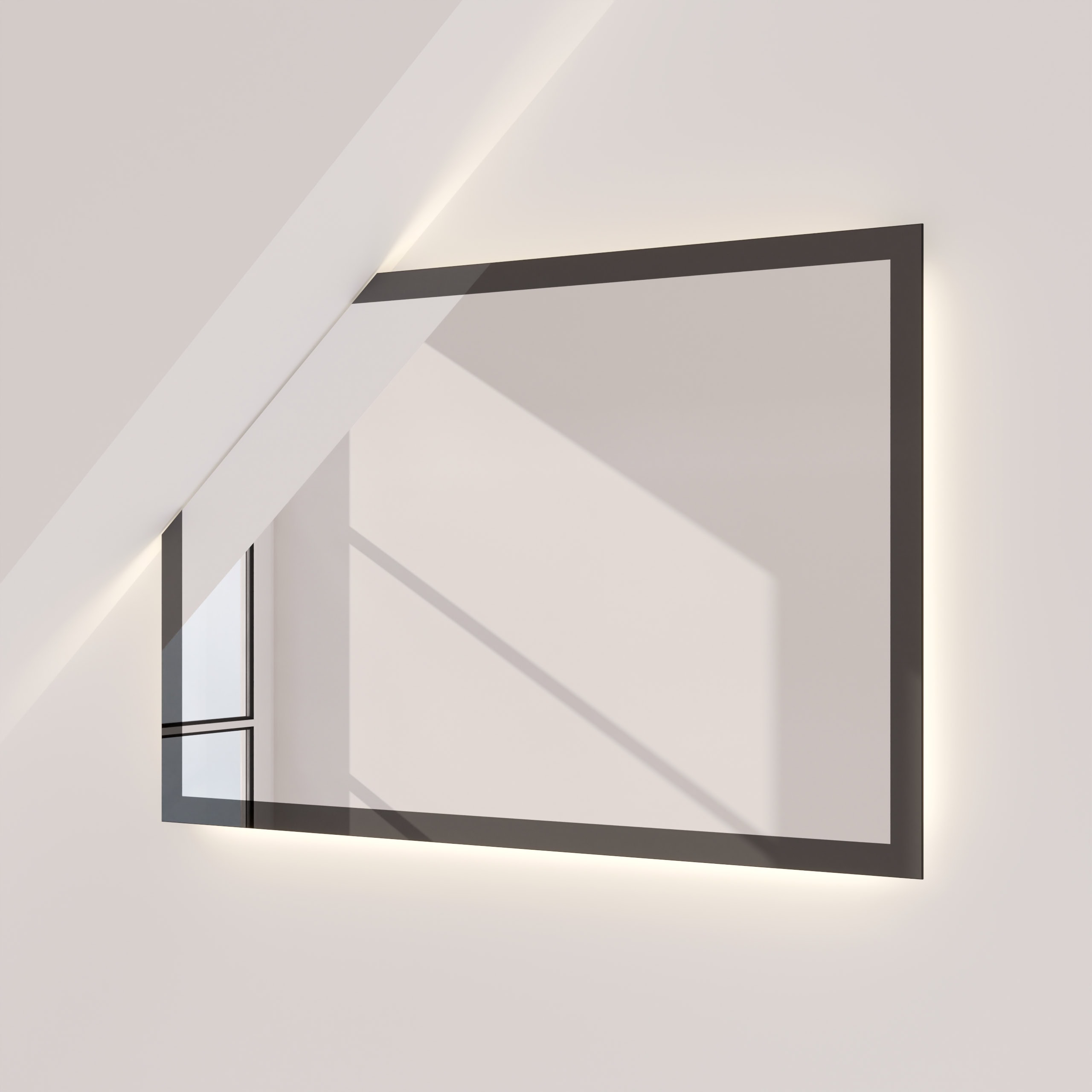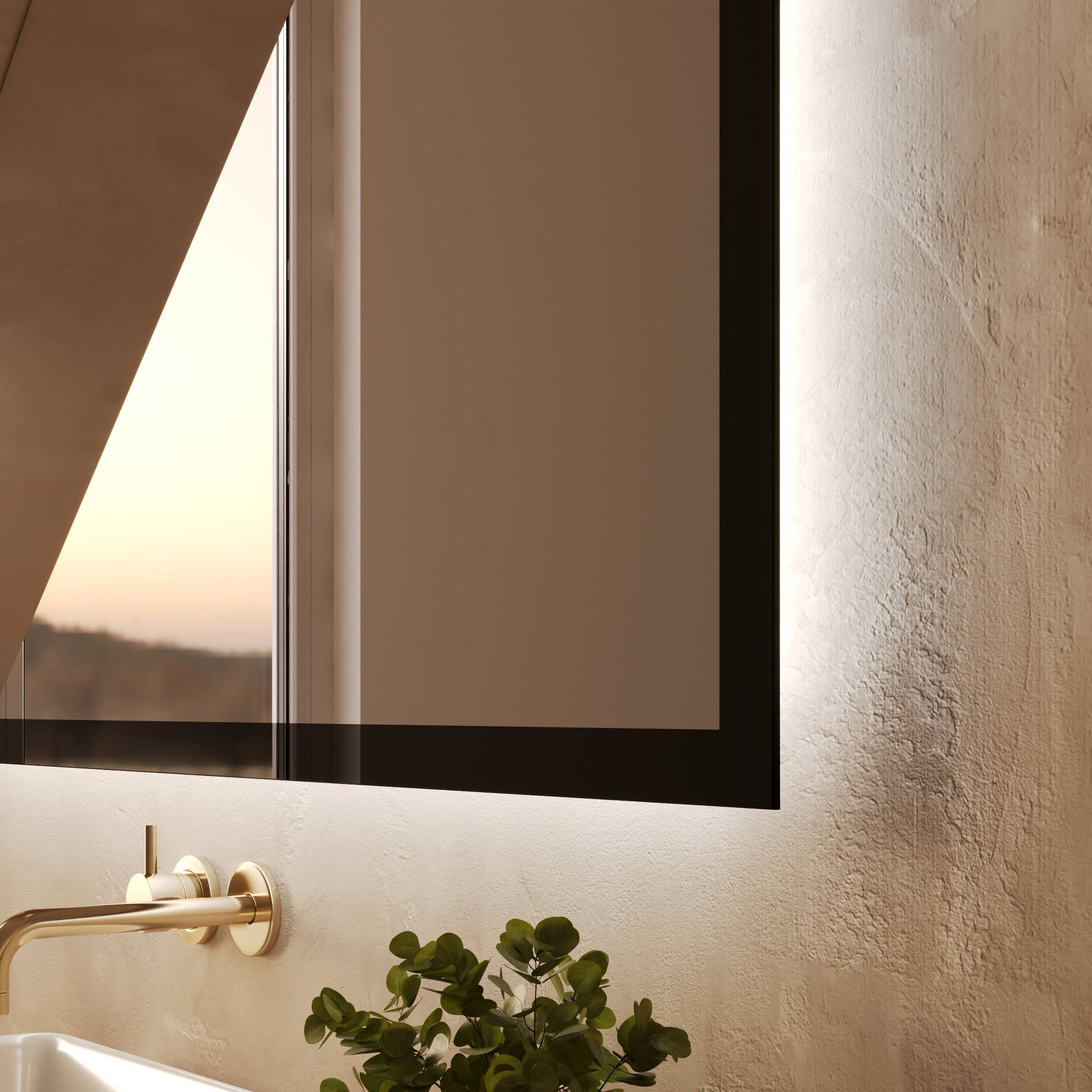 Der Badspiegel Aurea C wird als individuelle Maßanfertigung millimetergenau für Ihre Dachschräge gefertigt und integriert sich so nahtlos in jedes anspruchsvolle Raumkonzept. Sein markanter, 40 mm breiter Rahmen aus tiefschwarzem Glas setzt einen puristischen Akzent und verleiht dem Spiegel eine außergewöhnliche, edle Tiefe. Die umlaufend integrierte LED-Beleuchtung wurde speziell für kosmetische Anwendungen optimiert und sorgt für eine schattenfreie, schmeichelhafte Ausleuchtung. Gleichzeitig erzeugt die sanfte Hintergrundbeleuchtung eine schwebende Optik und taucht Ihr Bad in ein atmosphärisches, indirektes Licht. Gefertigt aus 5 mm starkem Kristallspiegel mit präzise geschliffenen und veredelten Kanten, garantiert dieser Spiegel für die Dachschräge nicht nur eine brillante, unverfälschte Reflexion, sondern auch beständige Qualität und Wertigkeit.