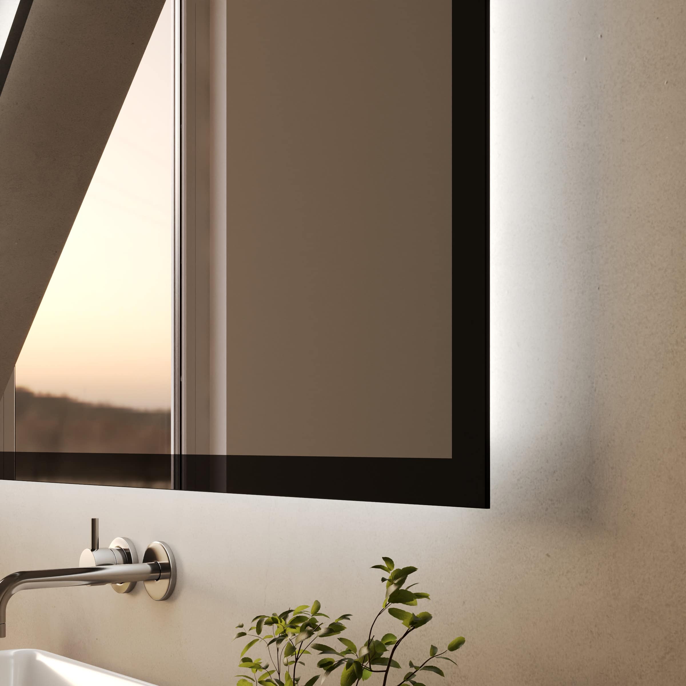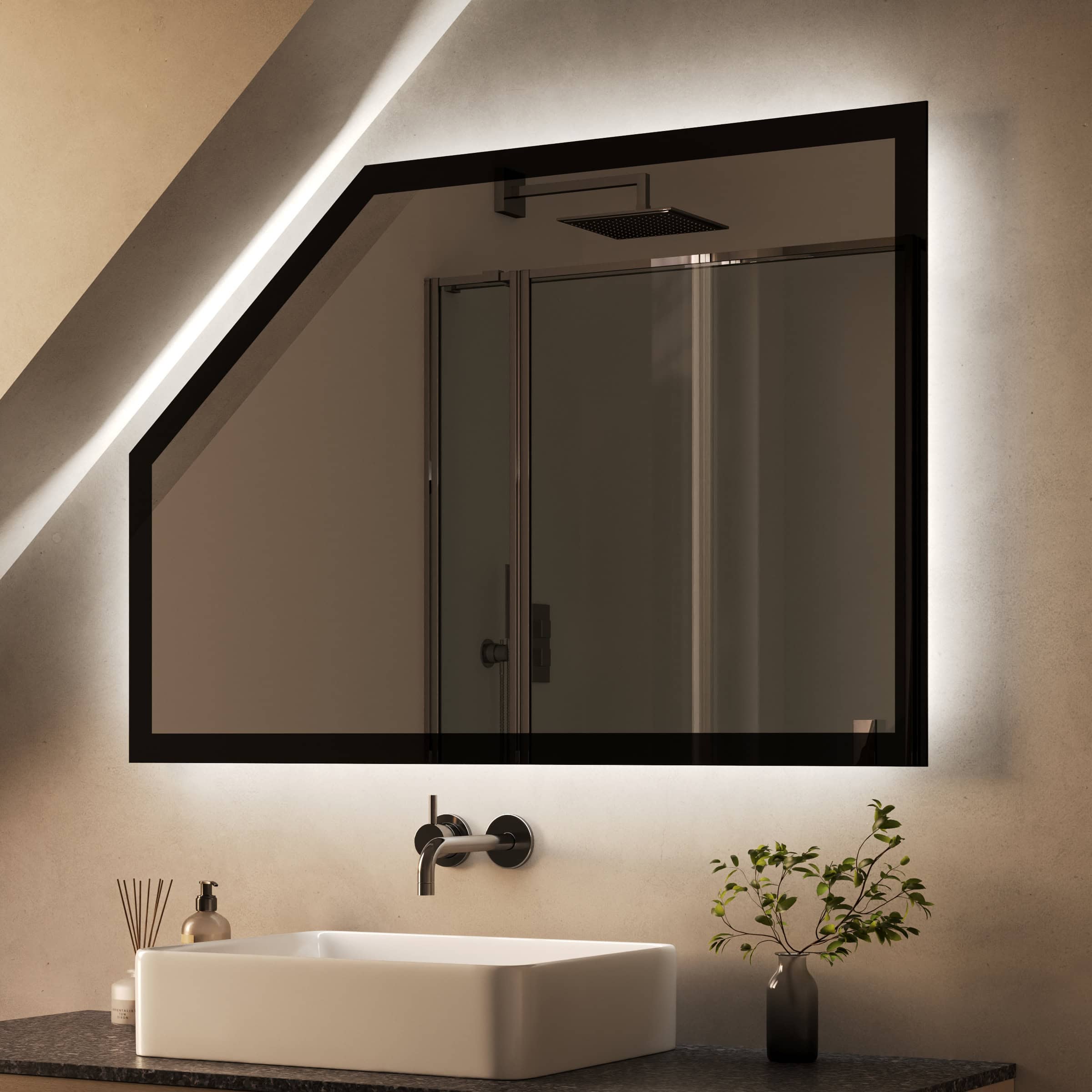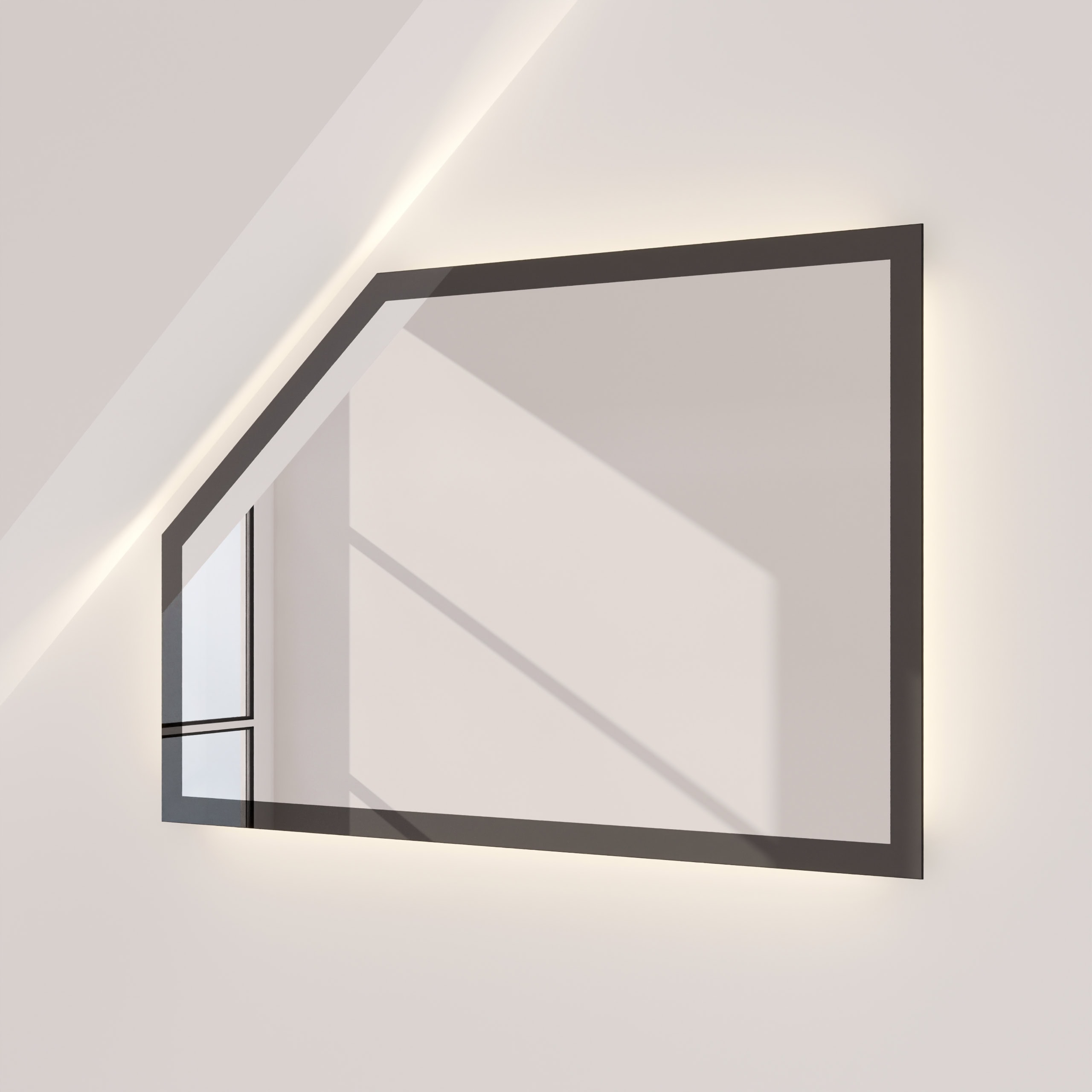 Der Badspiegel Aurea wurde gezielt für die Herausforderungen von Dachschrägen konzipiert und fügt sich als maßgefertigtes Einzelstück nahtlos in Ihr Badezimmer ein. Sein markanter, 40 mm breiter Rahmen aus tiefschwarzem Glas verleiht dem Spiegel eine klare Kontur und setzt einen zeitlos eleganten Akzent. Die umlaufende LED-Hintergrundbeleuchtung schafft eine subtile Aura und lässt den Spiegel optisch vor der Wand schweben, was Ihrem Raum eine besondere Tiefe verleiht. Das Licht ist dabei perfekt für die tägliche Kosmetik optimiert und umgibt Sie mit einer schattenfreien, homogenen Ausleuchtung. Gefertigt aus 5 mm starkem Kristallspiegel mit sorgfältig geschliffenen und veredelten Kanten, garantiert dieser Spiegel nicht nur eine brillante und unverfälschte Reflexion, sondern auch höchste Qualität und Sicherheit für Ihr anspruchsvolles Badambiente.