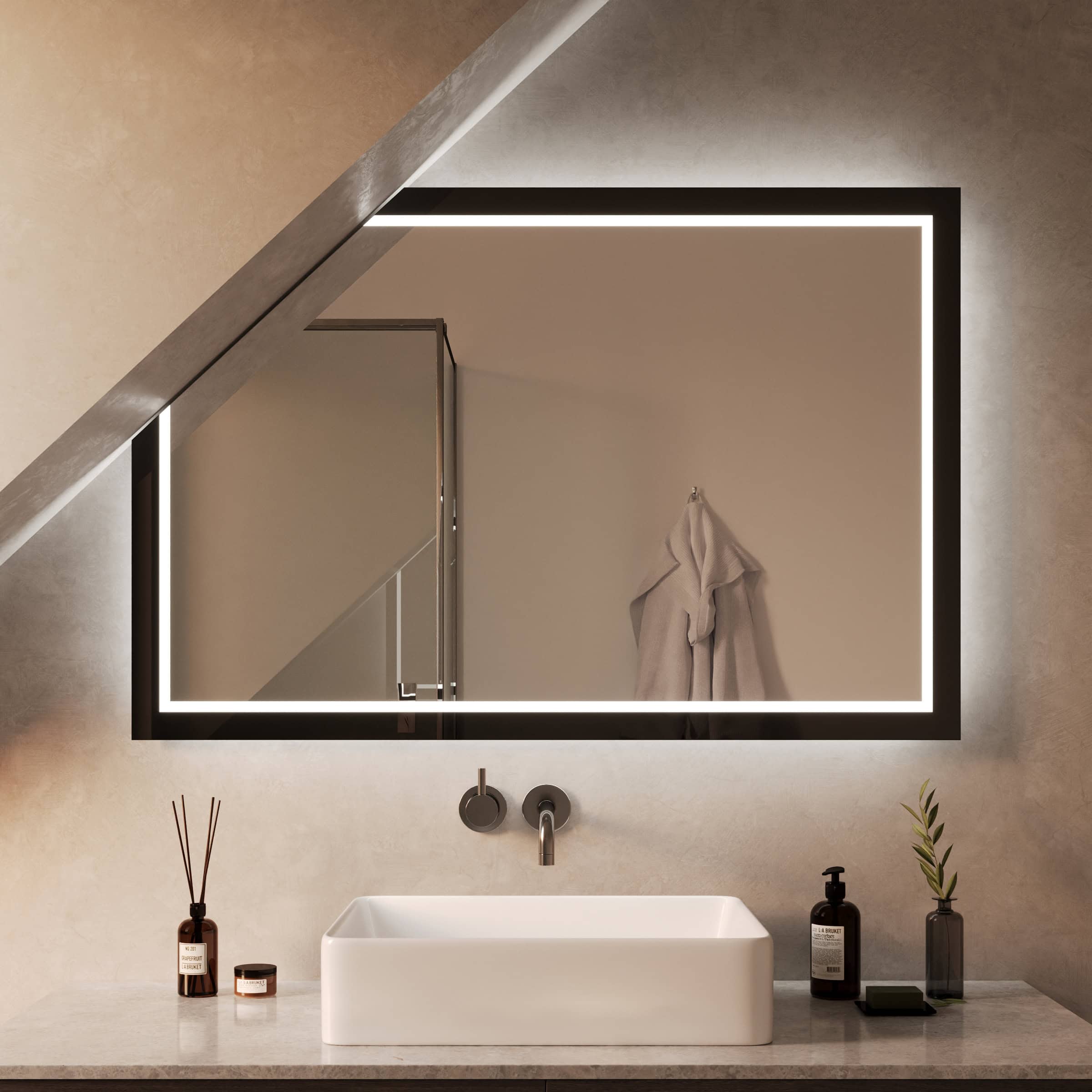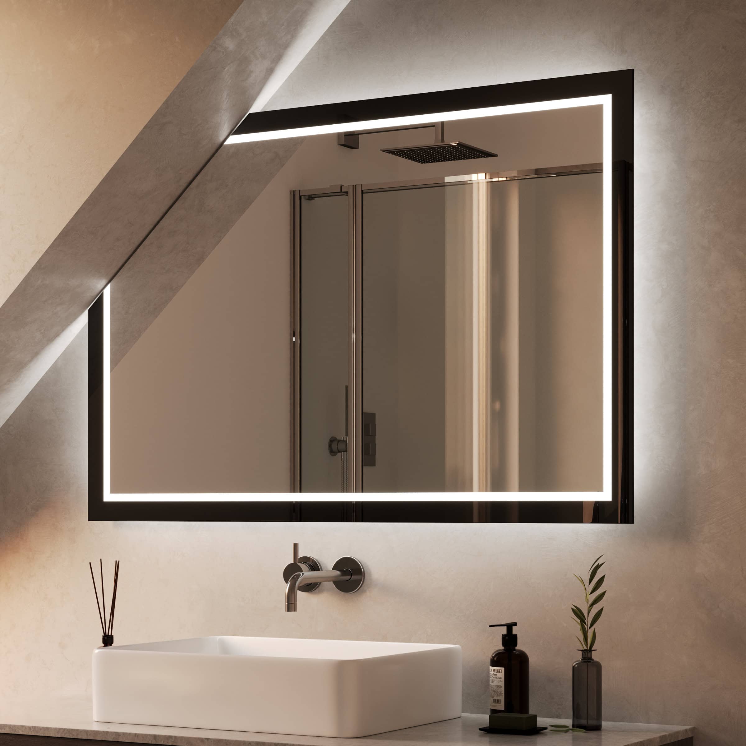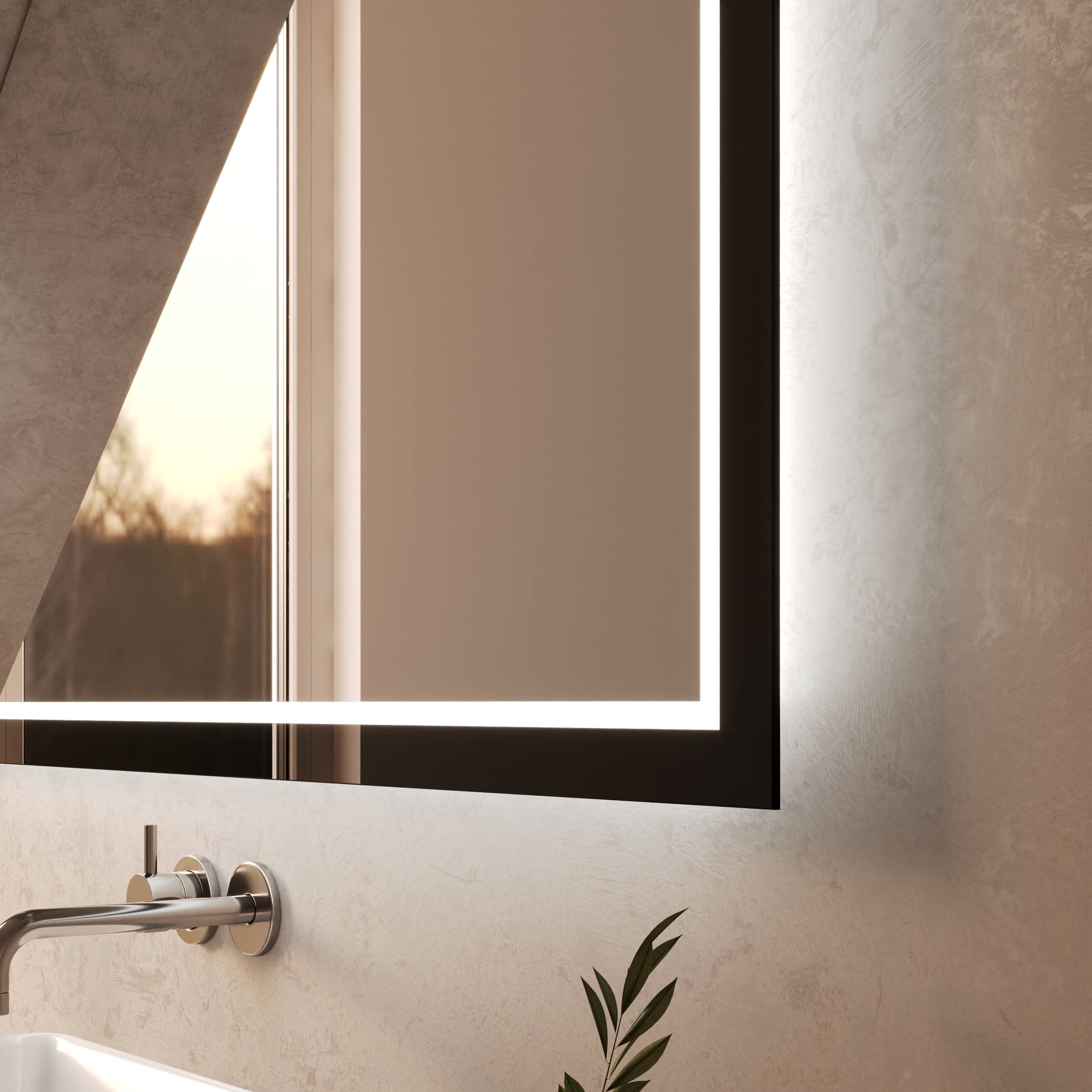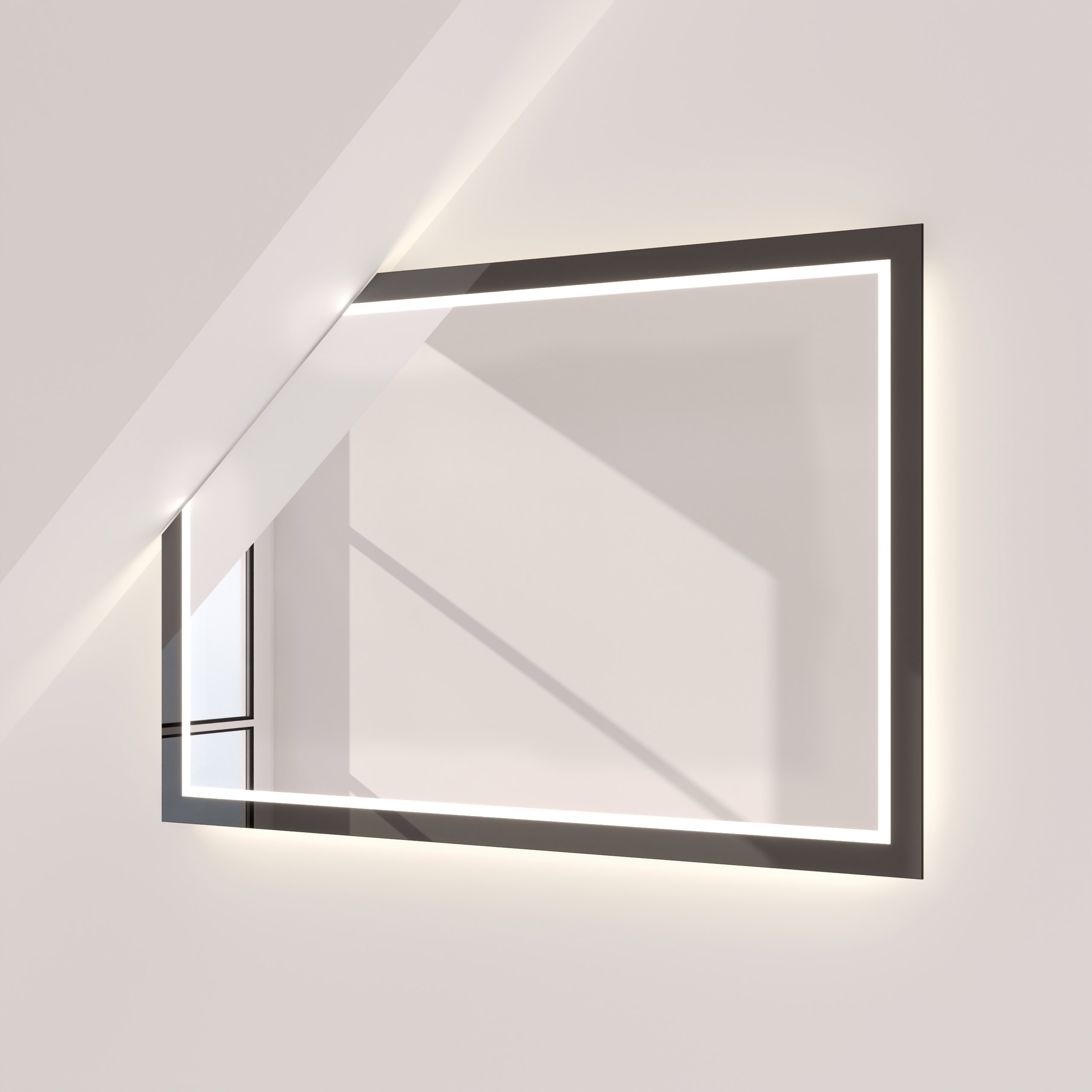 Der Badspiegel Siena C wurde speziell für anspruchsvolle Raumsituationen wie Bäder mit Dachschrägen konzipiert. Als individuelle Maßanfertigung fügt er sich millimetergenau in Ihre Architektur ein und schafft eine harmonische Einheit, wo Standardlösungen versagen. Der markante, 40 mm breite Rahmen aus tiefschwarzem Glas verleiht dem Spiegel eine klare Kontur und einen Hauch von moderner Raffinesse. Gefertigt aus 5 mm starkem Kristallspiegel mit sorgfältig geschliffenen und veredelten Kanten, garantiert er eine brillante, verzerrungsfreie Reflexion. Die umlaufende LED-Beleuchtung ist das Herzstück des Designs: Sie erhellt indirekt die satinierten Leuchtfelder und taucht Ihr Gesicht sowie den Raum in ein weiches, schattenfreies Licht – perfekt optimiert für die tägliche Kosmetik. Im ausgeschalteten Zustand präsentieren sich die Leuchtfelder in einer dezenten Milchglas-Optik, die das minimalistische Gesamtbild unterstreicht.