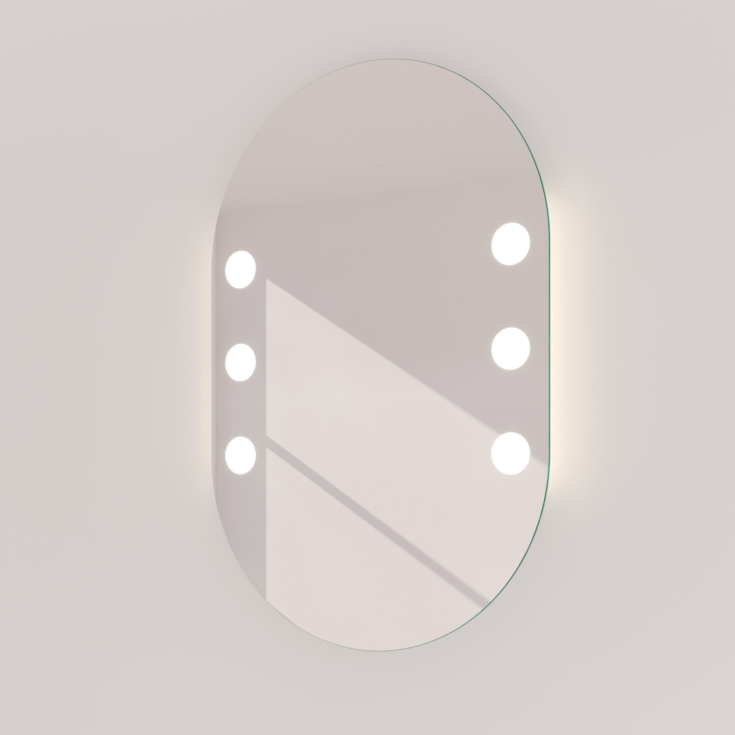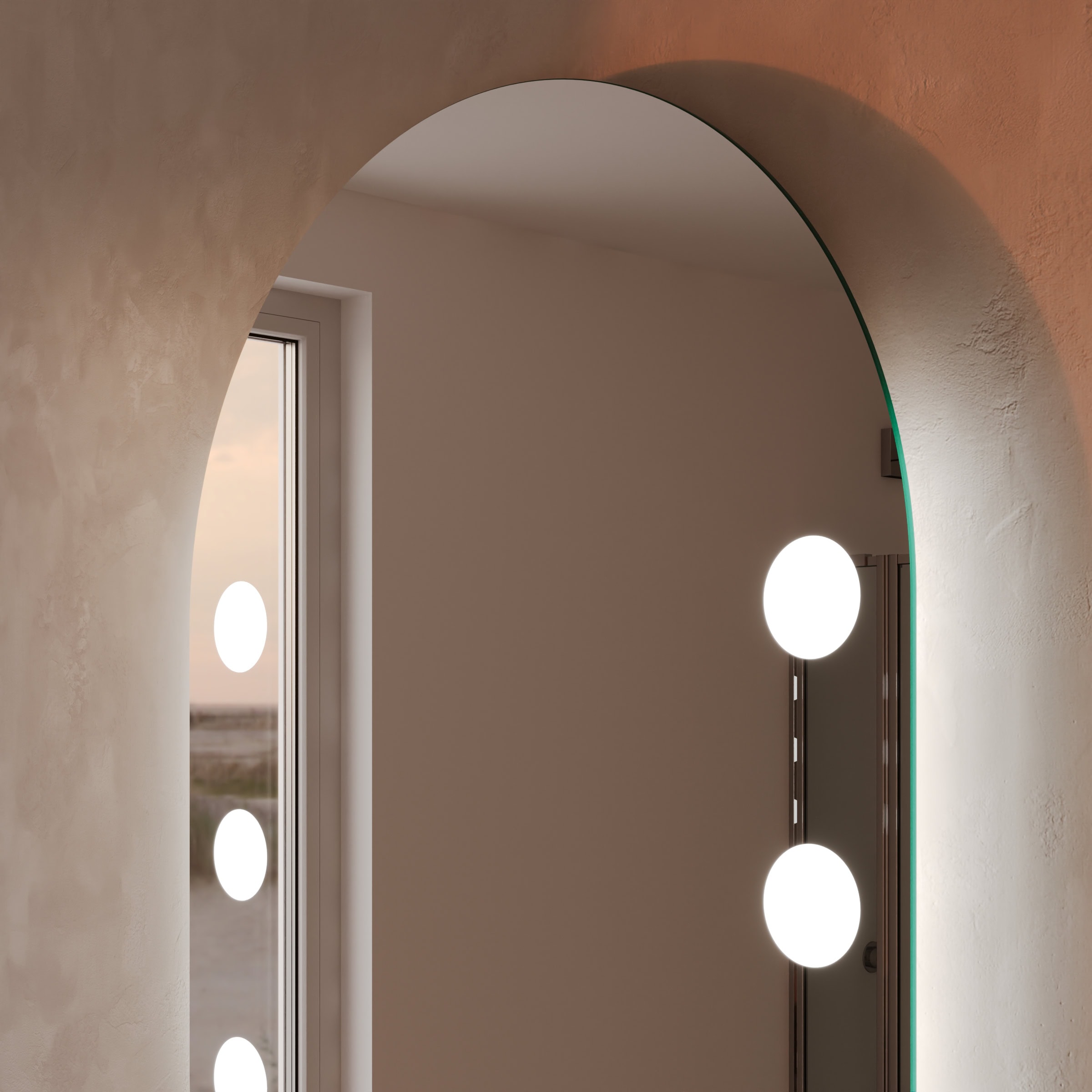 Als individuelle Maßanfertigung fügt sich dieser geschwungene Badspiegel nahtlos in Ihr Raumkonzept ein und wird zum Herzstück anspruchsvoller Badgestaltung. Gefertigt aus 5mm starkem Kristallspiegel, garantiert er eine brillante, unverfälschte Reflexion und beständige Wertigkeit, unterstrichen durch präzise geschliffene und veredelte Glaskanten. Die seitlich positionierte LED-Beleuchtung im Hollywood-Stil ist speziell für kosmetische Anwendungen optimiert. Die indirekt erhellten Leuchtfelder tauchen Ihr Gesicht in ein schattenfreies, schmeichelhaftes Licht, das professionellen Ansprüchen genügt und gleichzeitig eine warme, blendfreie Atmosphäre im Raum schafft. Die sanft abgerundete Form bricht mit strengen Linien und verleiht Ihrem Badezimmer eine organische, fließende Dynamik – ein Designobjekt, das Funktionalität und skulpturale Ästhetik in Perfektion vereint.