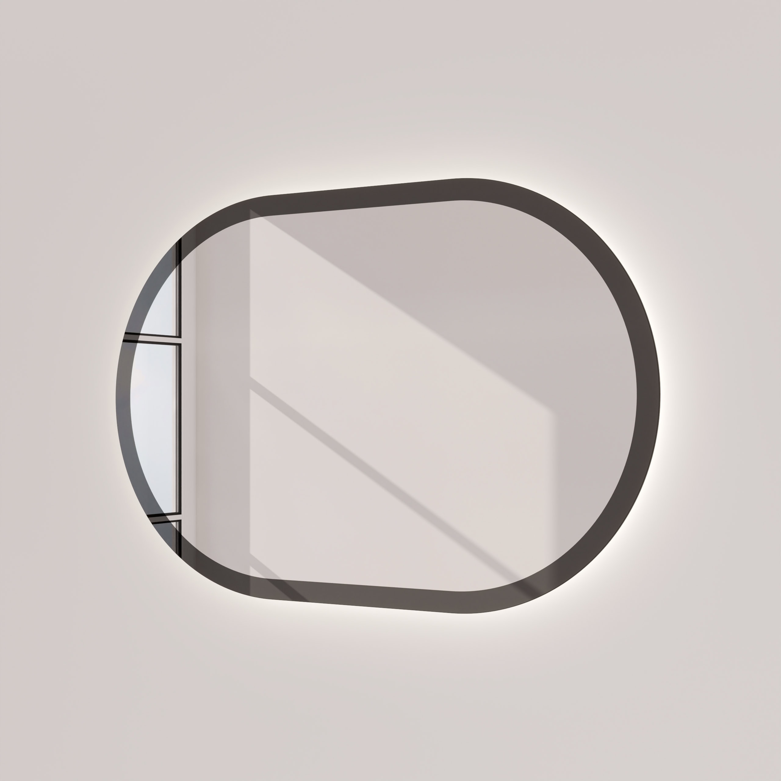 Der Badspiegel Aurea definiert Eleganz durch seine sanft geschwungene Silhouette, die eine harmonische Ruhe in Ihr Raumambiente bringt. Das brillante, 5 mm starke Kristallspiegelglas wird von einem markanten Rahmen aus tiefschwarzem Glas präzise eingefasst. Dieser Kontrast verleiht dem Spiegel eine außergewöhnliche visuelle Tiefe. Das Herzstück ist die umlaufende LED-Beleuchtung, die als sanfte Hintergrundbeleuchtung dient. Sie lässt den Spiegel optisch vor der Wand schweben und erzeugt eine blendfreie, atmosphärische Aura. Die Lichtstärke ist dabei gezielt für die kosmetische Anwendung optimiert und sichert eine schattenfreie, klare Ausleuchtung für Ihre tägliche Pflegeroutine. Als individuelle Maßanfertigung fügt sich dieser geschwungene Badspiegel mit Beleuchtung perfekt in Ihr persönliches Raumkonzept ein und wird zum Ausdruck Ihres anspruchsvollen Stils.