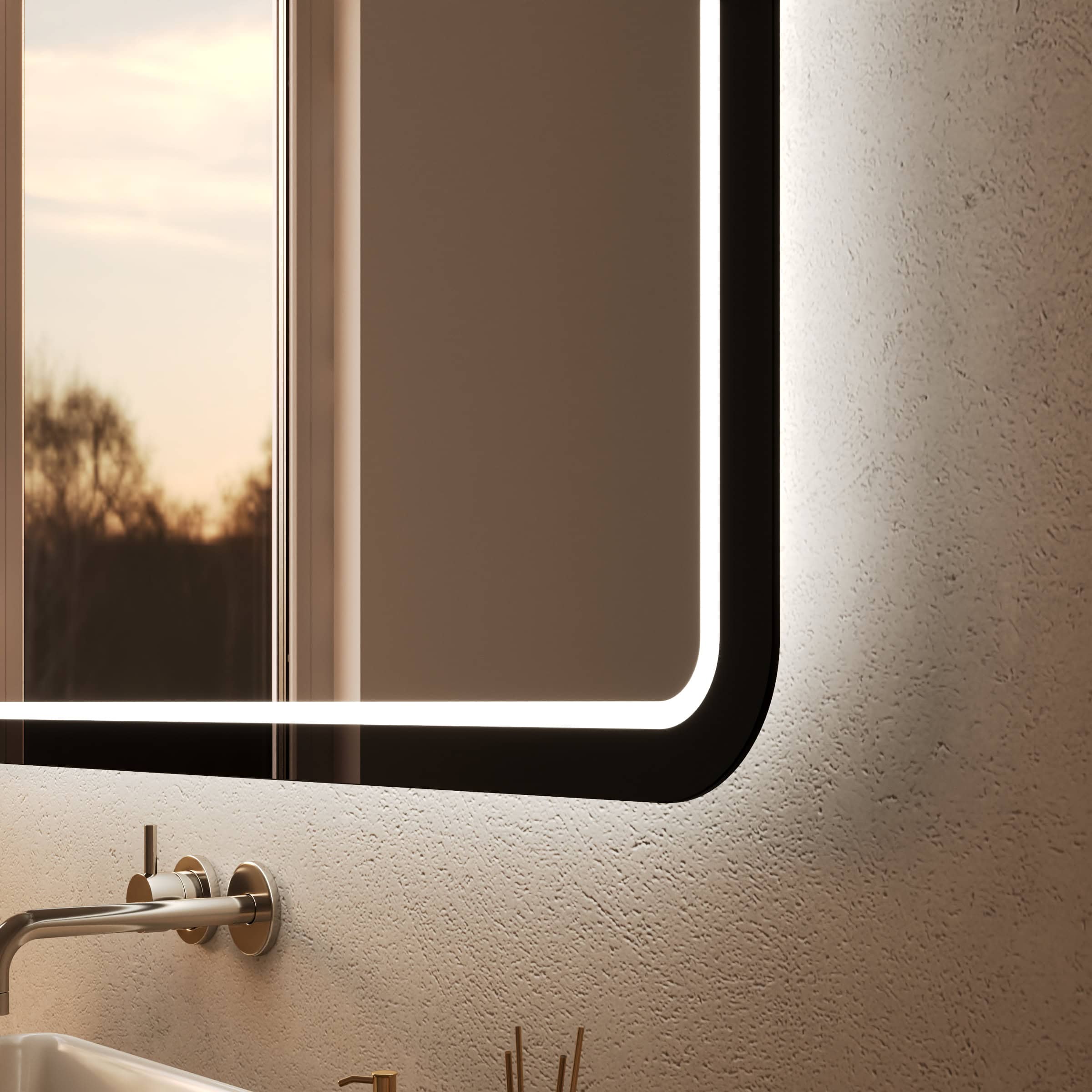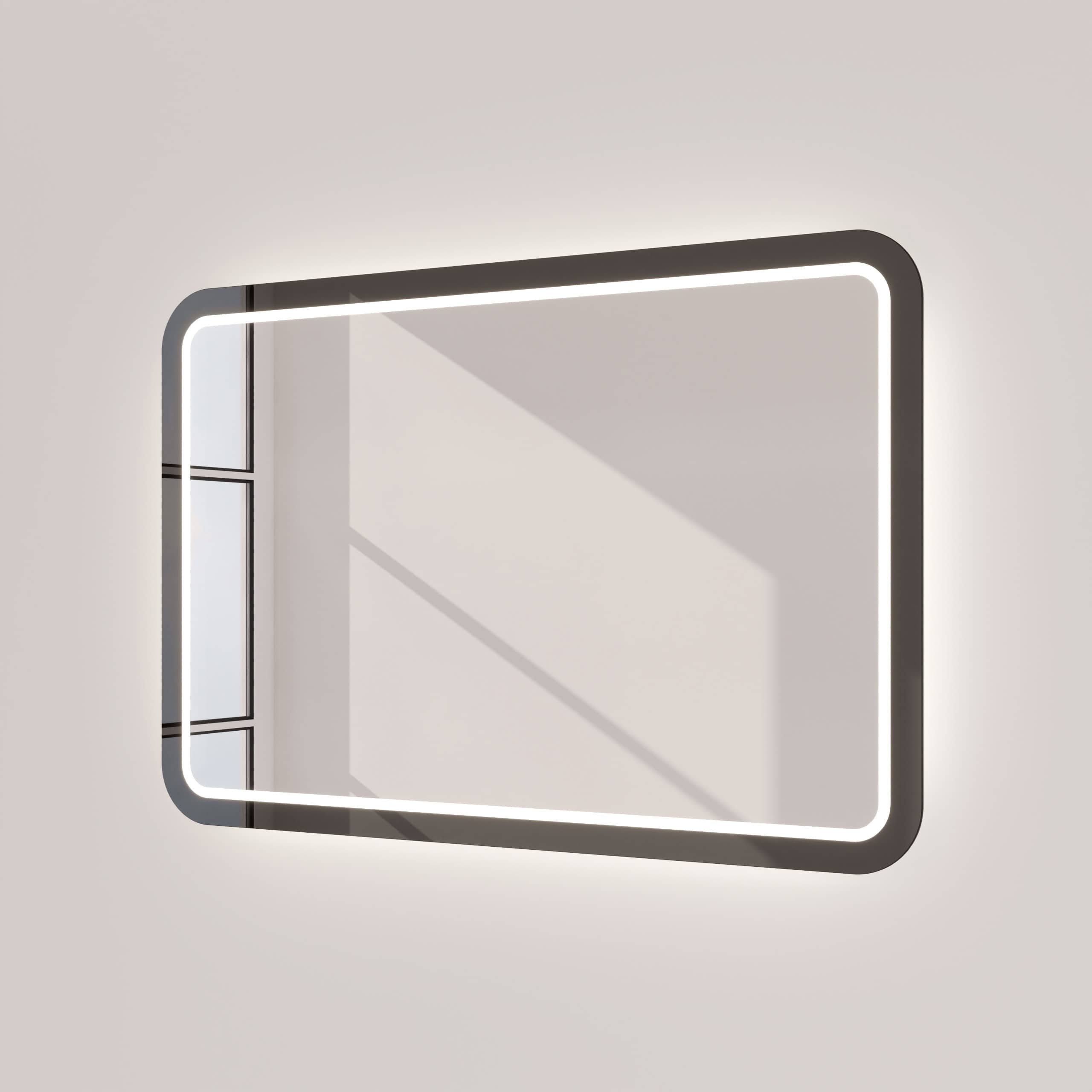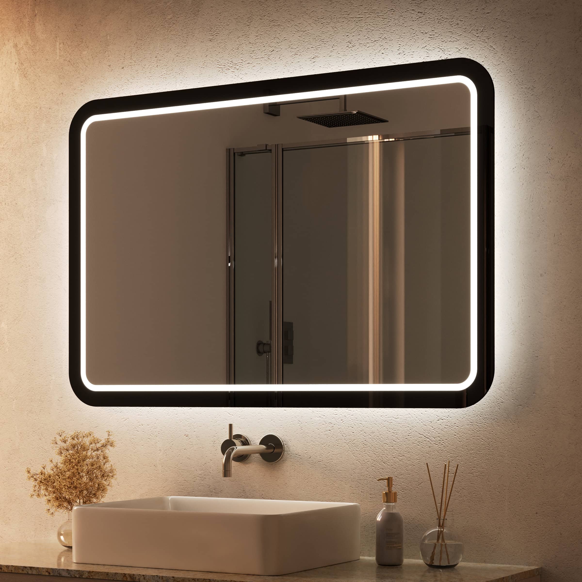 Der Badspiegel Siena ist mehr als nur eine Reflexionsfläche – er ist ein zentrales Gestaltungselement für anspruchsvolle Bäder. Seine sanft abgerundeten Ecken verleihen ihm eine weiche, organische Anmutung, die in elegantem Kontrast zum markanten Rahmen aus tiefschwarzem Glas steht. Gefertigt aus 5mm starkem Kristallspiegelglas, garantiert er ein brillantes und unverfälschtes Spiegelbild. Die rundherum laufende LED-Beleuchtung wurde speziell für die kosmetische Anwendung optimiert und leuchtet Ihr Gesicht schattenfrei und authentisch aus. Das Licht tritt dabei indirekt durch fein satinierte Leuchtfelder aus, die im ausgeschalteten Zustand wie edles Milchglas wirken und eingeschaltet ein homogenes, blendfreies Ambiente schaffen. Jedes Detail, von den geschliffenen Kanten bis zur individuellen Maßanfertigung, zeugt von höchster Handwerkskunst und macht diesen Spiegel zu einer zeitlosen Investition in Ihr Wohlbefinden.