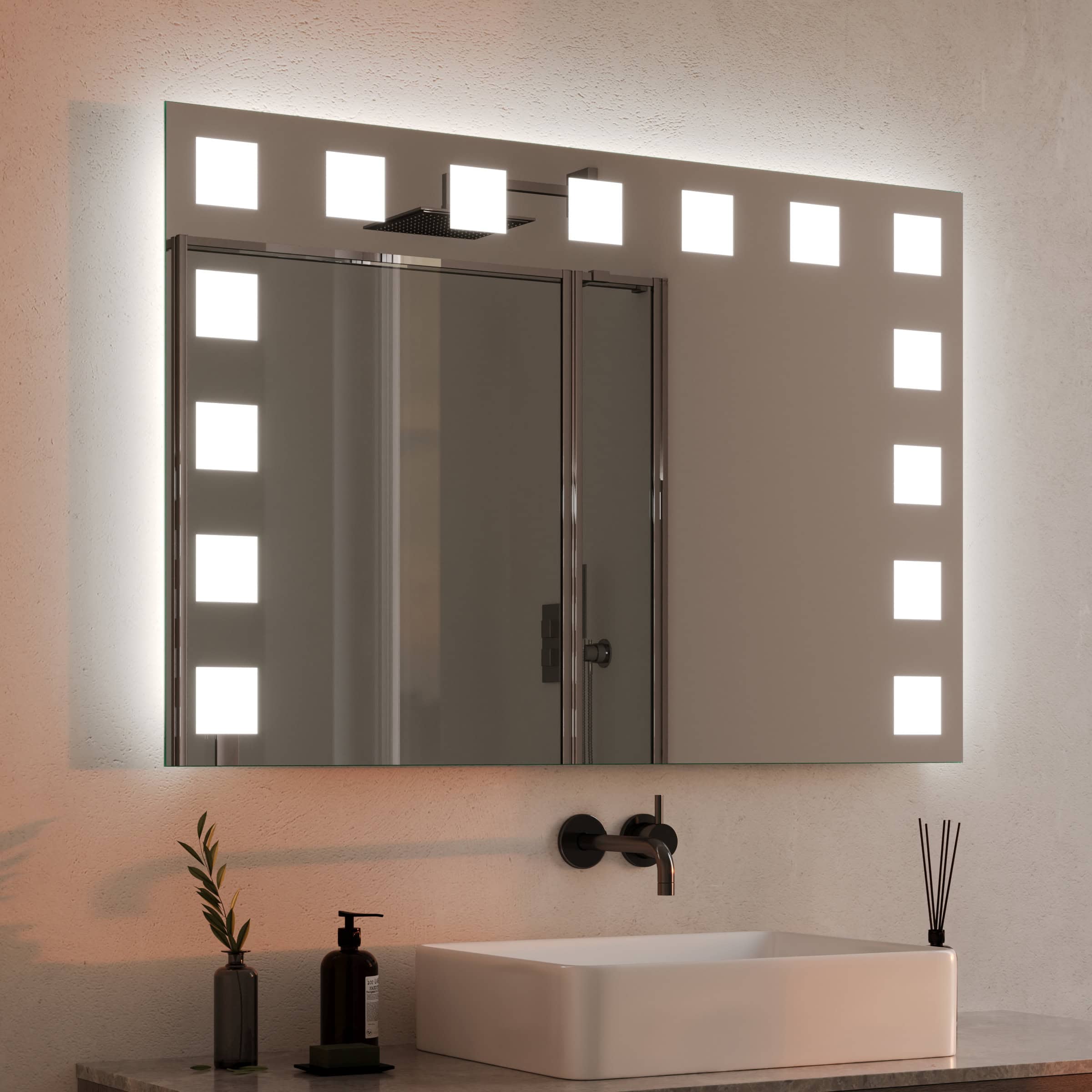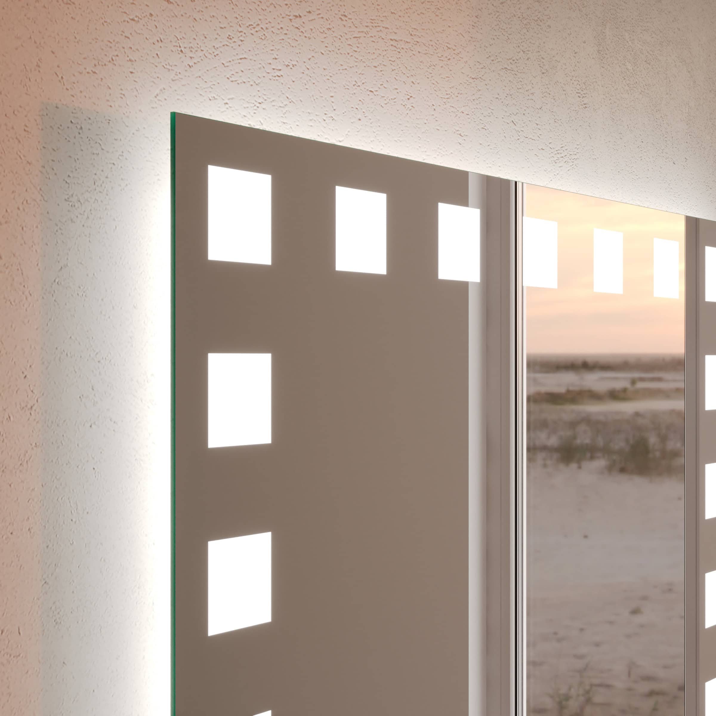Der Badspiegel Hollywood Dice schafft eine Lichtatmosphäre, die professionellen Ansprüchen gerecht wird und zugleich Ihr Ambiente veredelt. Durch die präzise Anordnung der Leuchtfelder links, oben und rechts entsteht eine gleichmäßige, schattenfreie Ausleuchtung – ideal für Ihr tägliches Kosmetik- und Pflegeritual. Die speziell für den Kosmetikeinsatz optimierte LED-Lichtstärke sorgt für farbechte und klare Verhältnisse. Dabei wird das Licht sanft und indirekt abgegeben, wodurch eine blendfreie und angenehme Atmosphäre entsteht, die Ihr Badezimmer in eine Wohlfühloase verwandelt. Gefertigt aus 5mm starkem Kristallspiegelglas, garantiert dieser Spiegel eine brillante und unverfälschte Reflexion. Die sorgfältig geschliffenen und veredelten Kanten zeugen von höchster Verarbeitungsqualität. Als individuelle Maßanfertigung passt sich dieser rechteckige LED Spiegel perfekt den Dimensionen Ihres Raumes an und wird so zum einzigartigen Designelement.