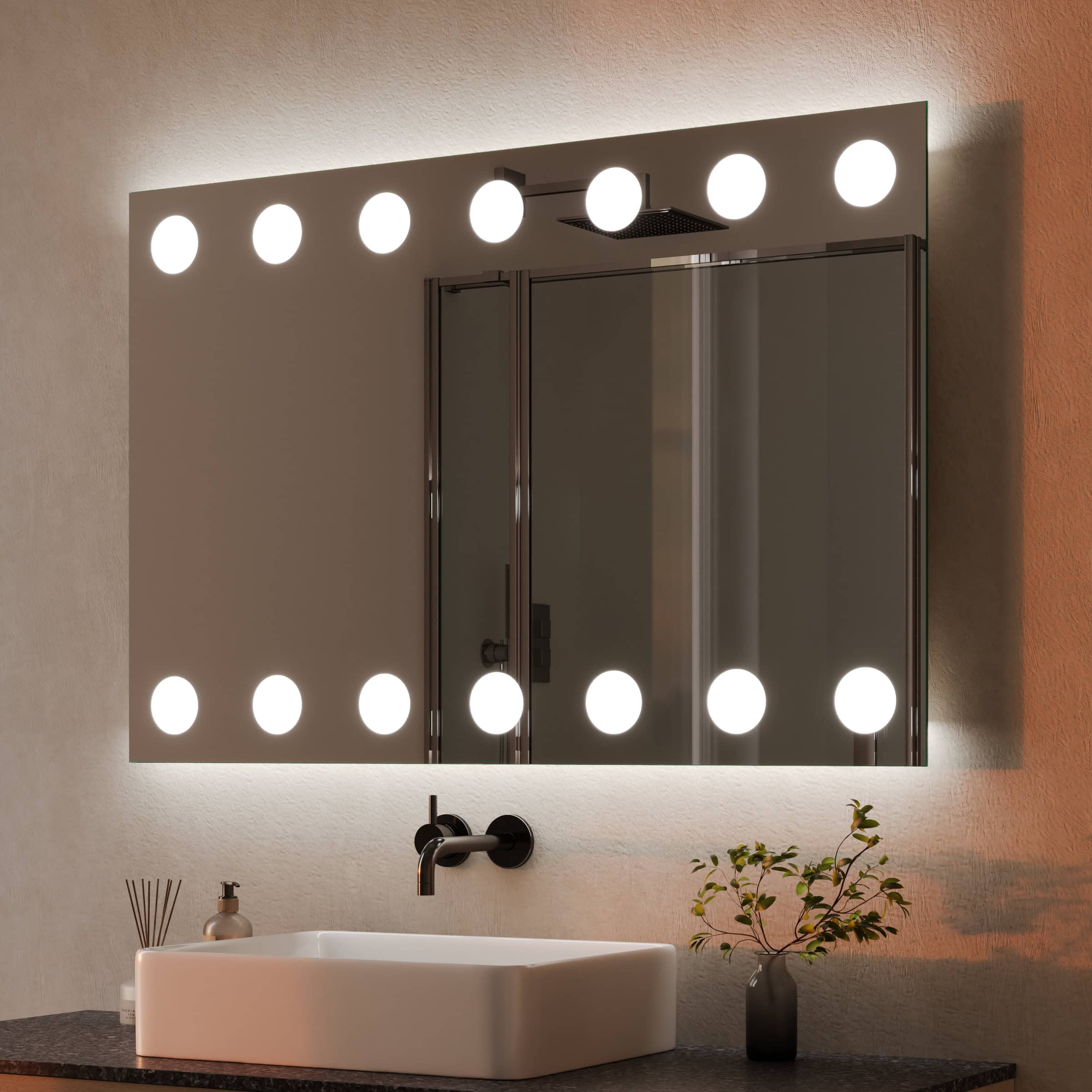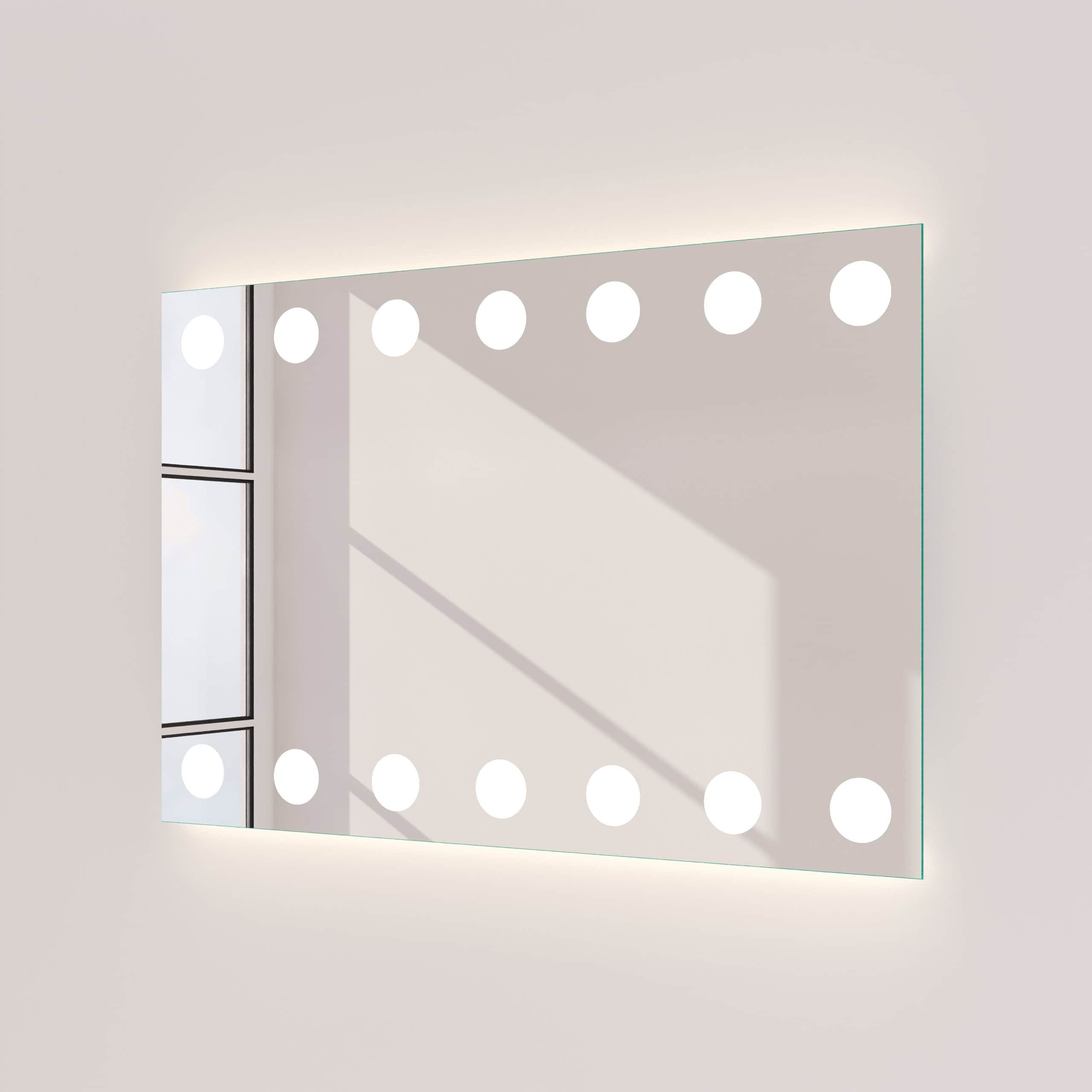 Die charakteristische Beleuchtung an der oberen und unteren Kante dieses Badspiegels ist mehr als nur eine Lichtquelle – sie ist eine Hommage an die professionelle Ausleuchtung legendärer Künstlergarderoben. Speziell für kosmetische Anwendungen optimiert, taucht das LED-Licht Ihr Gesicht in eine vollkommen gleichmäßige, schattenfreie Helligkeit. Das Ergebnis ist eine authentische und farbechte Wiedergabe, die präzises Schminken oder eine sorgfältige Rasur zu einem täglichen Ritual der Perfektion macht. Gefertigt aus 5mm starkem Kristallspiegel, garantiert dieses Meisterstück eine brillante und verzerrungsfreie Reflexion. Die sorgfältig geschliffenen und veredelten Kanten zeugen von höchster Handwerkskunst. Dank der individuellen Maßanfertigung fügt sich dieser Badspiegel mit Beleuchtung harmonisch in jedes Raumkonzept ein und wird zum exakt passenden Mittelpunkt Ihres Bades. Die Leuchtfelder werden dabei indirekt erhellt, was für ein besonders sanftes, blendfreies Ambiente sorgt und den Spiegel optisch an der Wand schweben lässt.
