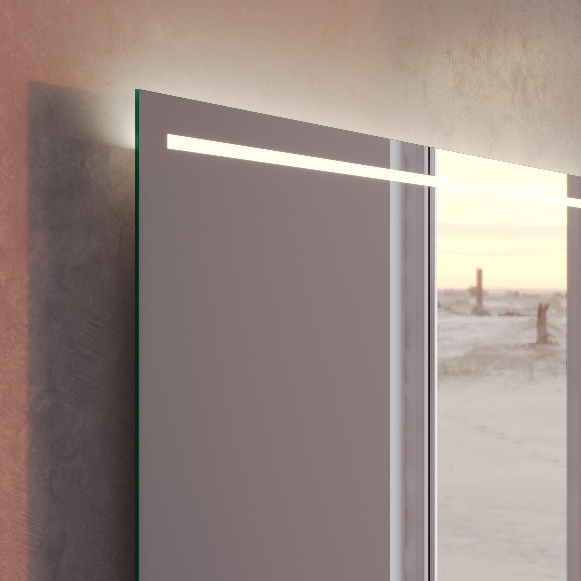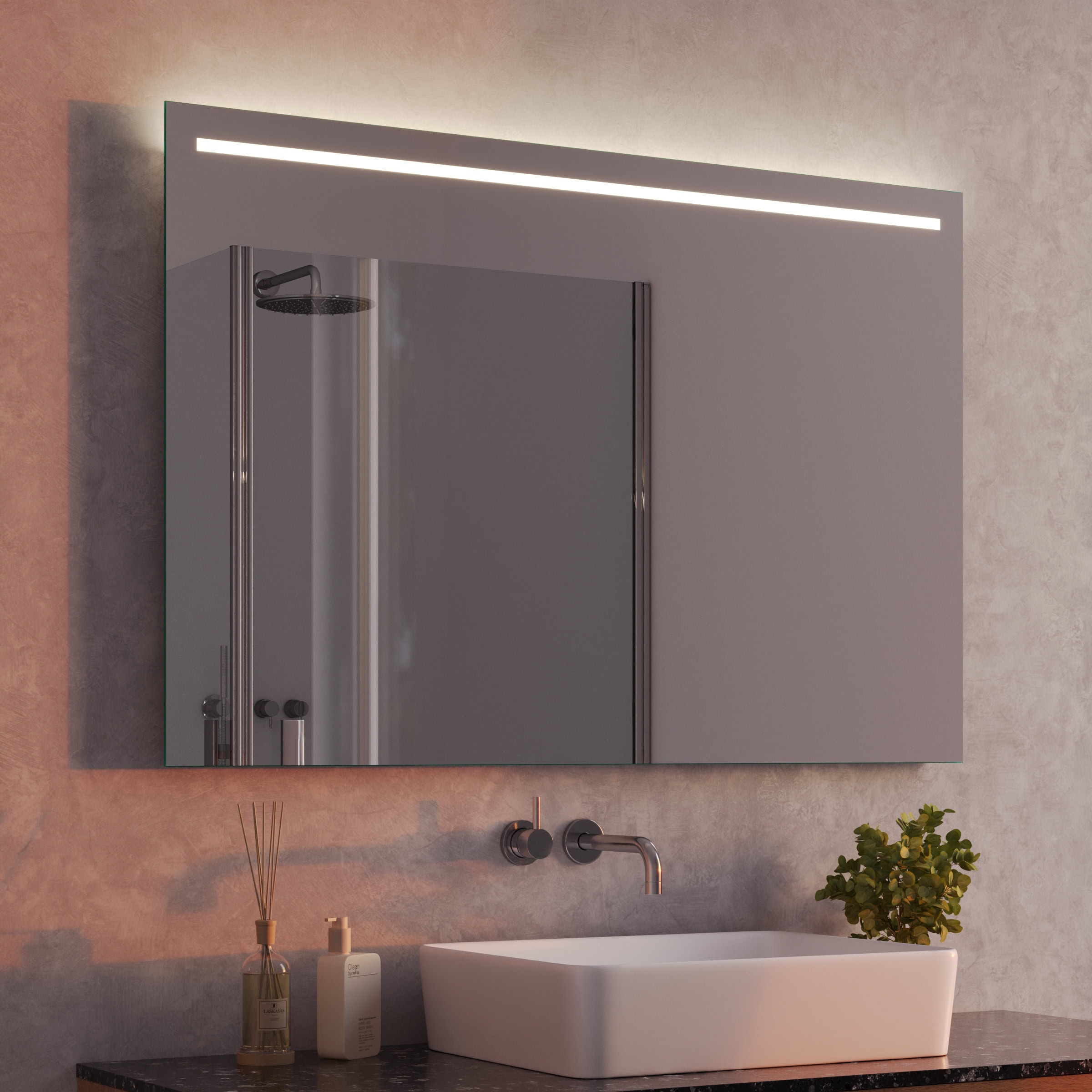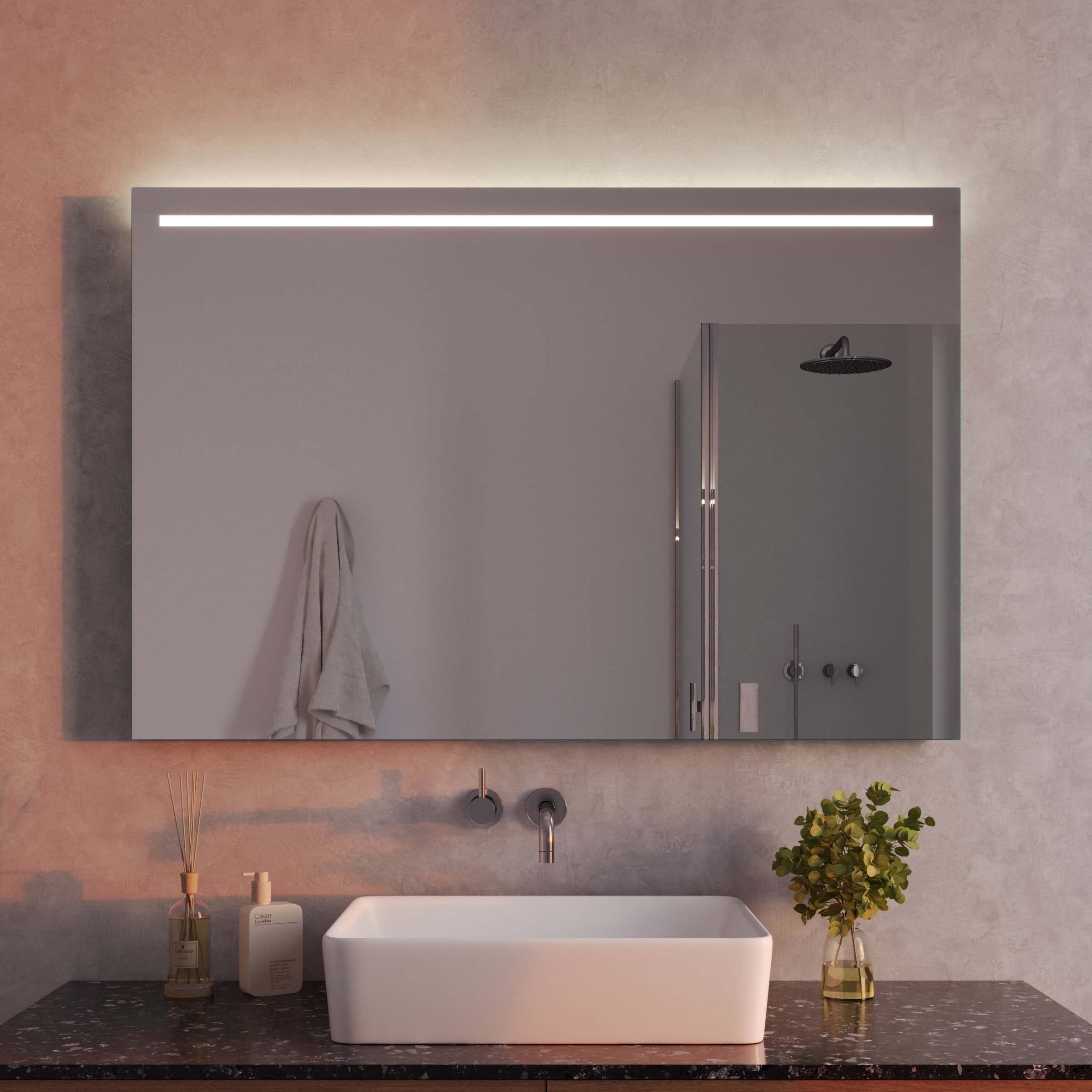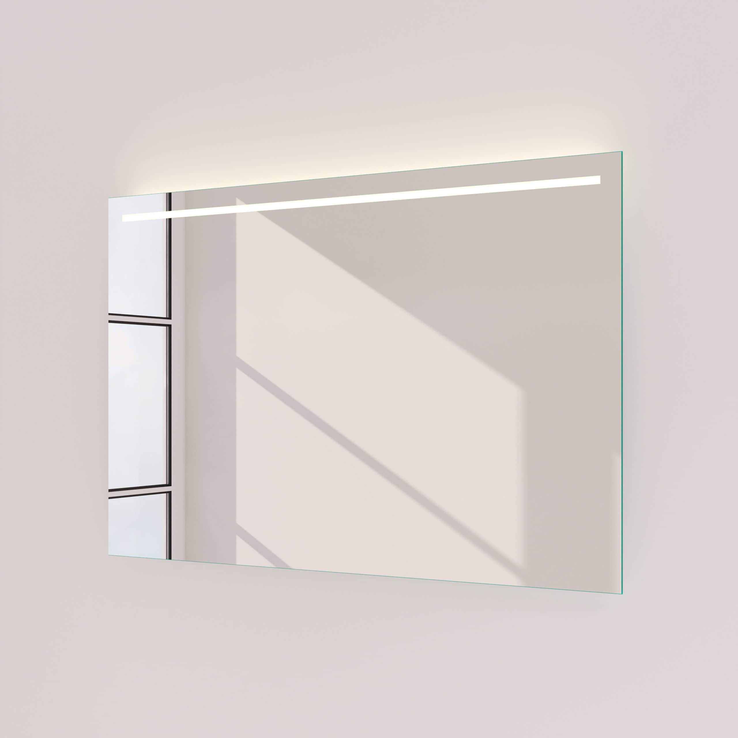 Der Badspiegel Modena ist weit mehr als eine reflektierende Fläche – er ist ein zentrales Gestaltungselement, das sich durch seine individuelle Maßanfertigung nahtlos in Ihr Raumkonzept einfügt. Gefertigt aus einem 5 mm starken Kristallspiegel, garantiert er eine brillante, absolut verzerrungsfreie Ansicht. Die sorgfältig geschliffenen und veredelten Kanten zeugen von höchster Handwerkskunst und verleihen dem Spiegel eine zeitlos elegante Ästhetik. Das Herzstück ist die oben positionierte LED-Beleuchtung. Speziell für kosmetische Anwendungen optimiert, taucht sie Ihr Gesicht in ein gleichmäßiges, schattenfreies Licht – ideal für die tägliche Pflegeroutine. Die Lichtquelle selbst bleibt dezent im Hintergrund: Durch eine satinierte Glasfläche wird das Licht sanft und indirekt gestreut, was eine blendfreie und angenehme Atmosphäre schafft. Im ausgeschalteten Zustand präsentiert sich diese Fläche als edle Milchglas-Applikation, die das minimalistische Design des Spiegels unterstreicht.