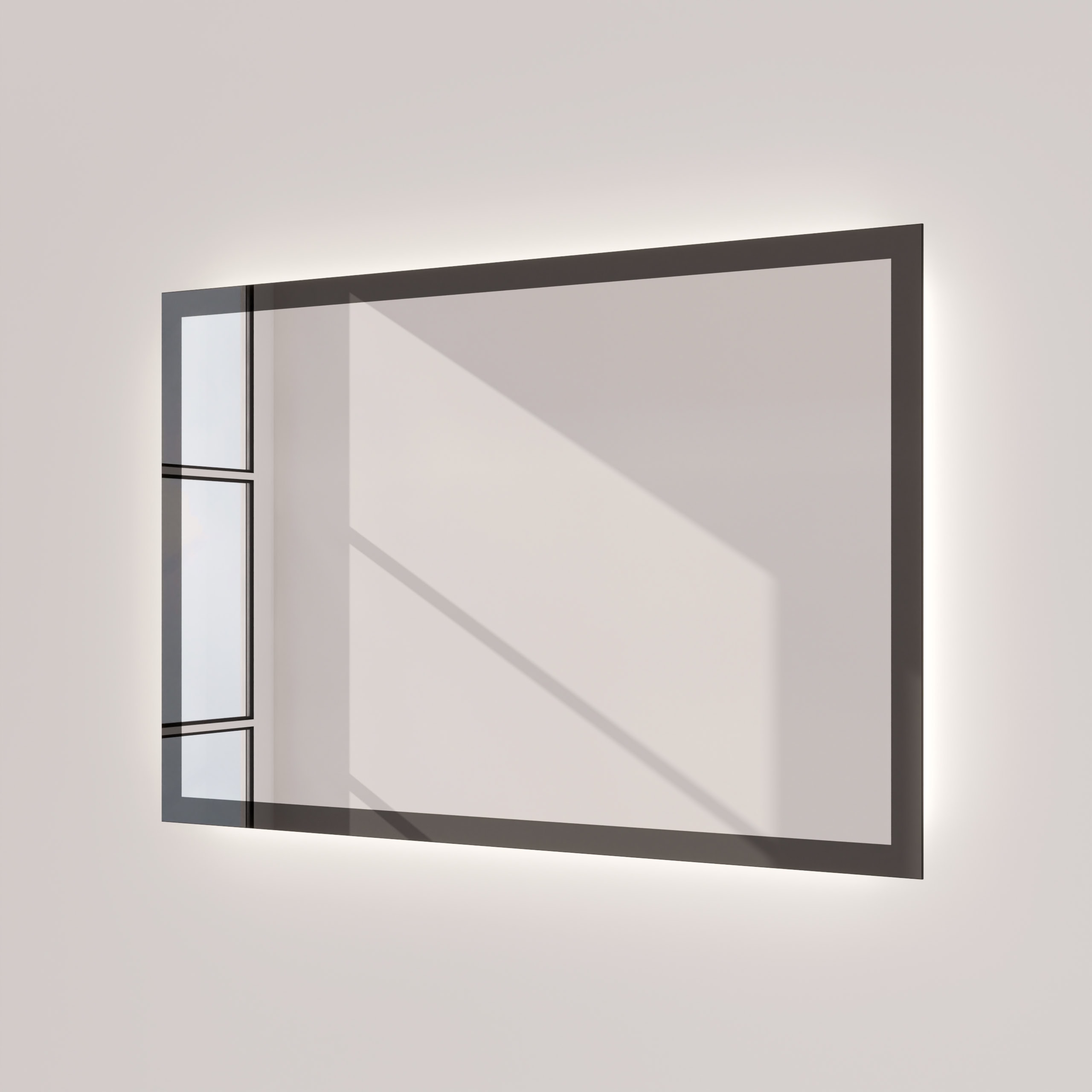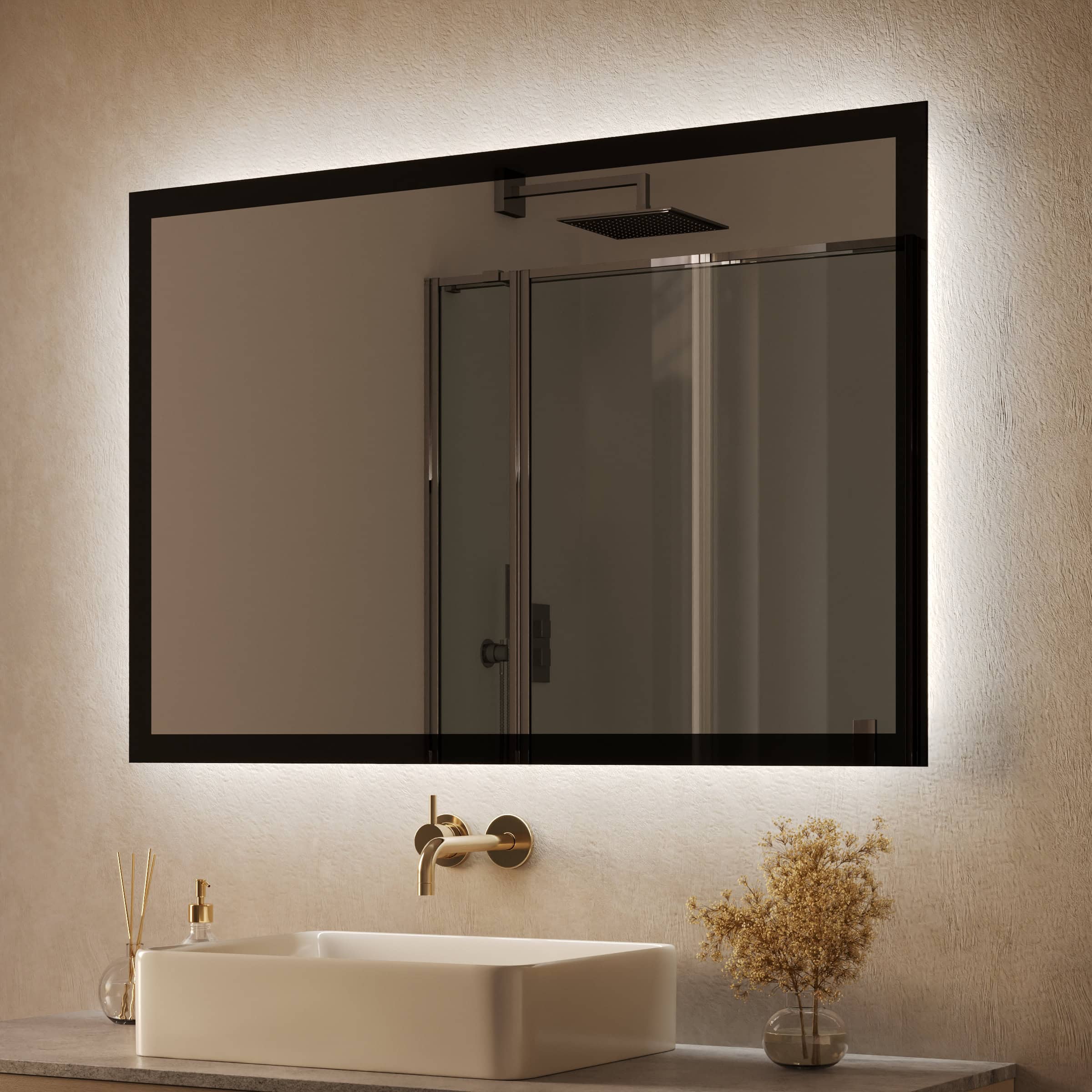 Der Badspiegel Aurea definiert die Verbindung von Funktion und Ästhetik neu. Eine rundherum laufende LED-Beleuchtung, deren Lichtstärke speziell für kosmetische Anwendungen optimiert ist, sorgt für eine schattenfreie und authentische Ausleuchtung Ihres Gesichts. Gleichzeitig erzeugt die sanfte Hintergrundbeleuchtung eine schwebende Optik und taucht Ihr Badezimmer in ein atmosphärisches, indirektes Licht. Das Herzstück des Designs ist der markante, 40 mm breite Rahmen aus massivem, schwarz durchgefärbtem Glas. Er fasst den hochwertigen, 5 mm starken Kristallspiegel präzise ein und schafft einen faszinierenden Kontrast. Dank individueller Maßanfertigung integriert sich dieser LED Badspiegel millimetergenau in Ihr Raumkonzept und wird zum Ausdruck Ihres persönlichen Stils. Die geschliffenen und veredelten Kanten zeugen von höchster Verarbeitungsqualität und vollenden das minimalistische Gesamtbild.