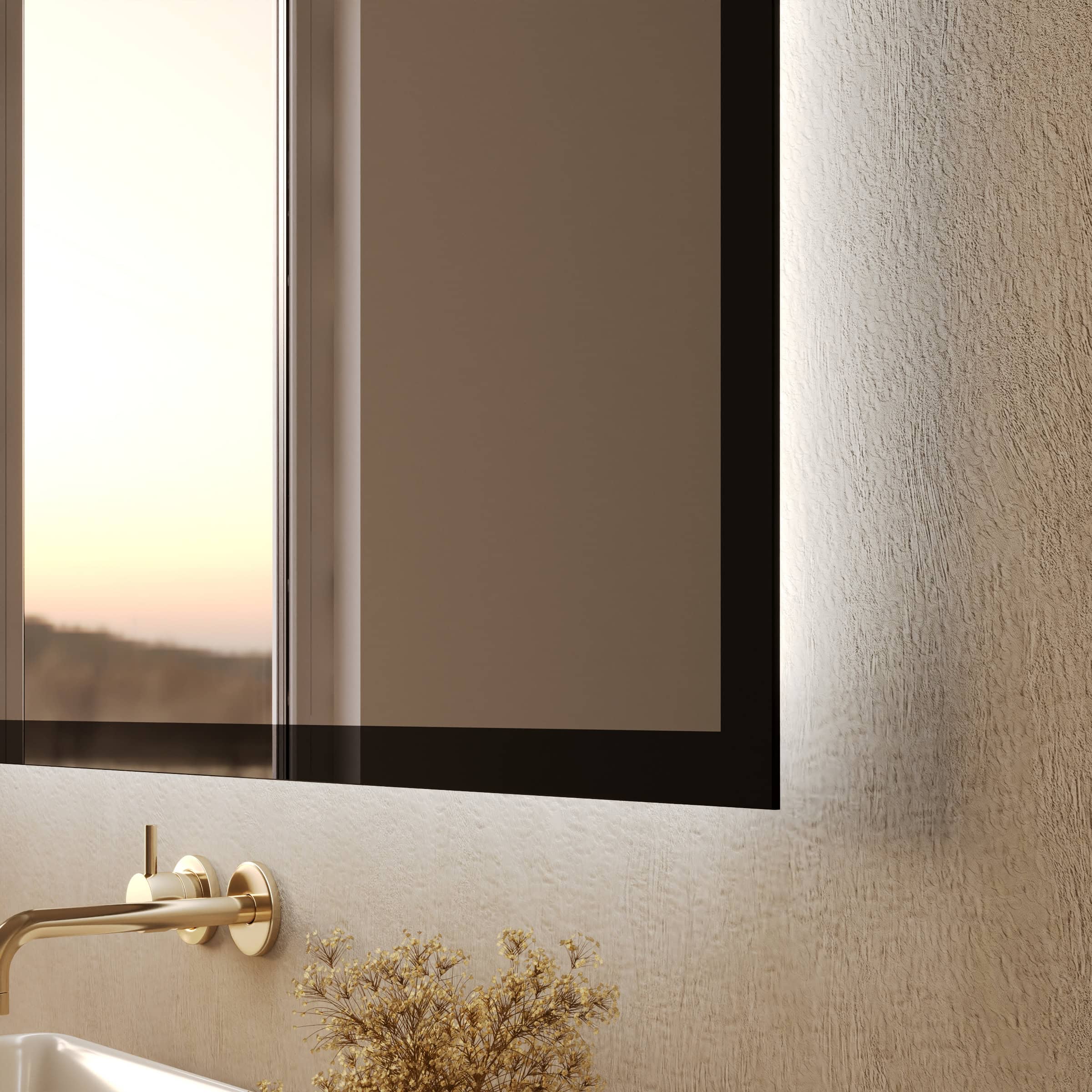 Erleben Sie Manufakturqualität, die Bestand hat. Konfigurieren Sie jetzt Ihren persönlichen Badspiegel Aurea mit schwarzem Glasrahmen und Beleuchtung.