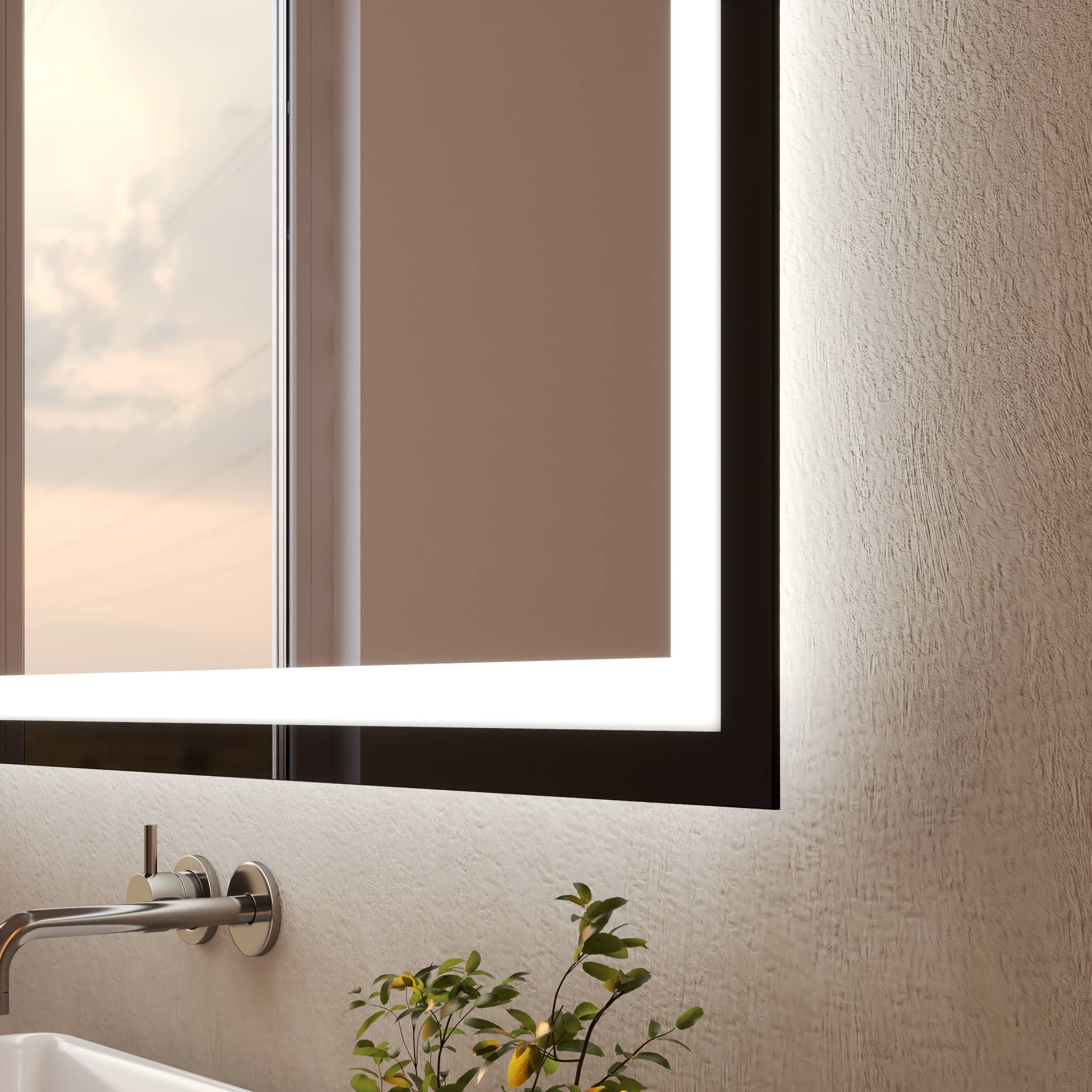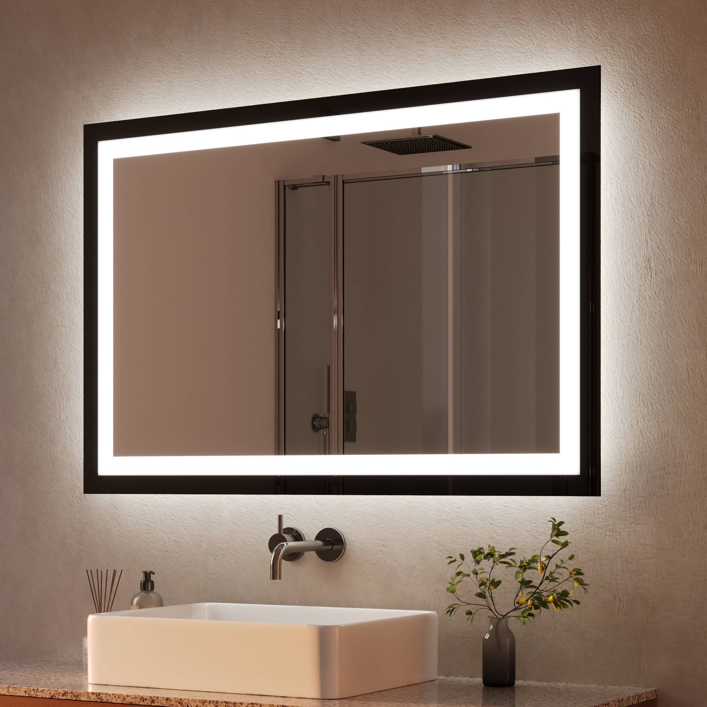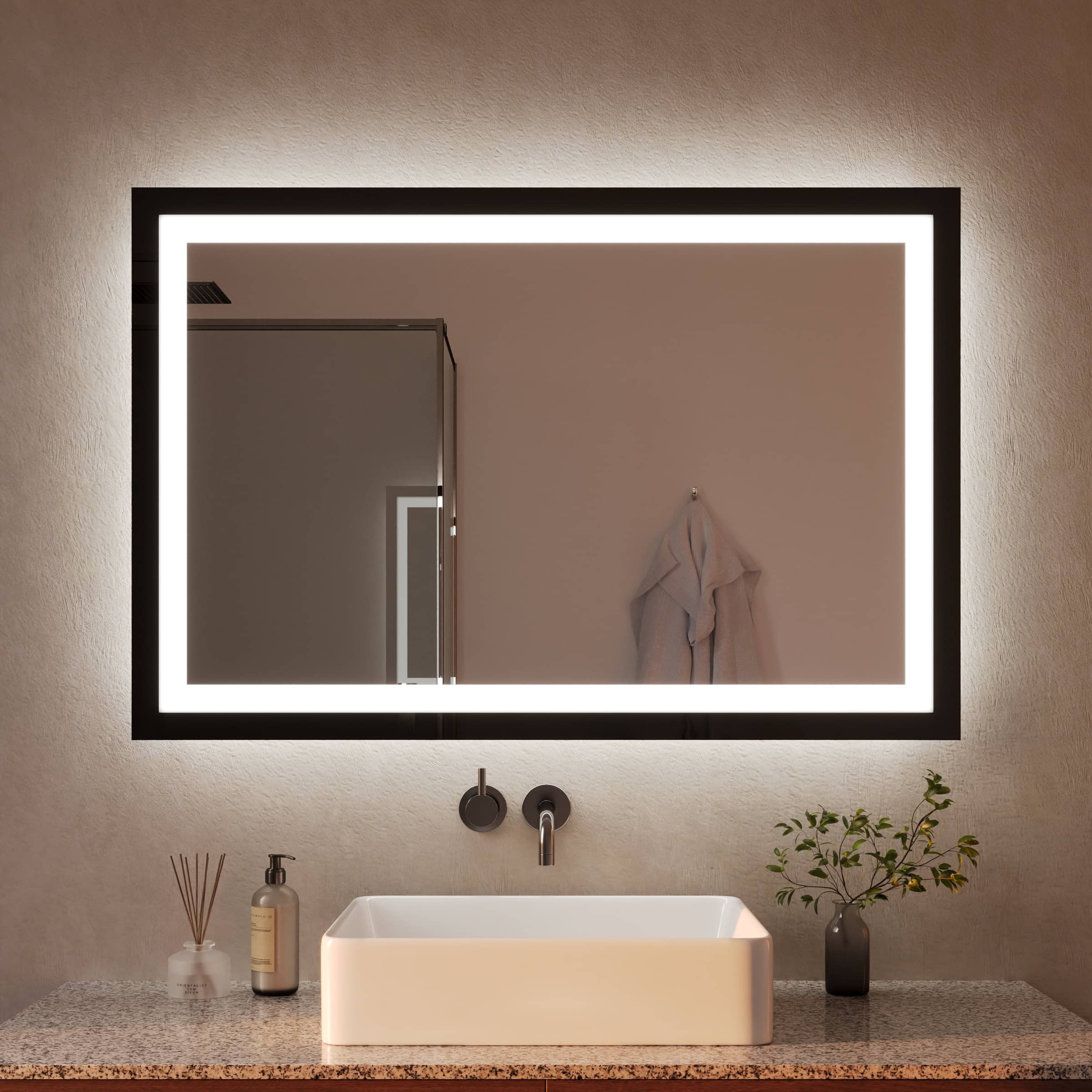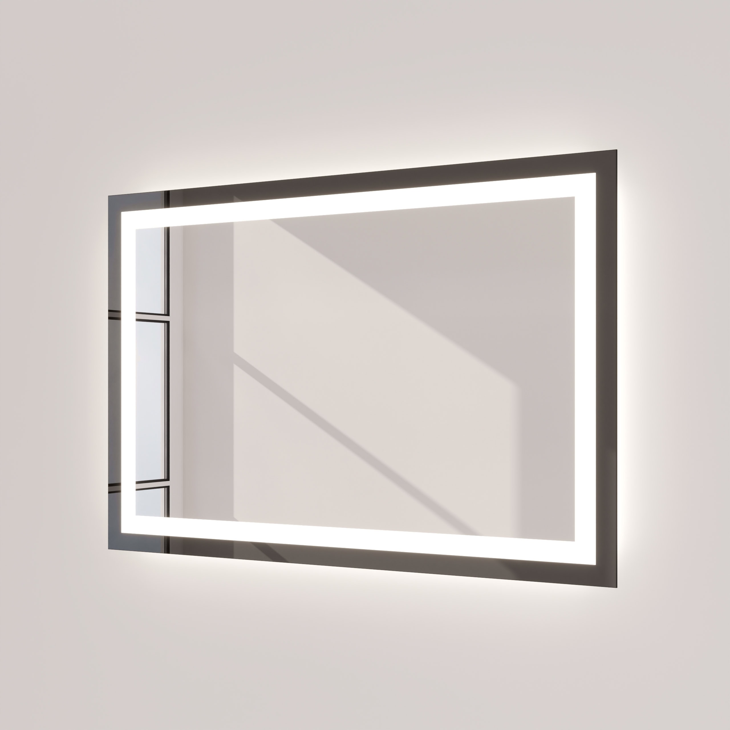 Der Badspiegel Noemi ist mehr als eine Reflexionsfläche; er ist ein architektonisches Statement. Sein charakteristischer Rahmen aus tiefschwarzem Glas setzt einen markanten und zugleich filigranen Akzent. Mit 40 mm Breite verleiht er dem hochwertigen, 5 mm starken Kristallspiegel eine außergewöhnliche visuelle Tiefe. Die rundherum laufende LED-Beleuchtung wurde speziell für eine schattenfreie und authentische Ausleuchtung des Gesichts optimiert – ideal für die tägliche Kosmetik und Pflege. Das Licht tritt sanft durch satinierte Leuchtfelder aus, die im ausgeschalteten Zustand wie edles Milchglas wirken und dem Spiegel eine ruhige Ästhetik verleihen. Als individuelle Maßanfertigung fügt sich dieser Badspiegel mit Beleuchtung nahtlos und präzise in Ihr Raumkonzept ein und wird zum visuellen Ankerpunkt Ihres persönlichen Refugiums.