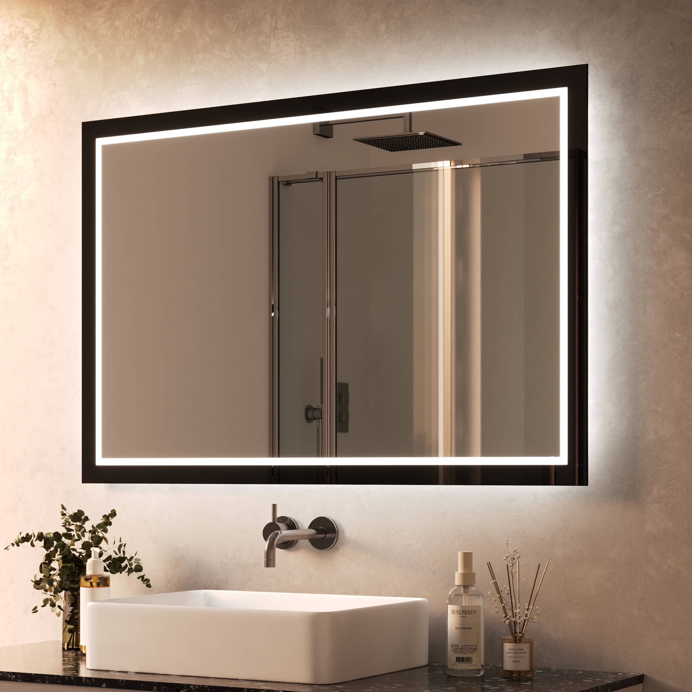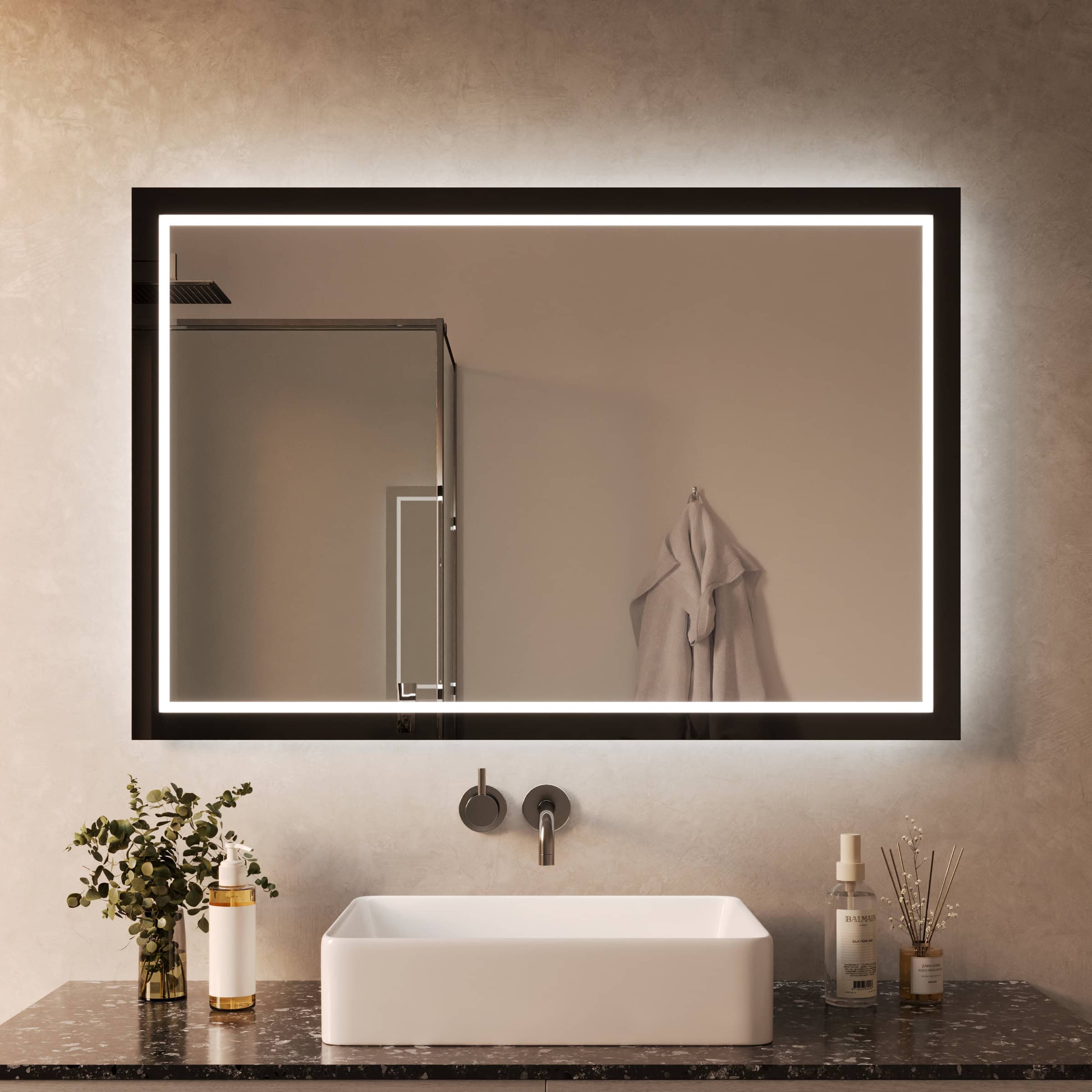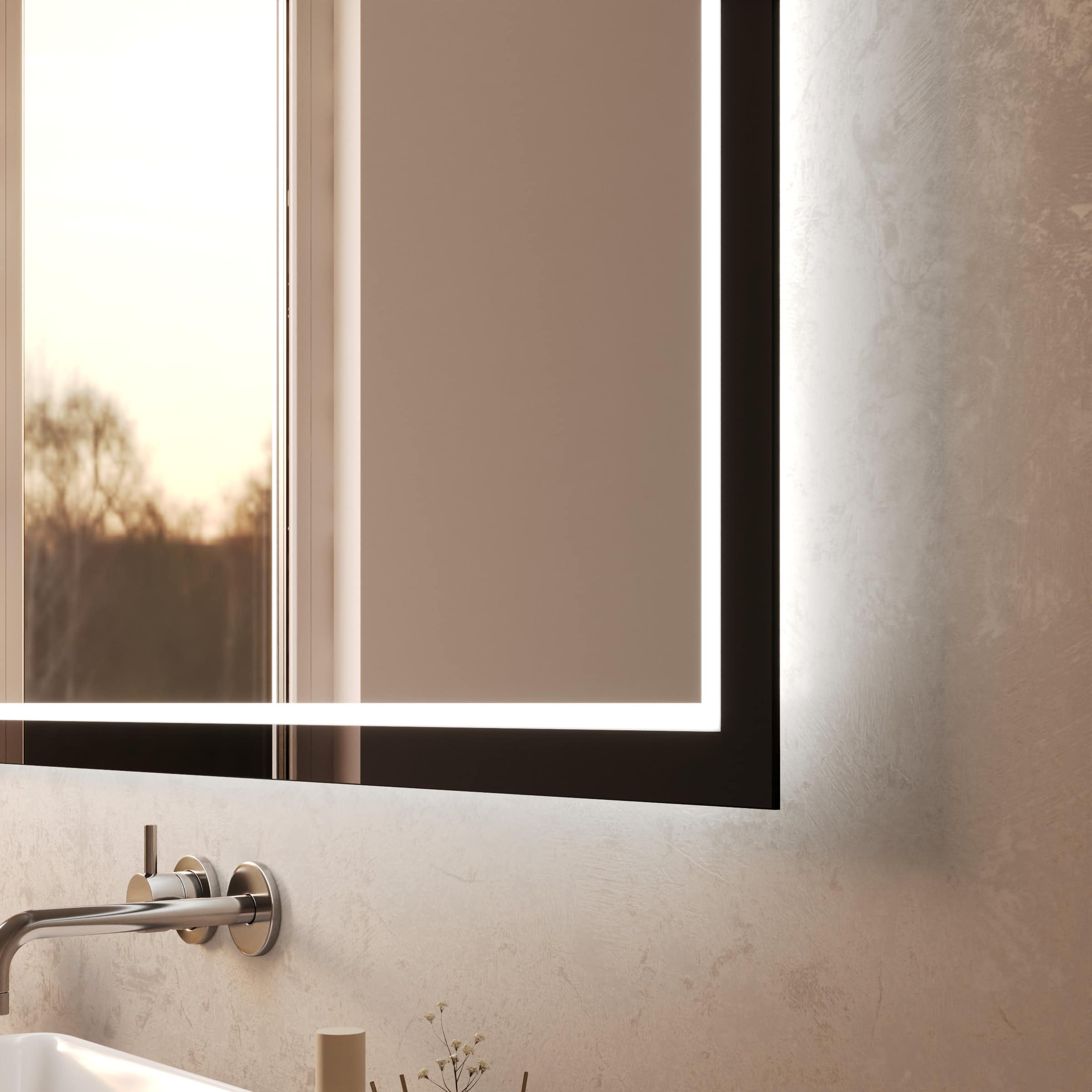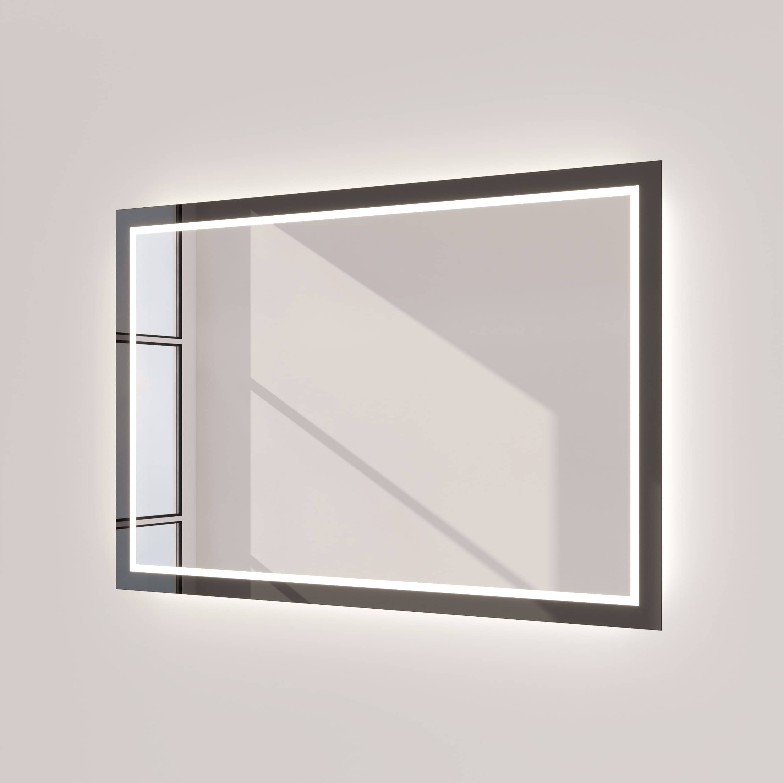Der Badspiegel Siena definiert Ihr Raumgefühl durch seinen charakterstarken Rahmen aus tiefschwarzem Glas neu. Mit einer Breite von 40mm setzt er ein klares Statement, ohne aufdringlich zu wirken. Die rundherum laufende LED-Beleuchtung tritt indirekt durch satinierte Leuchtfelder aus und taucht Ihr Gesicht in ein schattenfreies, für kosmetische Anwendungen optimiertes Licht. Ausgeschaltet fügen sich die Flächen harmonisch als milchglasartige Elemente in das Design ein. Gefertigt nach Ihren individuellen Maßen aus 5mm starkem Kristallspiegelglas mit veredelten Kanten, ist der Siena mehr als ein Badspiegel mit Beleuchtung – er ist ein Zeugnis für anspruchsvolles Design und beständige Qualität, das Ihr tägliches Ritual in einen Moment puren Wohlbefindens verwandelt.