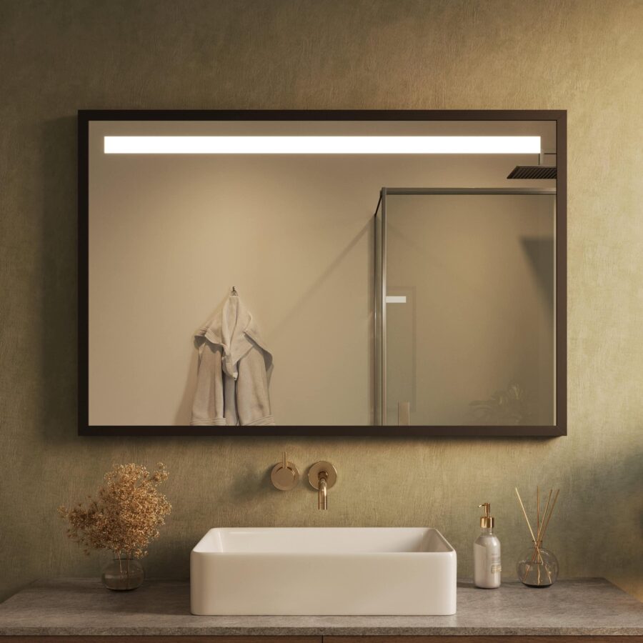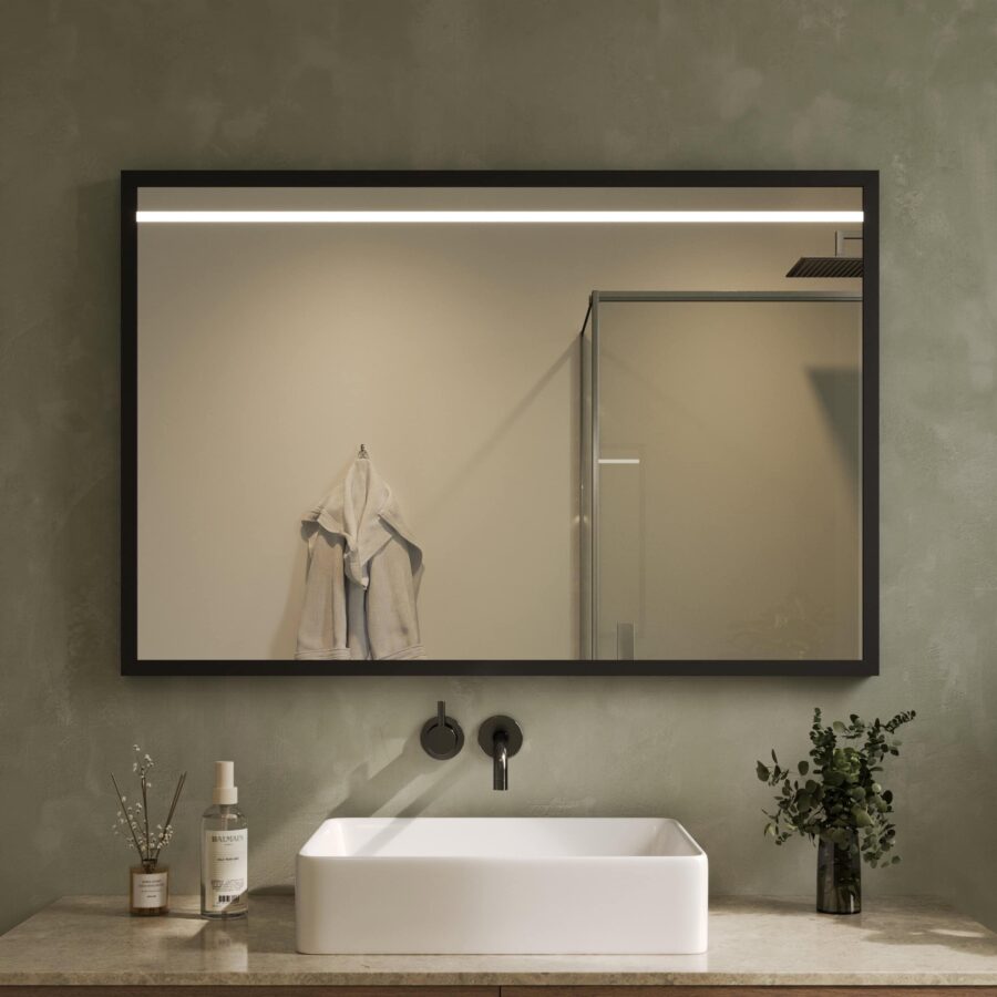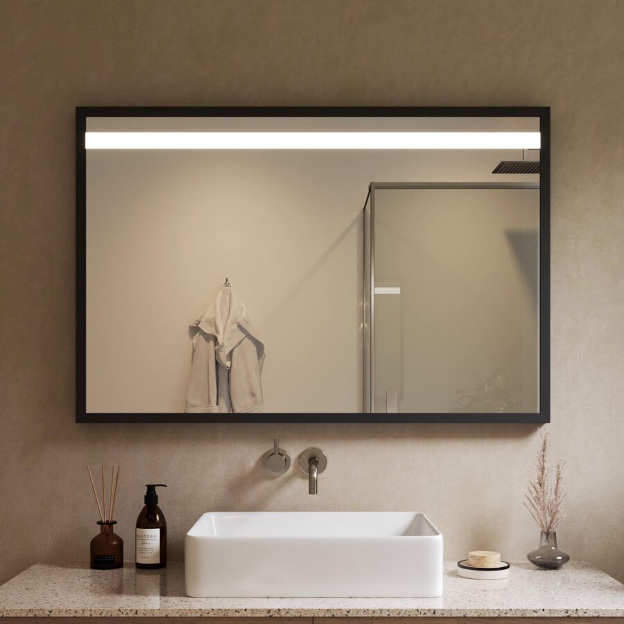 Der Badspiegel Noemi wird exakt nach Ihren Wünschen auf Maß gefertigt und fügt sich so nahtlos in Ihre Raumarchitektur ein. Sein filigraner, mattschwarzer Metallrahmen mit einer Tiefe von 45 mm setzt einen klaren, modernen Akzent, ohne aufdringlich zu wirken. Die Spiegelfläche aus 5 mm starkem Kristallspiegel mit sorgfältig geschliffenen und veredelten Kanten garantiert eine brillante, unverfälschte Reflexion. Das Herzstück dieses Design-Badspiegels ist die oben integrierte LED-Beleuchtung. Speziell für kosmetische Anwendungen optimiert, leuchtet sie Ihr Gesicht schattenfrei und authentisch aus. Das Licht tritt dabei sanft durch eine 4 cm breite, satinierte Glasfläche aus. Im ausgeschalteten Zustand wirkt diese Fläche wie edles Milchglas; eingeschaltet verwandelt sie sich in ein homogenes Leuchtfeld, das den Bereich vor dem Spiegel indirekt und blendfrei erhellt. So entsteht eine Atmosphäre von konzentrierter Ruhe und Klarheit – ideal für den Start in den Tag oder das abendliche Pflegeritual.