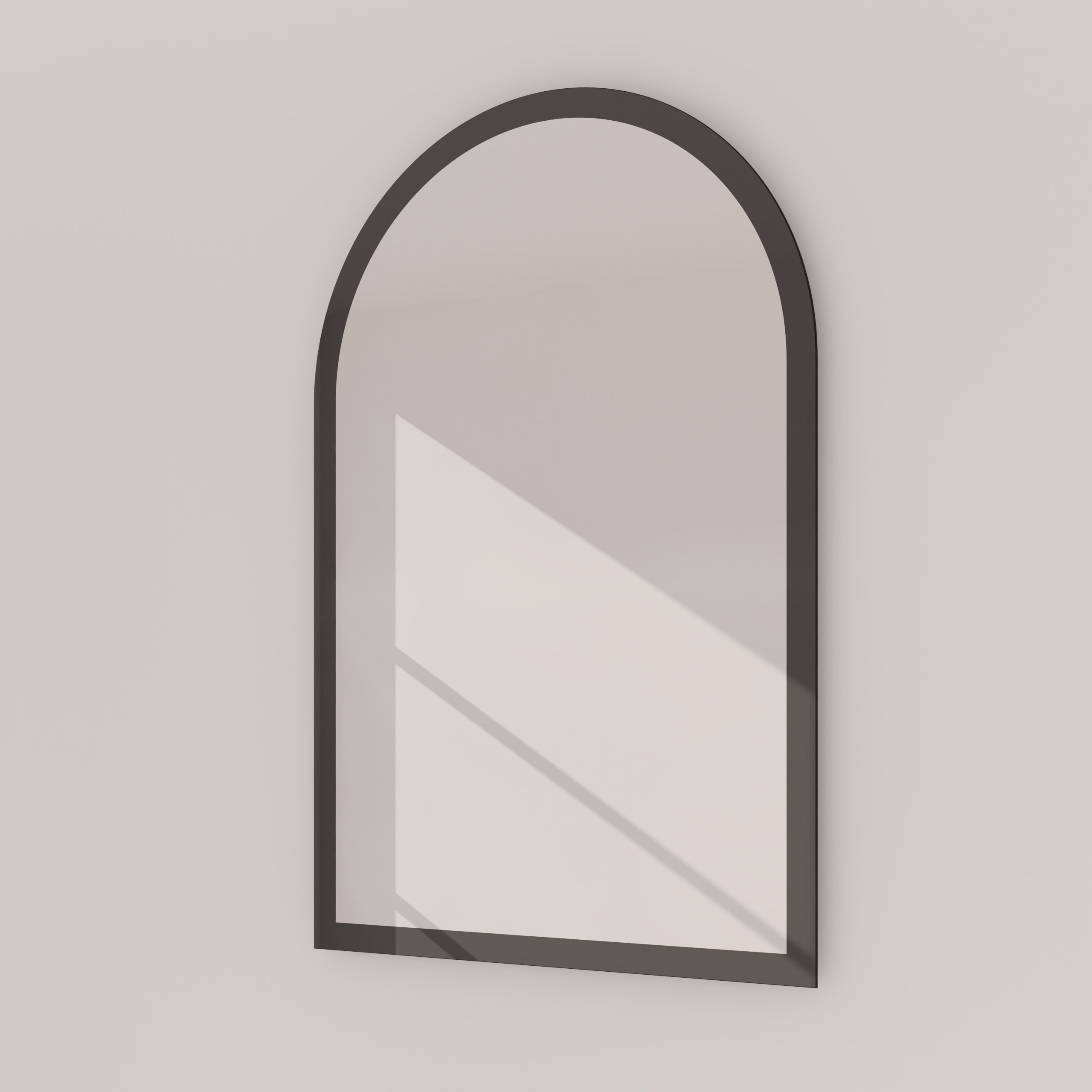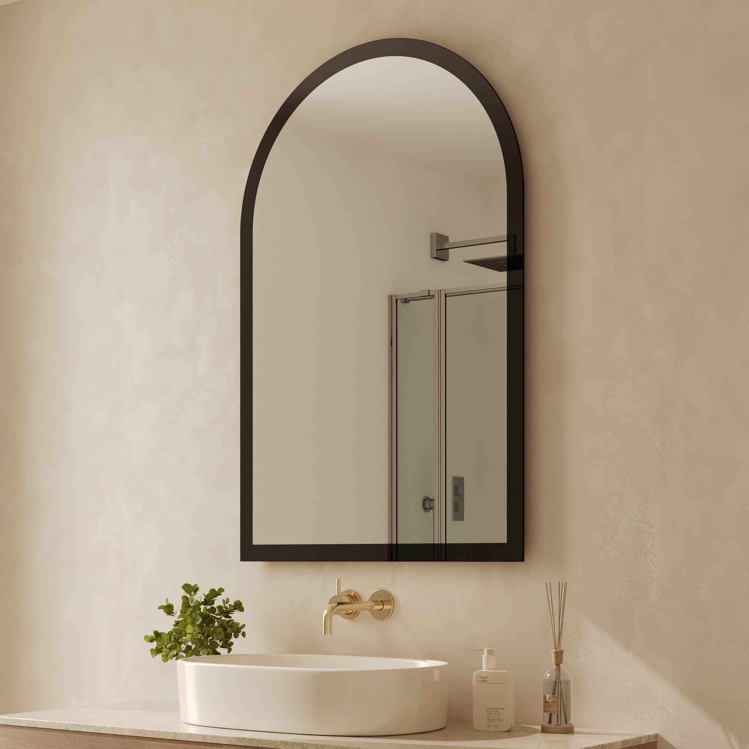 Der Badspiegel Cristal bricht mit konventioneller Ästhetik und führt die sanfte, organische Linie eines Rundbogens in Ihr Baddesign ein. Seine besondere Ausstrahlung verdankt er dem markanten Rahmen aus tiefschwarzem Glas, der einen faszinierenden Kontrast zur brillianten Spiegelfläche bildet. Mit einer Breite von 40 mm verleiht der Rahmen dem Spiegel eine visuelle Tiefe und einen klaren, architektonischen Charakter. Gefertigt aus 5 mm starkem Kristallspiegelglas, garantiert Cristal eine außergewöhnlich klare und unverfälschte Reflexion. Die präzise geschliffenen und veredelten Kanten zeugen von höchster Handwerkskunst und sorgen für eine makellose Optik aus jedem Blickwinkel. Dank der individuellen Maßanfertigung integriert sich dieser bogenförmige Spiegel perfekt in Ihre Raumarchitektur – ob als subtiler Akzent oder als zentrales Design-Statement.