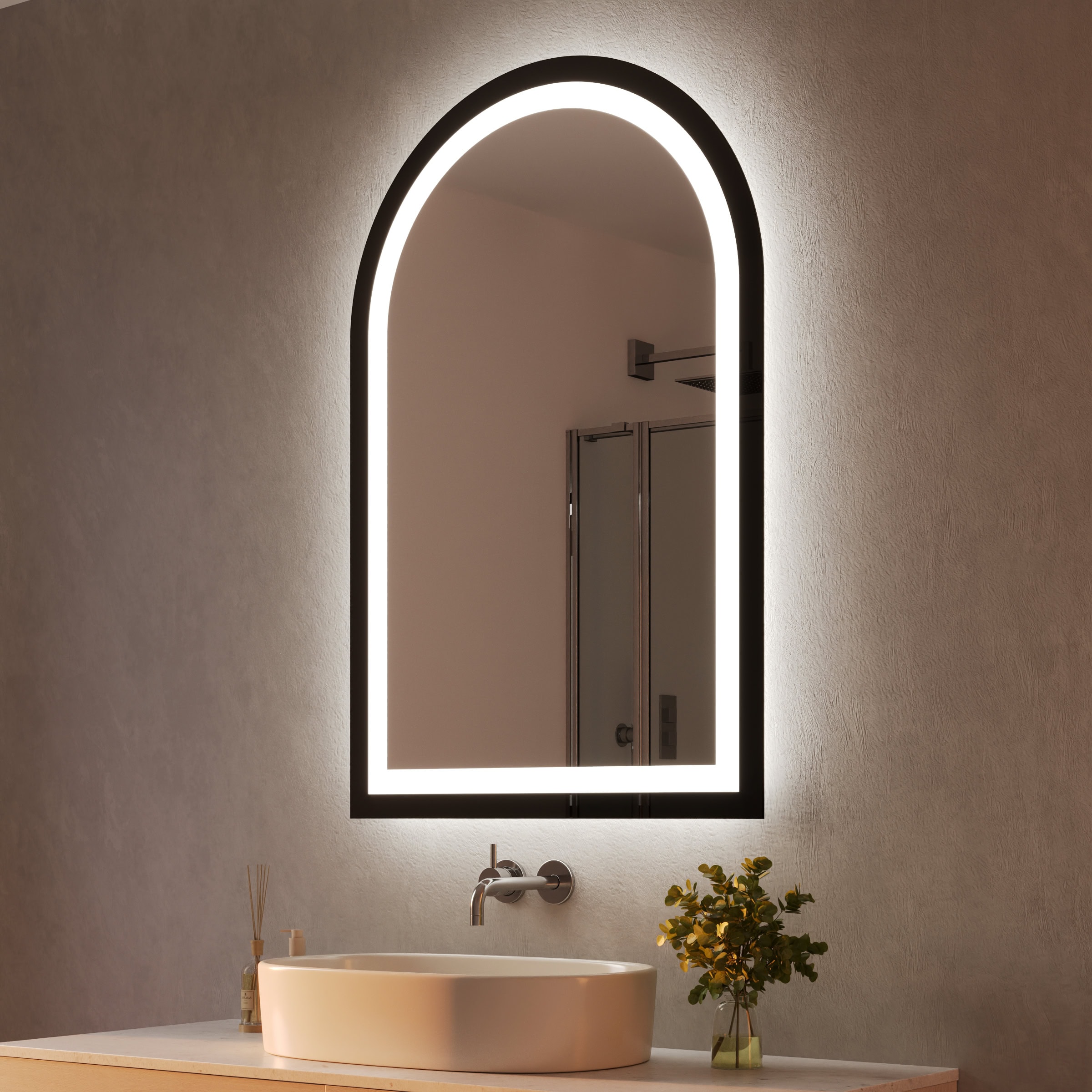 Die sanfte, architektonische Form des Rundbogens verleiht Ihrem Badezimmer eine harmonische und zugleich markante Ästhetik. Eingefasst von einem 40mm breiten Rahmen aus tiefschwarzem Glas, entsteht ein faszinierender Kontrast, der moderne Klarheit mit zeitloser Eleganz verbindet. Das Herzstück dieses Design-Spiegels ist die umlaufende, indirekte LED-Beleuchtung. Sie tritt sanft durch satinierte Leuchtfelder hervor und hüllt Ihr Spiegelbild in ein weiches, schattenfreies Licht – optimiert für die tägliche Kosmetik und Pflegeroutine. Im ausgeschalteten Zustand präsentieren sich diese Flächen in einer dezenten Milchglas-Optik. Gefertigt aus 5mm starkem Kristallspiegel mit präzise geschliffenen Kanten, garantiert dieser Badspiegel mit Rundbogen eine brillante, unverzerrte Reflexion. Dank der individuellen Maßanfertigung fügt sich der Spiegel Noemi passgenau in Ihre Raumarchitektur ein und wird zum persönlichen Ausdruck Ihres anspruchsvollen Geschmacks.