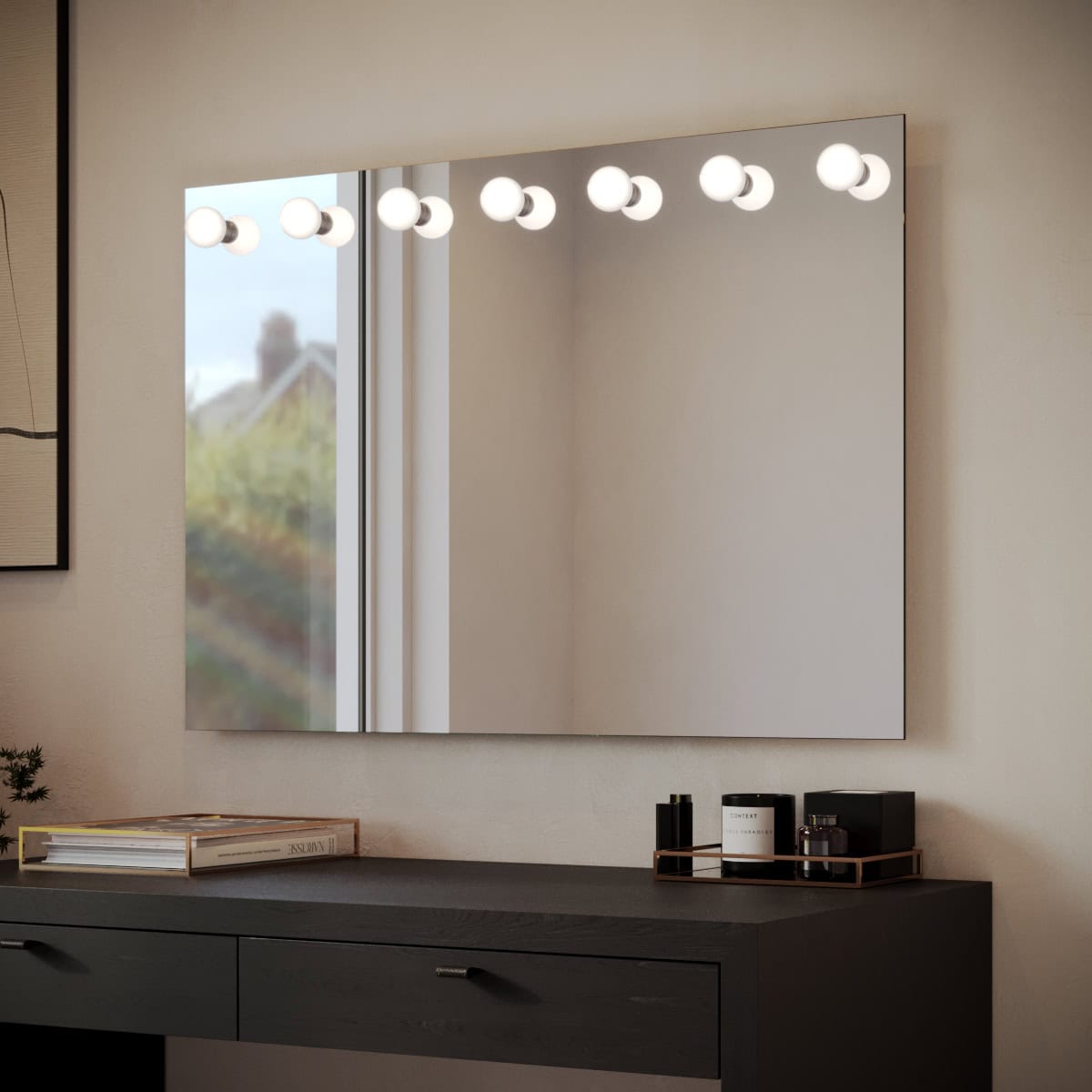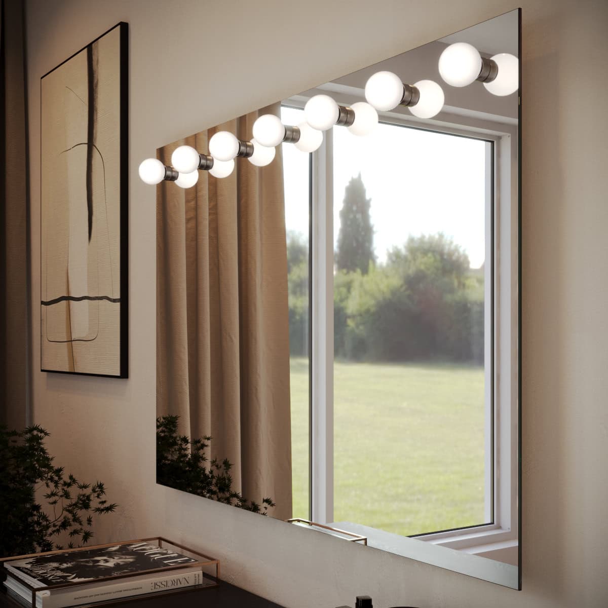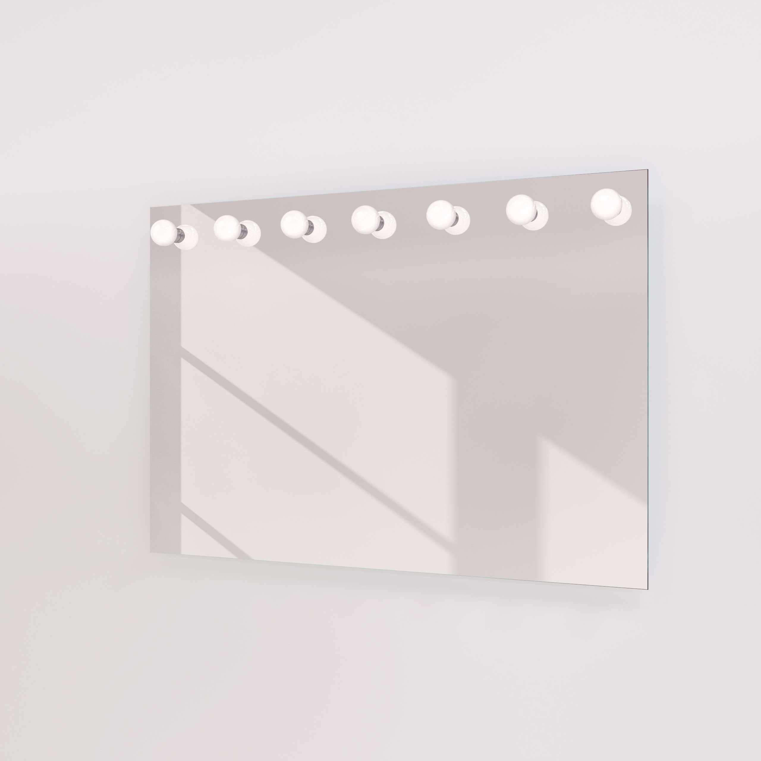 Als exklusive Maßanfertigung fügt sich der Hollywood Spiegel 'Glamira' nahtlos in Ihr persönliches Raumkonzept ein. Gefertigt aus brillantem, 5mm starkem Kristallspiegel, dessen präzise geschliffenen und veredelten Kanten von höchster Verarbeitungsqualität zeugen. Das charakteristische Merkmal ist die obere, offene LED-Beleuchtung im Stil klassischer Glühbirnen. Diese Lichtquelle ist nicht nur ein ikonisches Designelement, sondern wurde gezielt für kosmetische Anwendungen optimiert. Sie sorgt für eine schattenfreie, tageslichtähnliche Ausleuchtung des Gesichts – die ideale Voraussetzung für ein makelloses Make-up oder eine präzise Rasur. Mit seiner klaren, rechteckigen Form und der eleganten Tiefe von 50mm wird dieser Badezimmerspiegel zum stilvollen Zentrum Ihres Raumes.