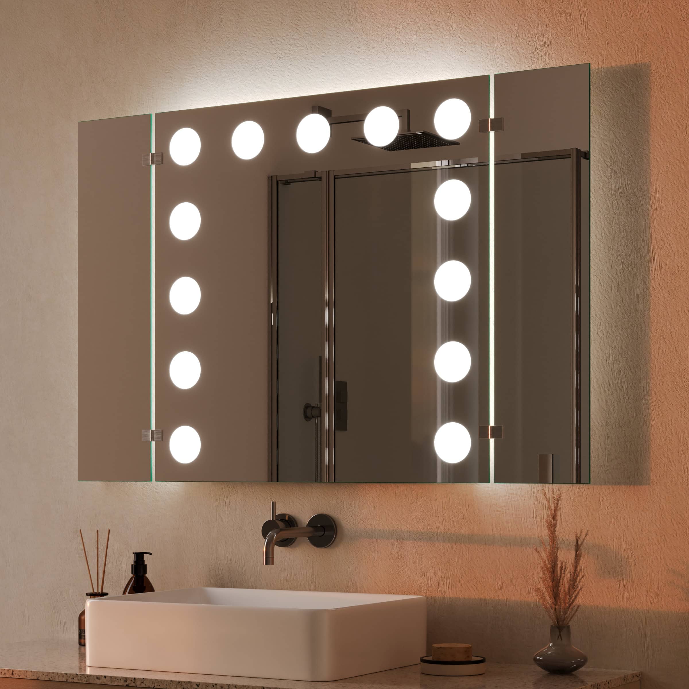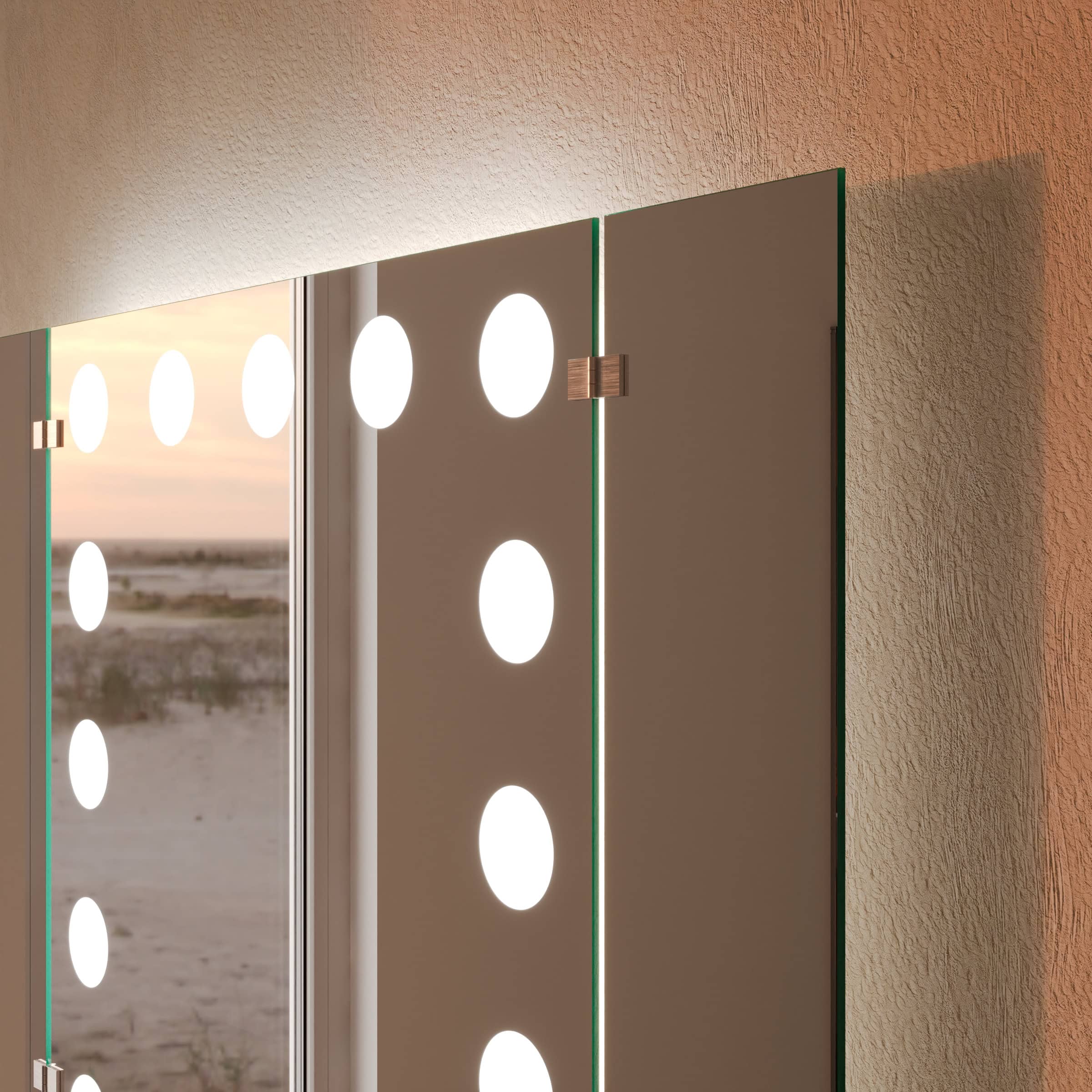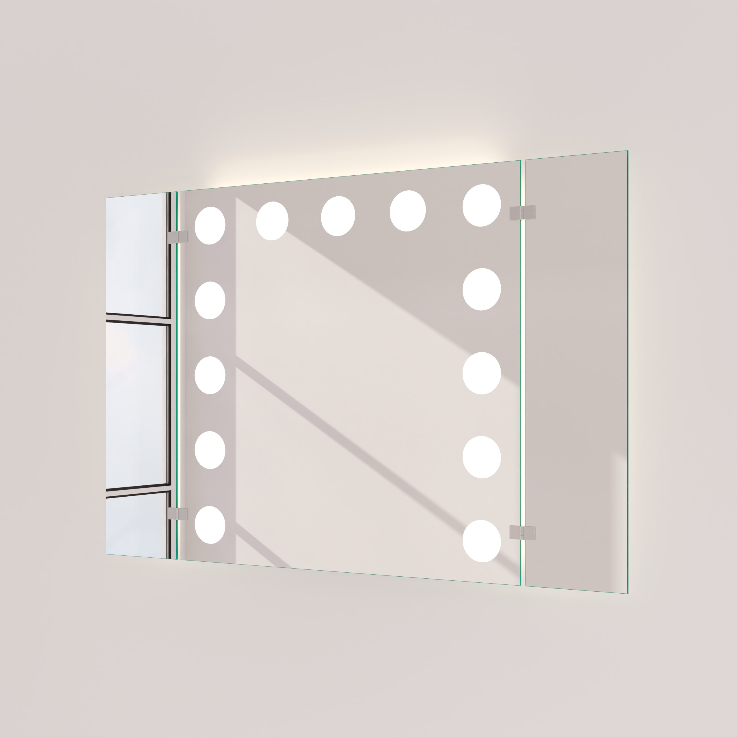 Dieser dreiteilige Klappspiegel mit Beleuchtung ist mehr als ein funktionales Element – er ist das Herzstück einer anspruchsvollen Badgestaltung. Gefertigt nach Ihren individuellen Maßen aus brillantem 5mm Kristallspiegel, fügt er sich nahtlos in Ihr Raumkonzept ein. Die drei Spiegelflächen mit präzise geschliffenen und veredelten Kanten ermöglichen Ihnen eine perfekte Rundumsicht. Die namensgebende Hollywood-Beleuchtung, bestehend aus LED-Leuchtfeldern links, oben und rechts, wurde speziell für kosmetische Anwendungen optimiert. Sie sorgt für eine absolut schattenfreie und authentische Ausleuchtung Ihres Gesichts. Dank der indirekten Lichterhellung entsteht dabei kein blendendes, hartes Licht, sondern eine weiche, atmosphärische Aura, die Ihr Badezimmer in einen Ort der Ruhe und des Wohlbefindens taucht.