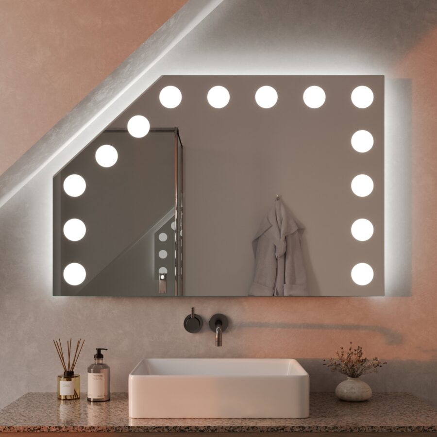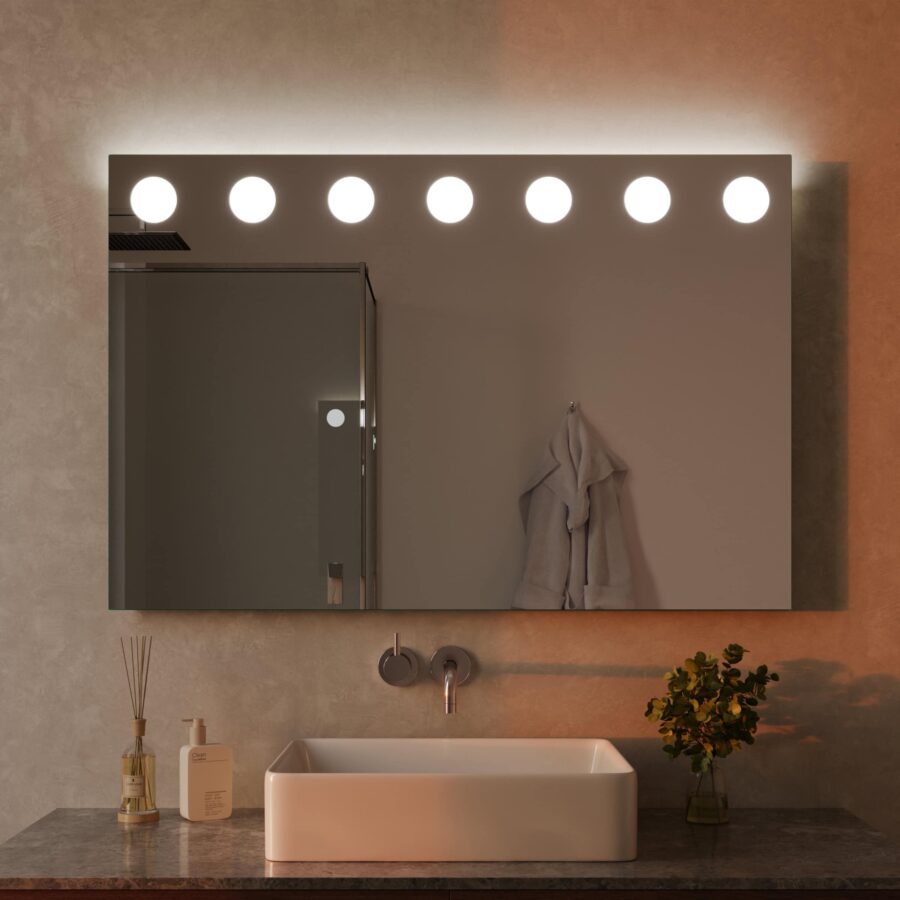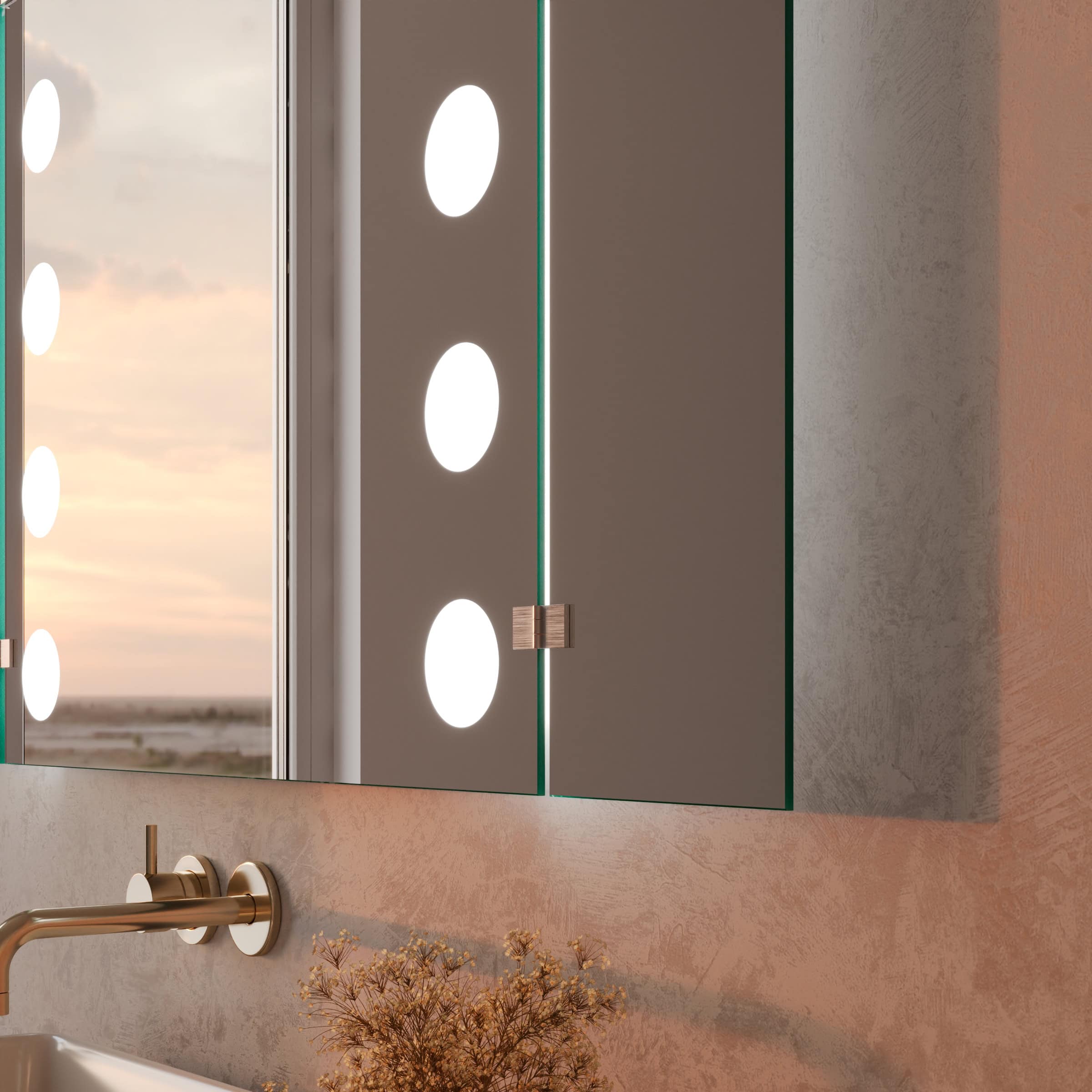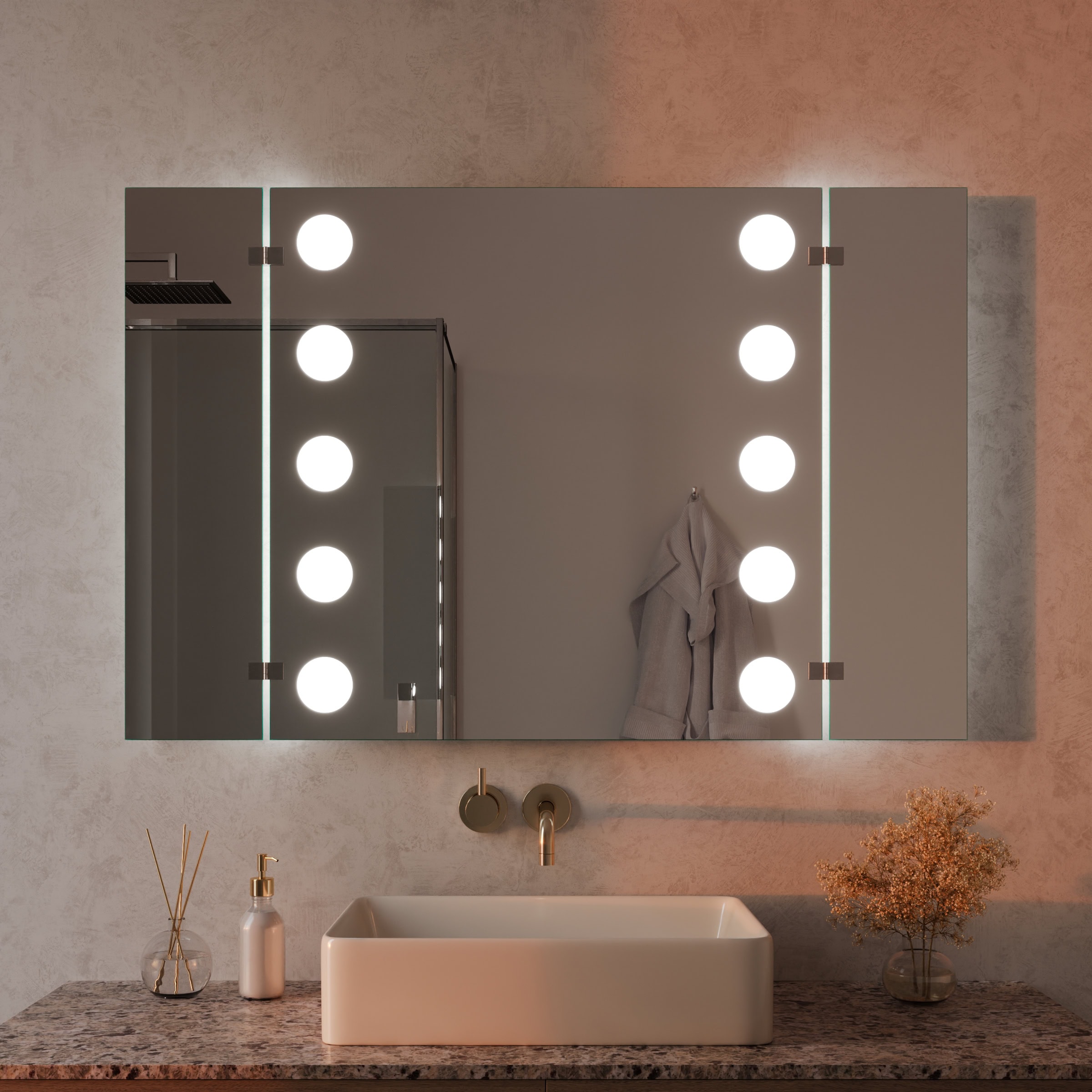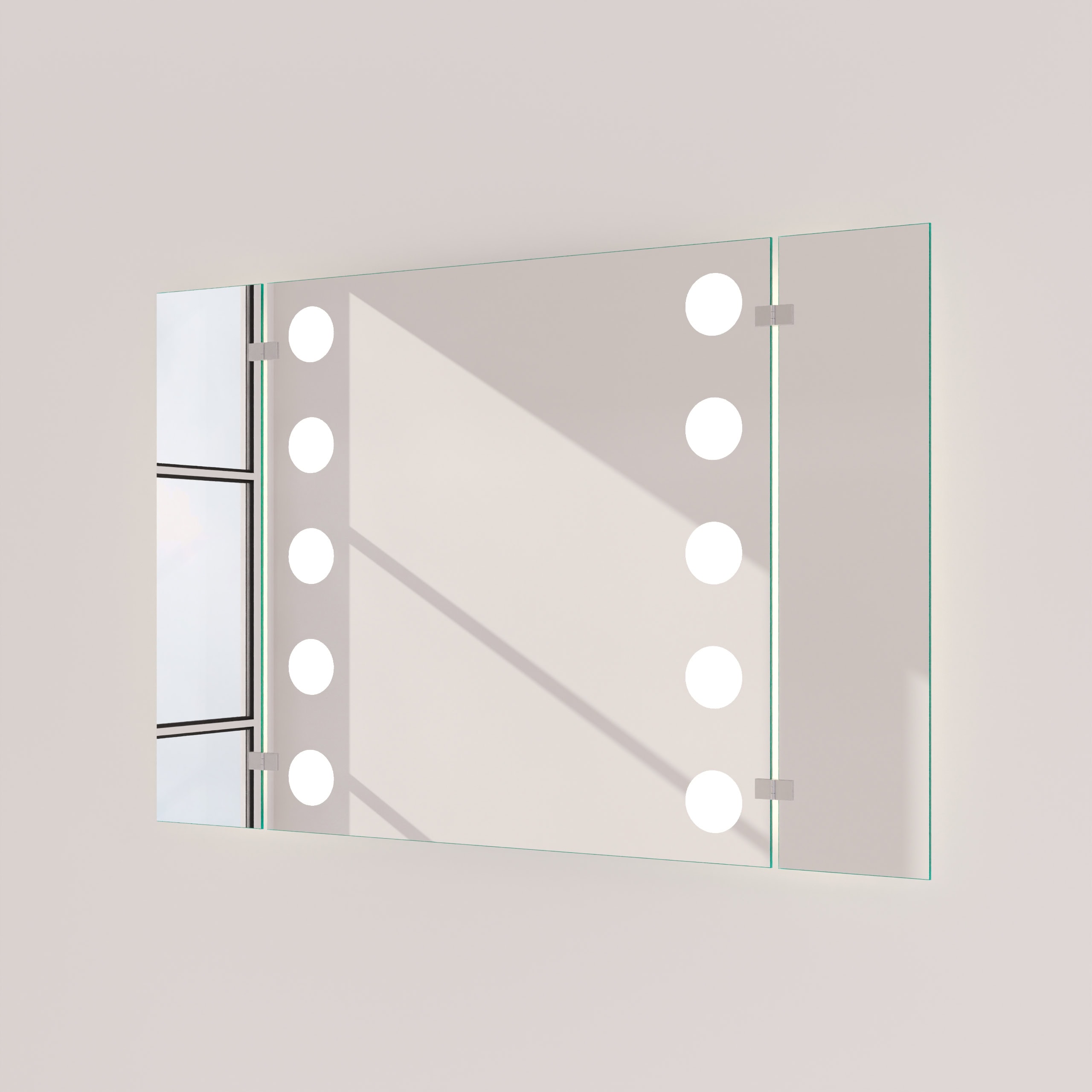 Dieser dreiteilige Klappspiegel mit Beleuchtung ist mehr als nur eine Reflexionsfläche – er ist ein Instrument der Präzision für Ihr Badezimmer. Die seitlich klappbaren Flügel ermöglichen Ihnen einen vollkommenen Rundumblick, der für anspruchsvolles Haarstyling und makelloses Auftragen von Kosmetik unerlässlich ist. Inspiriert vom professionellen Hollywood-Stil, ist die beidseitige LED-Beleuchtung exakt auf die Bedürfnisse der Kosmetik abgestimmt. Sie erzeugt ein authentisches, schattenfreies Licht, das Ihr Gesicht frontal und seitlich gleichmäßig ausleuchtet. Die Leuchtfelder werden indirekt erhellt, wodurch das Licht sanft und blendfrei bleibt und eine luxuriöse Atmosphäre schafft. Gefertigt aus 5mm starkem Kristallspiegel mit geschliffenen und veredelten Kanten, zeugt jedes Detail von höchster Qualität. Dank der individuellen Maßanfertigung fügt sich dieser Spiegel nicht nur funktional, sondern auch als architektonisches Highlight nahtlos in Ihr Raumkonzept ein.