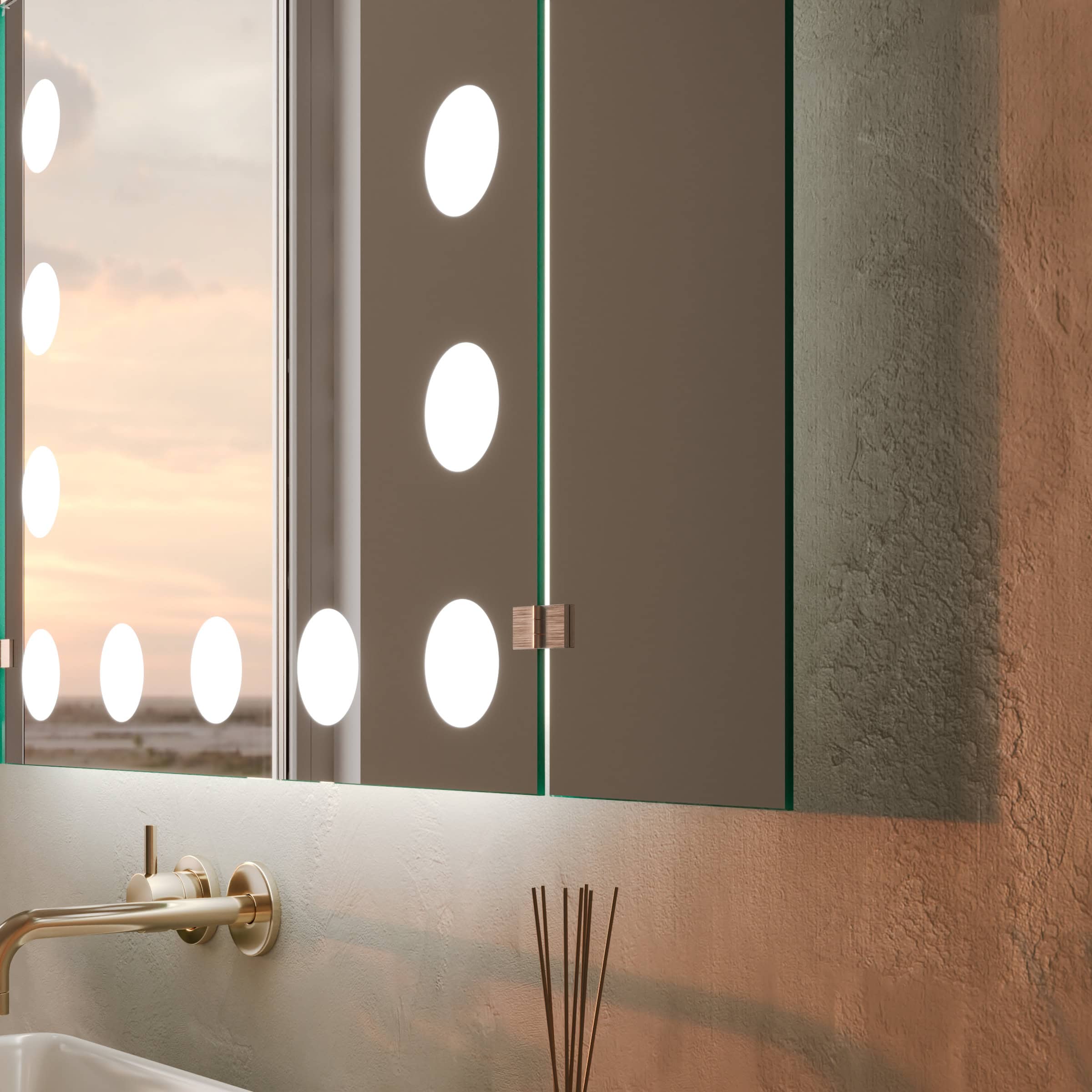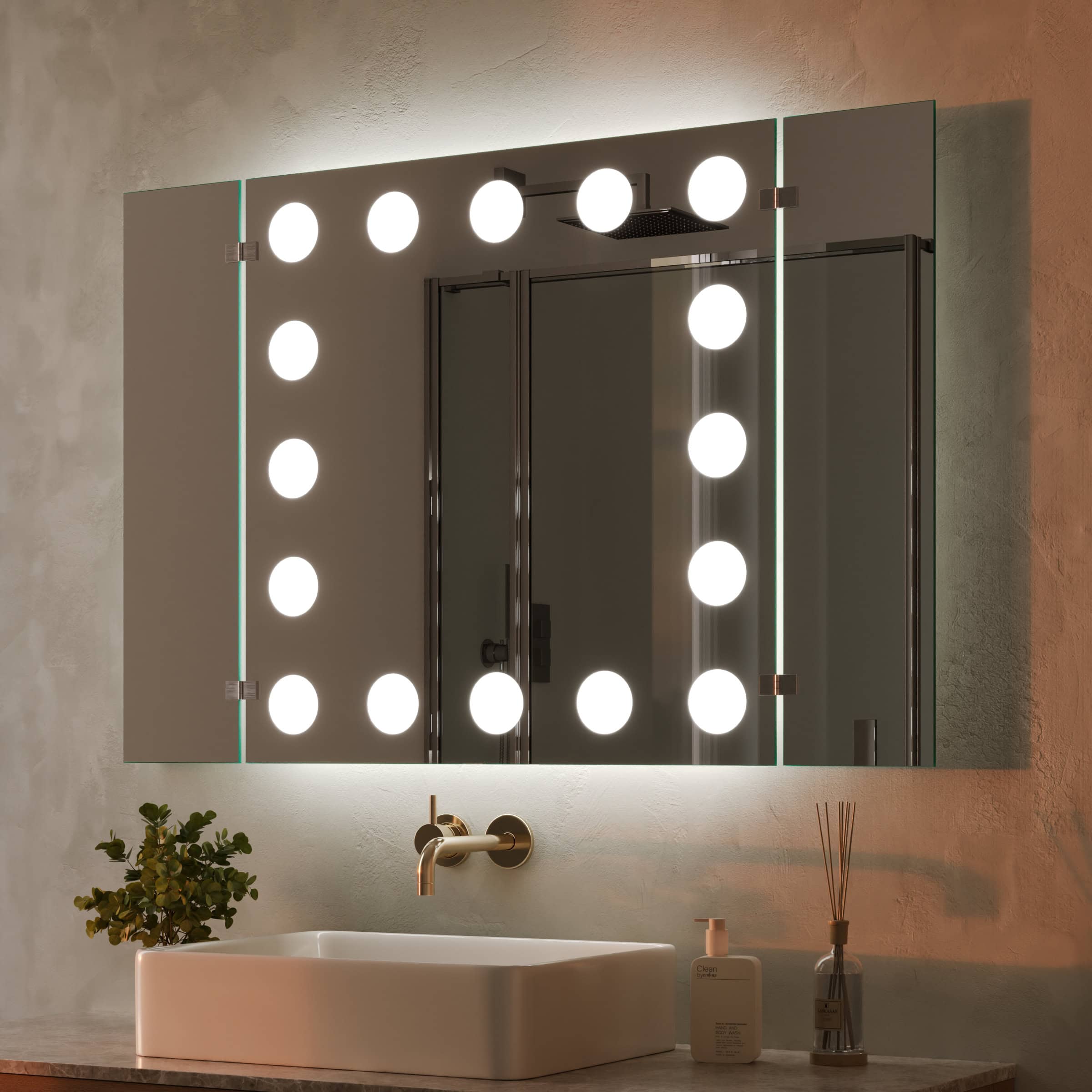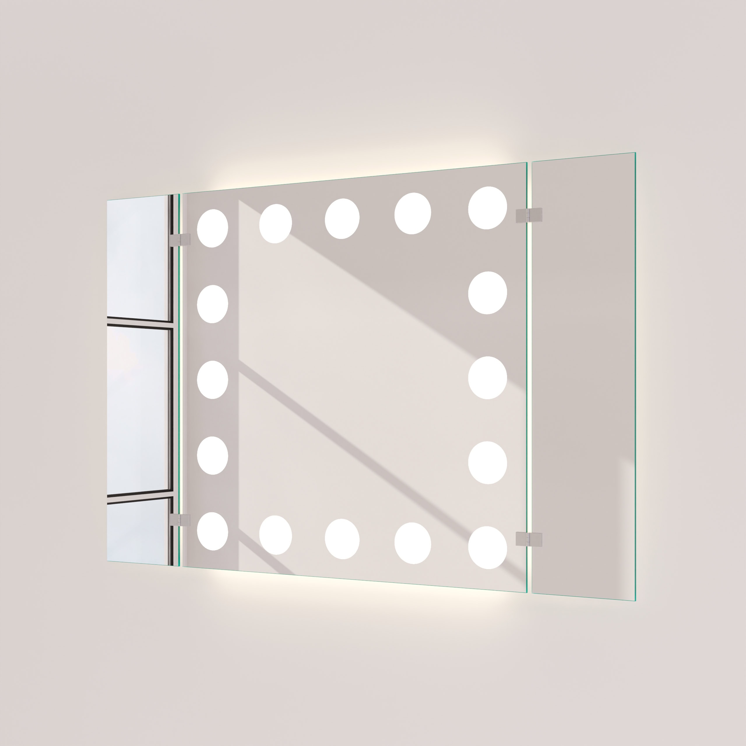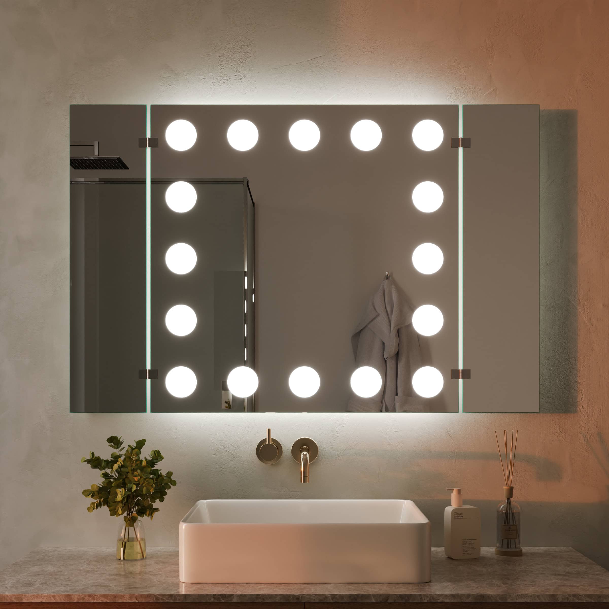 Unser 3-teiliger Klappspiegel eröffnet Ihnen eine neue Perspektive auf Ihre Schönheit und ermöglicht eine perfekte Rundum-Ansicht. Die umlaufende LED-Beleuchtung, deren Leuchtfelder elegant indirekt erhellt werden, wurde speziell für kosmetische Anwendungen optimiert. Sie erzeugt ein professionelles, schattenfreies Licht, das dem natürlichen Tageslicht nachempfunden ist – die ideale Voraussetzung für ein makelloses Make-up und eine präzise Pflegeroutine. Gefertigt aus brillantem, 5mm starkem Kristallspiegel mit sorgfältig geschliffenen und veredelten Kanten, wird dieser Badezimmerspiegel exakt nach Ihren Wünschen auf Maß gefertigt. Mit einer Bautiefe von nur 35mm fügt er sich nicht nur nahtlos in Ihr Raumkonzept ein, sondern wird zum zentralen Designelement, das Funktionalität und glamouröse Ästhetik auf höchstem Niveau vereint.