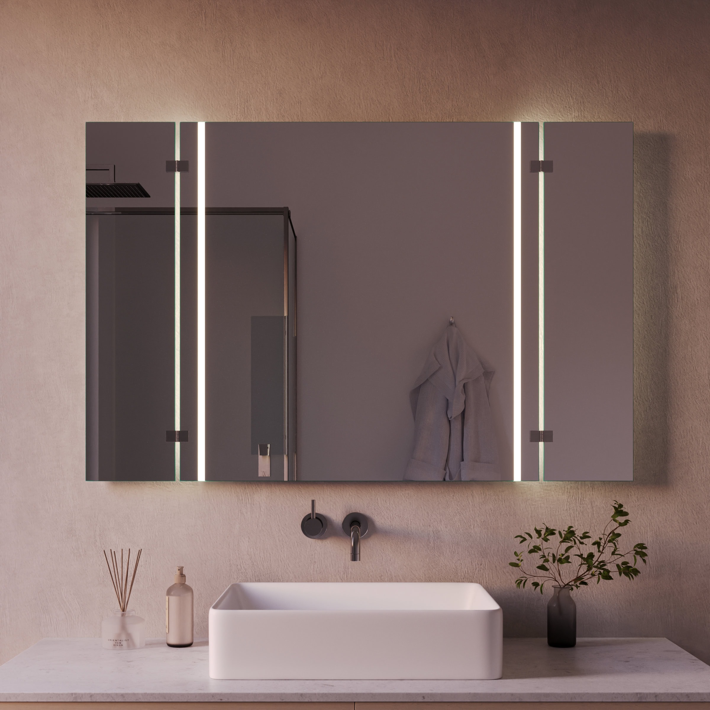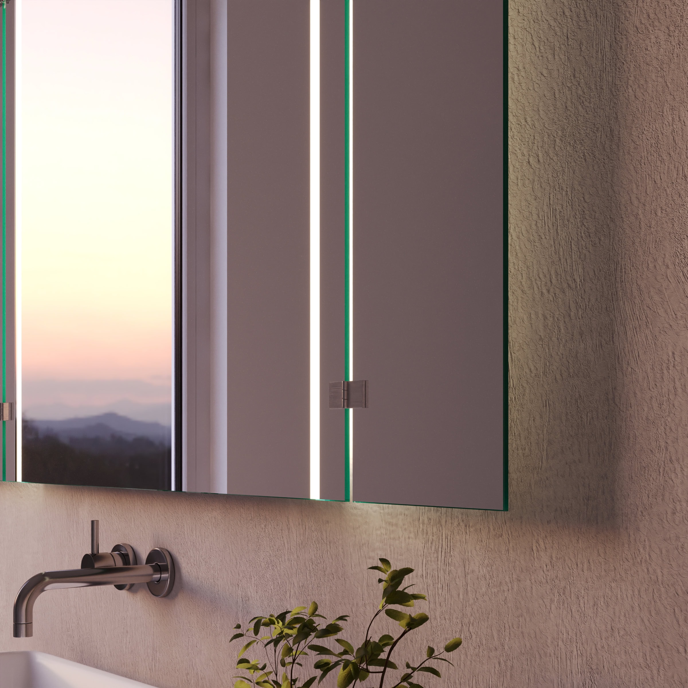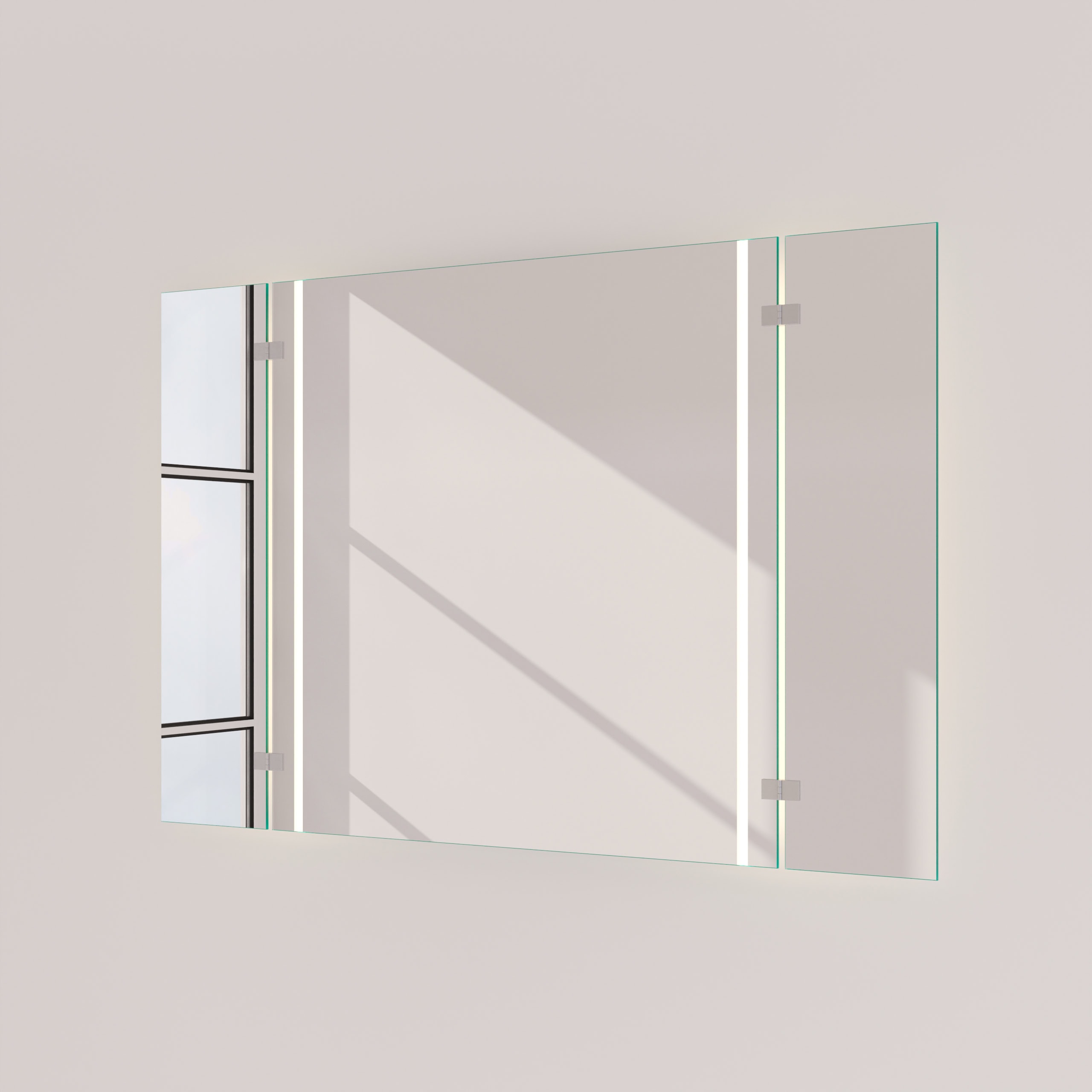 Als individuelle Maßanfertigung fügt sich der dreiteilige Klappspiegel Viela nahtlos in die Architektur Ihres Badezimmers ein und wird zum Herzstück Ihrer täglichen Pflegeroutine. Die seitlich positionierte LED-Beleuchtung ist speziell für kosmetische Anwendungen optimiert und taucht Ihr Gesicht in ein absolut schattenfreies, authentisches Licht. Die Leuchtfelder aus edlem, satiniertem Glas werden indirekt erhellt und erzeugen eine weiche, schmeichelhafte Helligkeit, die eine Atmosphäre der Ruhe und Eleganz schafft. Im ausgeschalteten Zustand präsentieren sich die Flächen in einer dezenten Milchglas-Optik, die das puristische Design unterstreicht. Gefertigt aus 5mm starkem Kristallspiegel mit meisterhaft geschliffenen und veredelten Kanten, bietet dieser Spiegel nicht nur eine brillante Reflexion, sondern dank seiner drei Flügel auch einen vollkommenen Rundumblick für präzises Styling.