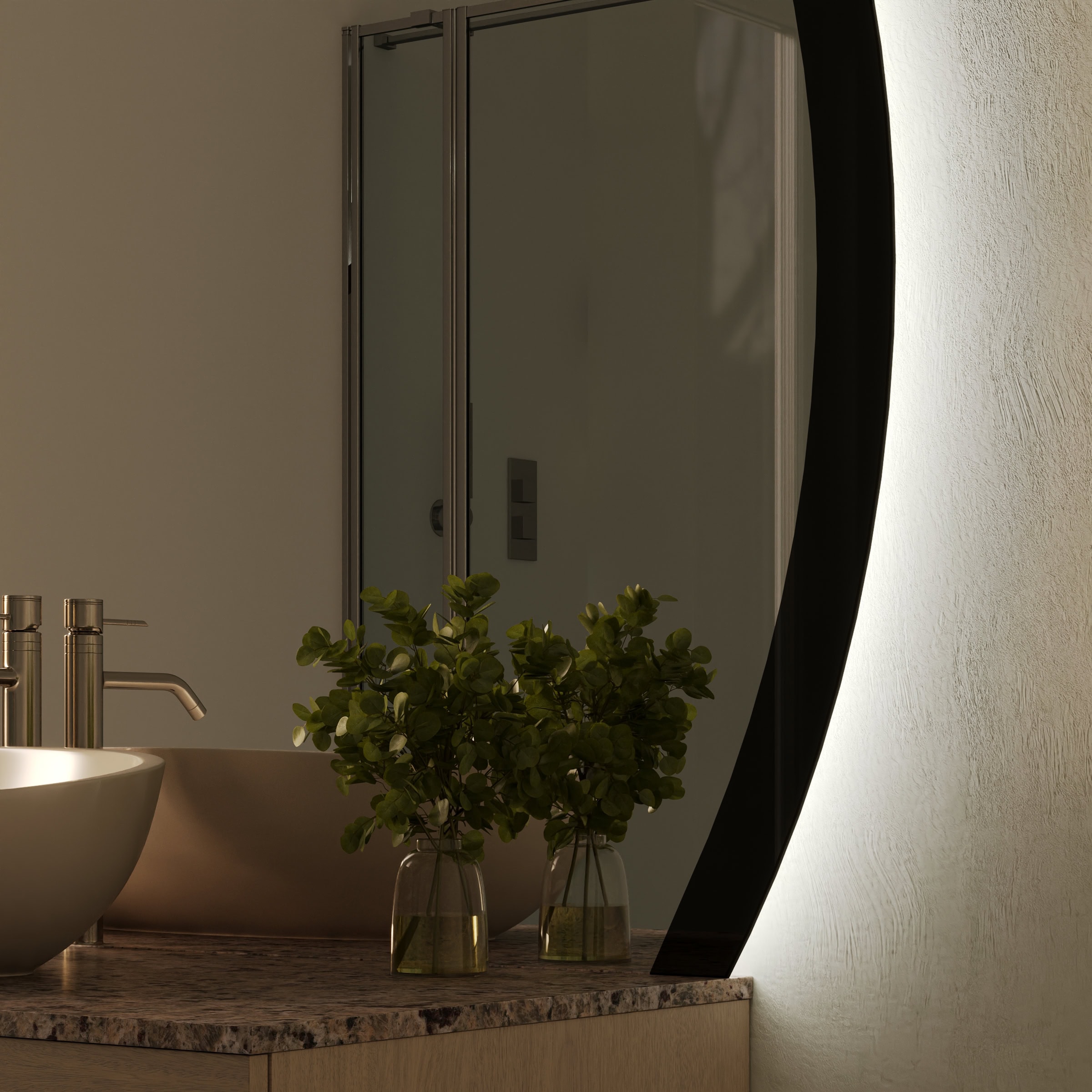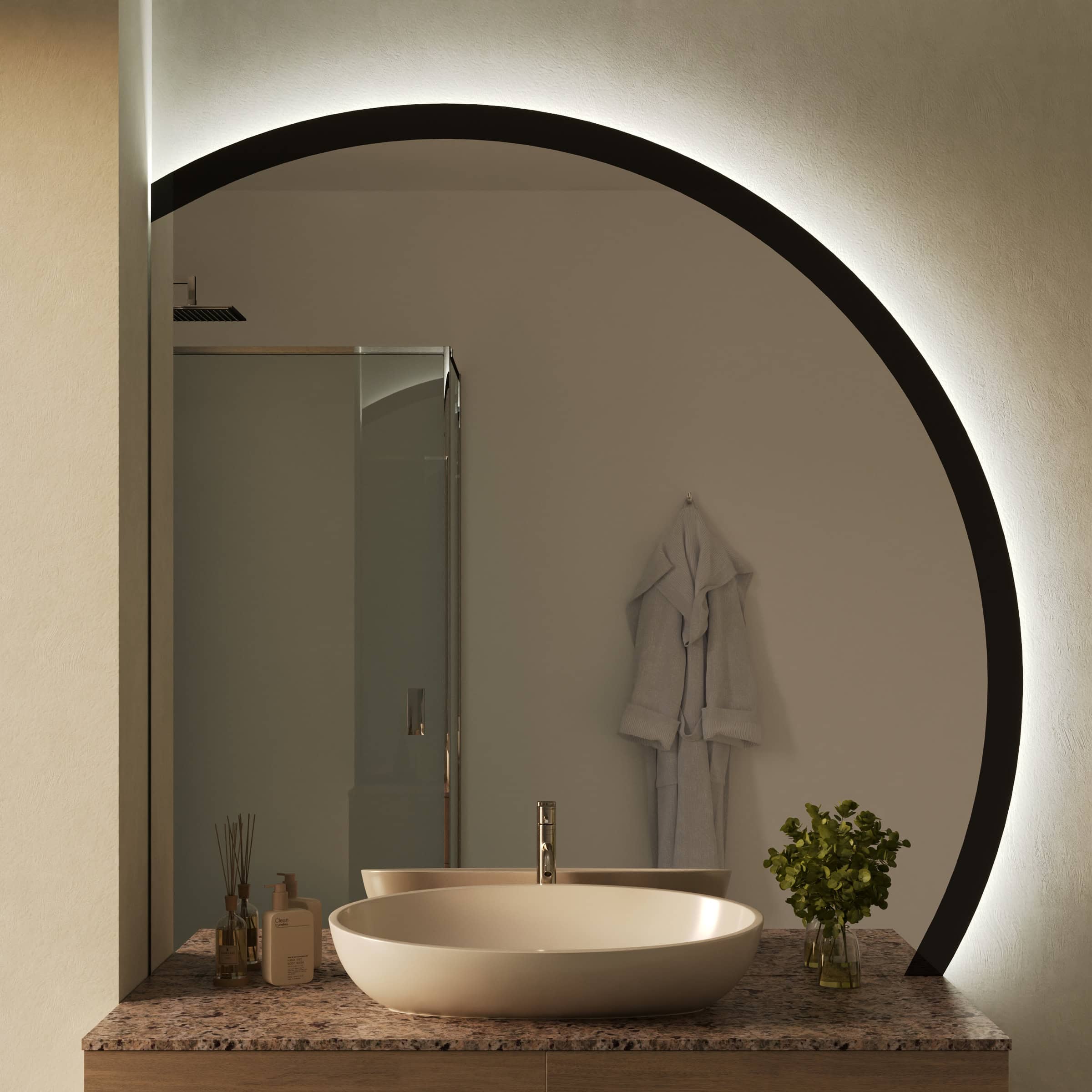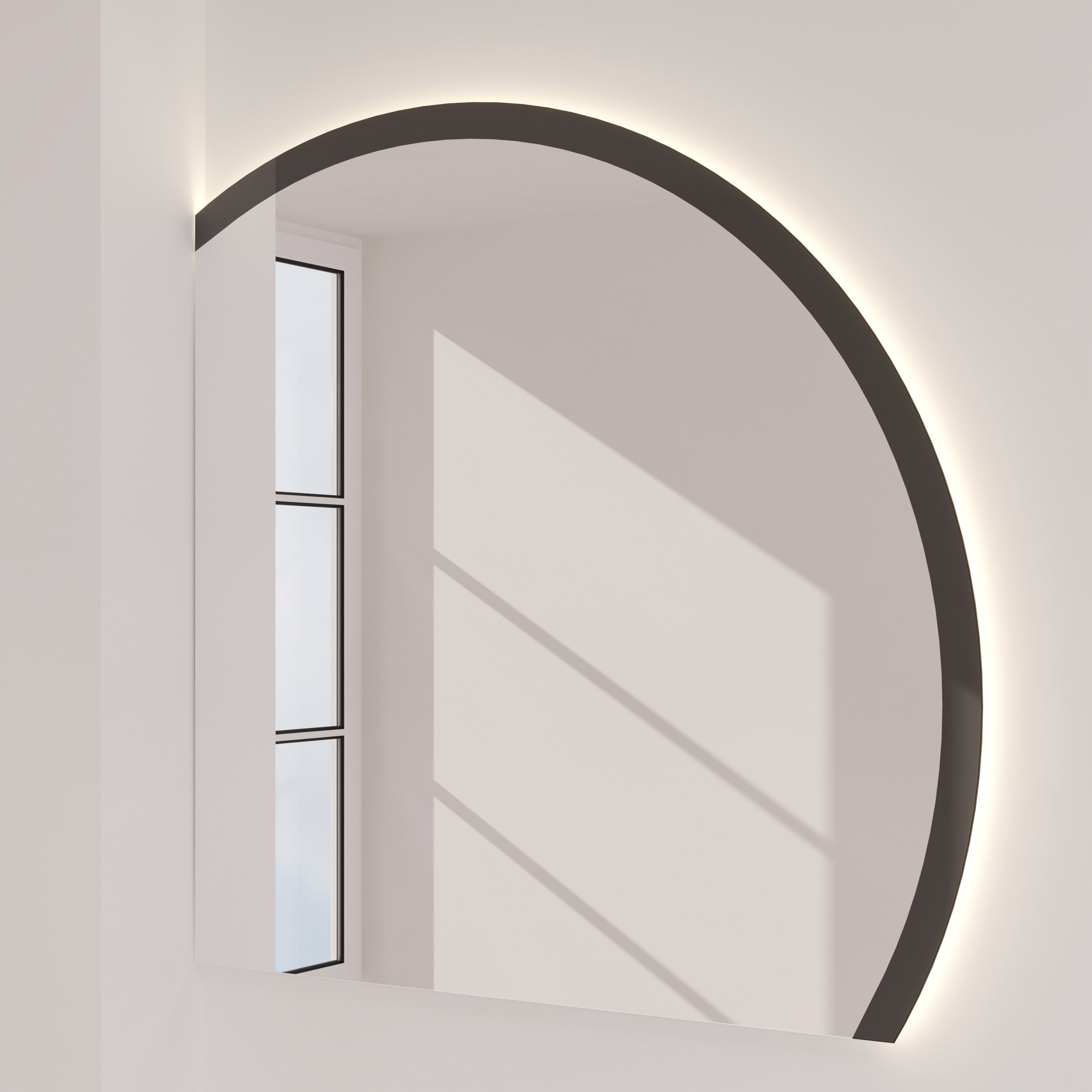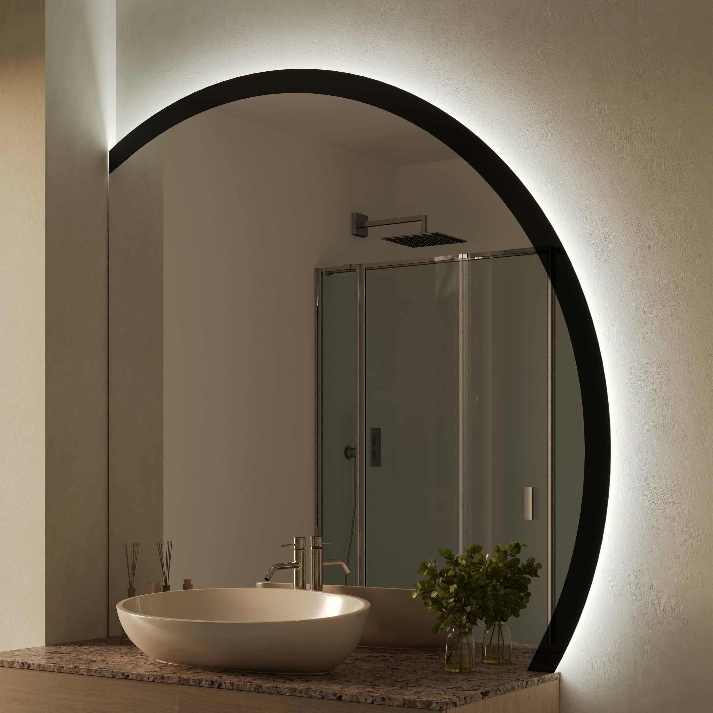 Der Badspiegel Aurea bricht bewusst mit Konventionen. Seine charakteristische, rund angeschnittene Form schafft eine faszinierende Verbindung aus weicher Kontur und klarer Kante – ideal für eine platzsparende und zugleich ausdrucksstarke Wandgestaltung. Umrahmt von einem edlen, tiefschwarzen Glasrahmen, entfaltet der Spiegel eine besondere visuelle Tiefe und wird zum stilvollen Mittelpunkt Ihres Badezimmers. Die umlaufende LED-Hintergrundbeleuchtung lässt den Spiegel scheinbar vor der Wand schweben und taucht den Raum in ein weiches, blendfreies Licht. Diese für kosmetische Anwendungen optimierte Ausleuchtung sorgt für eine schattenfreie und authentische Reflexion. Gefertigt aus 6 mm starkem Kristallspiegelglas mit präzise geschliffenen Kanten, wird jeder Aurea Badspiegel nach Maß gefertigt und fügt sich so millimetergenau in Ihr persönliches Raumkonzept ein.