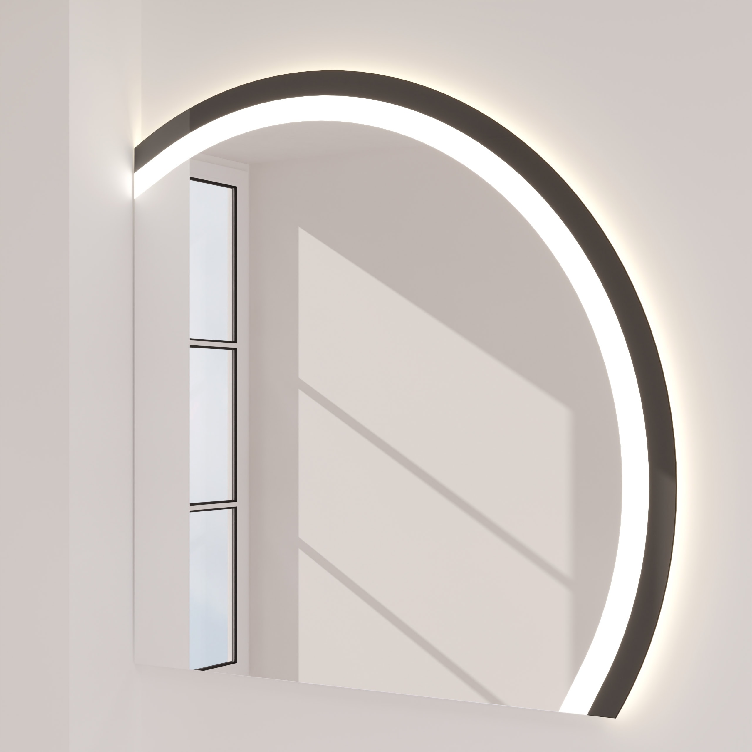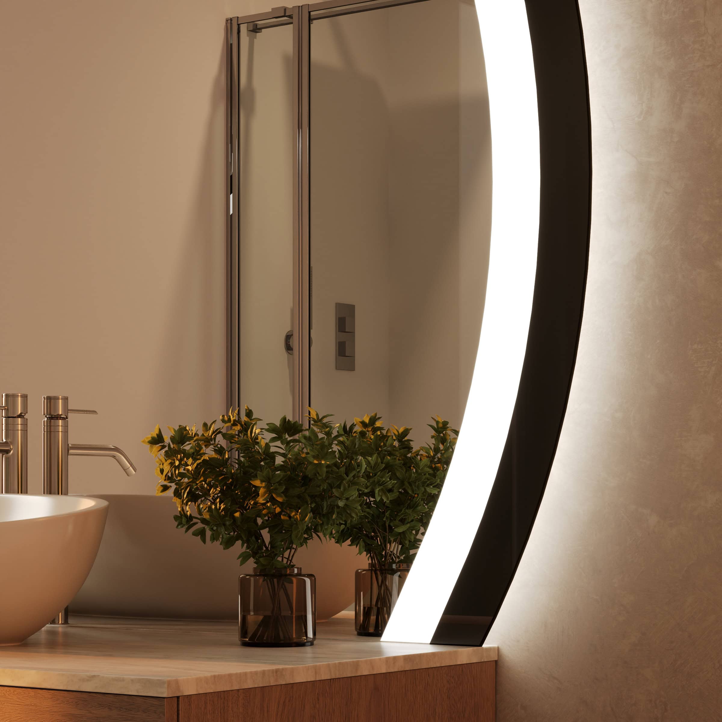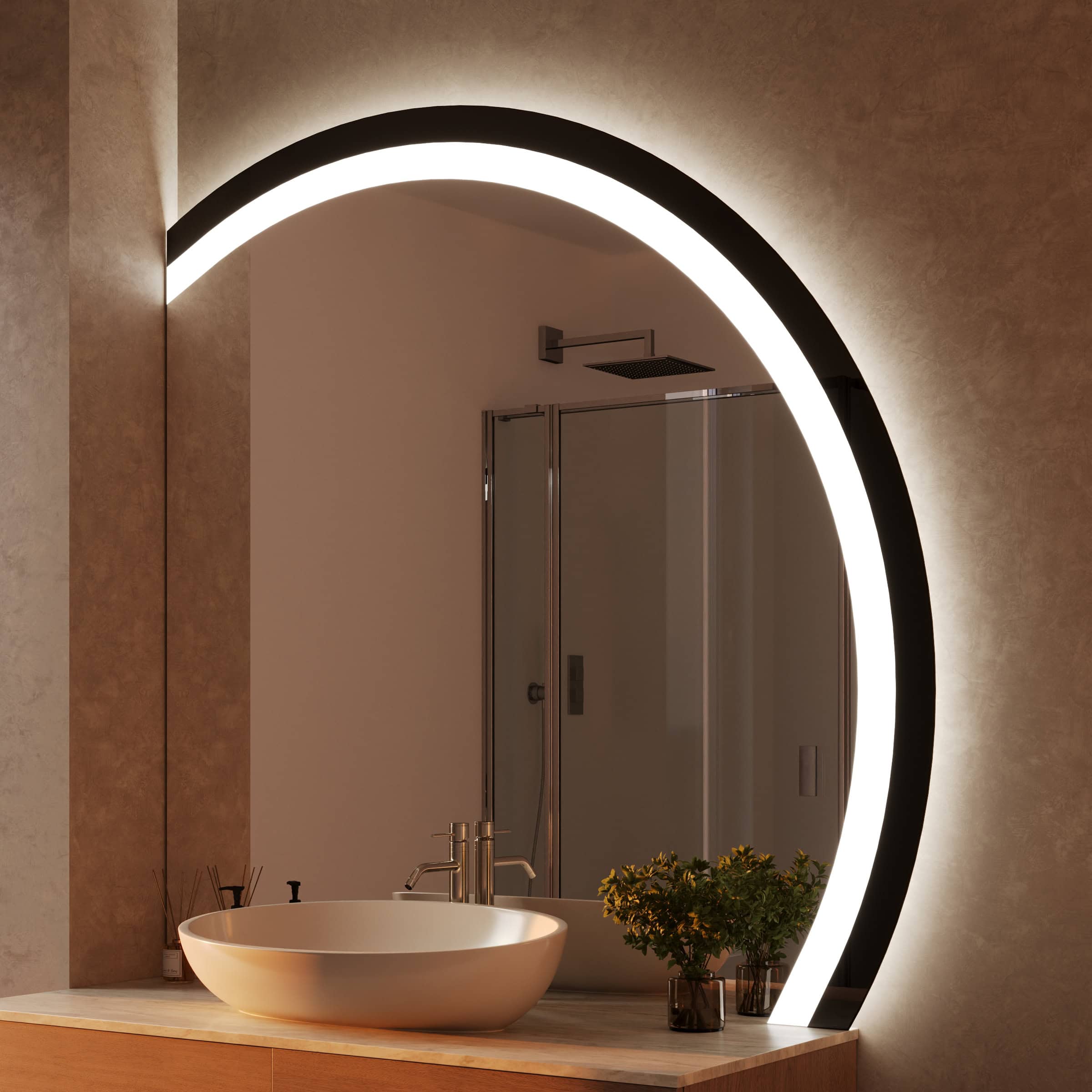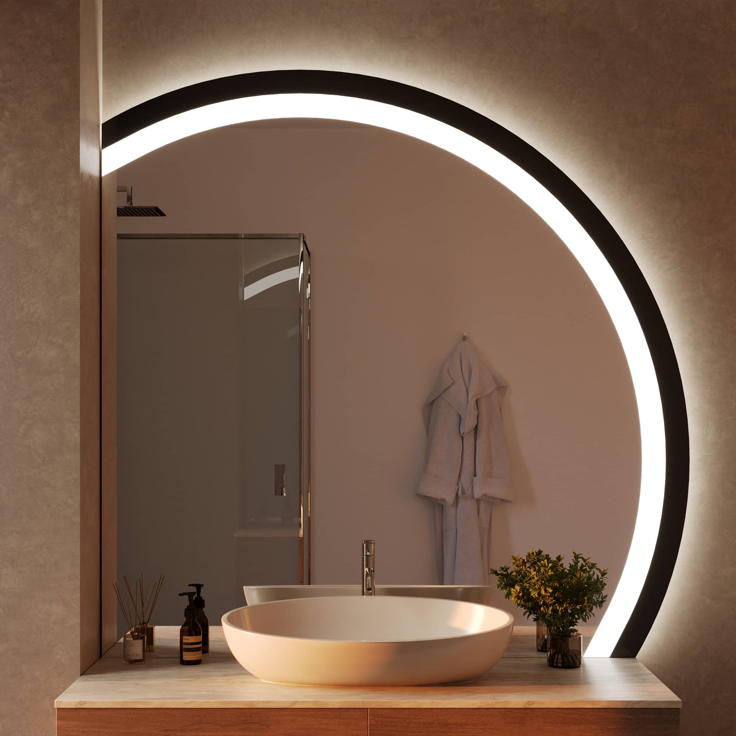 Der Badspiegel Noemi ist mehr als eine Reflexionsfläche – er ist ein zentrales Gestaltungselement für Ihr individuelles Raumkonzept. Dank der Fertigung nach Maß fügt sich seine charakteristische, oben oder unten angeschnittene runde Form millimetergenau in Ihre Badarchitektur ein. Der Rahmen aus tiefschwarzem Glas setzt einen markanten, eleganten Akzent und unterstreicht die Wertigkeit des 6mm starken Kristallspiegels. Umgeben wird die polierte Spiegelfläche von einem rundherum laufenden Lichtfeld, dessen satinierte Oberfläche im ausgeschalteten Zustand an edles Milchglas erinnert. Aktiviert, entfaltet die LED-Beleuchtung ihre volle Stärke: Das speziell für kosmetische Anwendungen optimierte Licht leuchtet Ihr Gesicht absolut schattenfrei und authentisch aus – für präzise Ergebnisse bei der täglichen Pflegeroutine. Die indirekte Lichterhellung schafft dabei eine angenehme, blendfreie Atmosphäre und macht den Spiegel zum leuchtenden Mittelpunkt Ihres Badezimmers.
