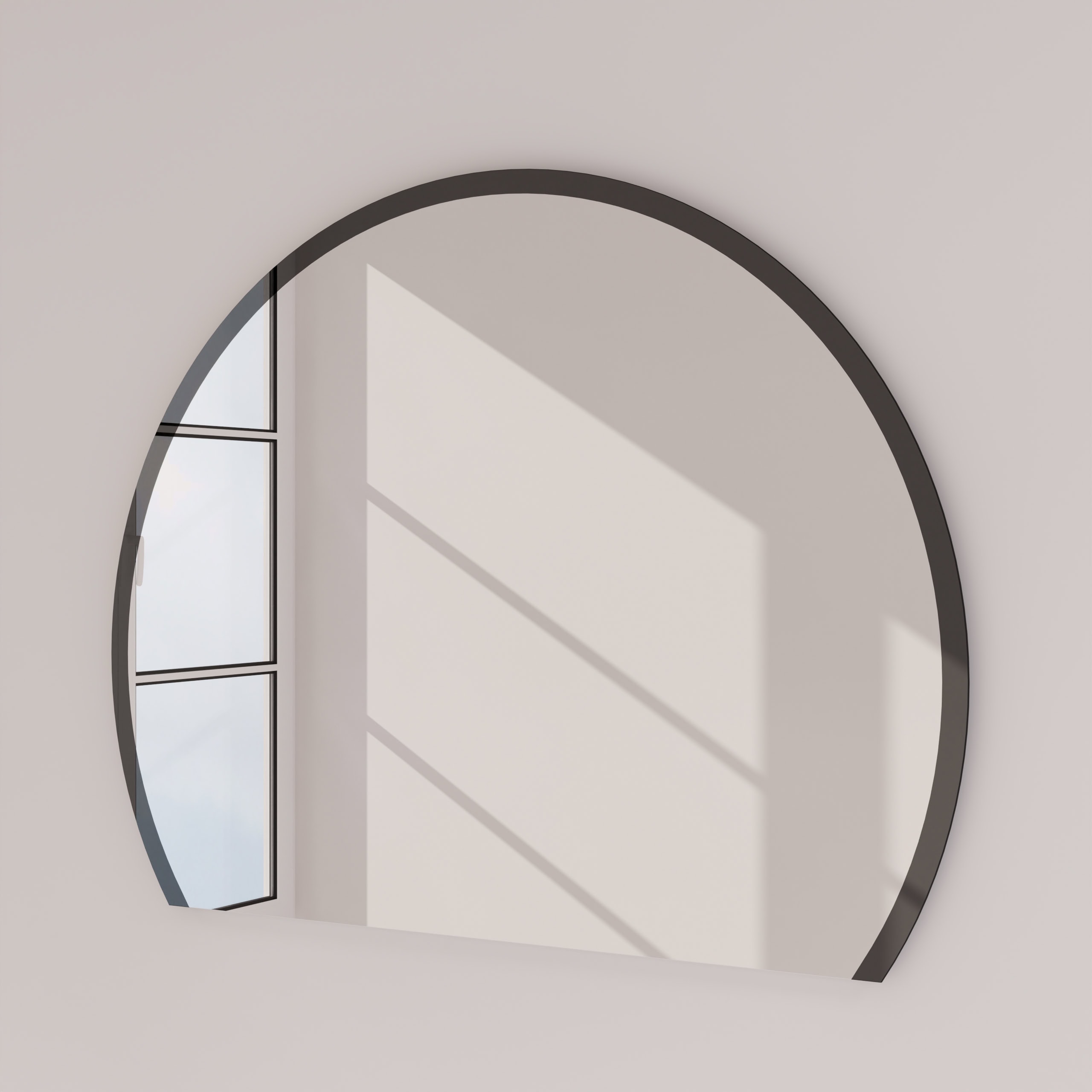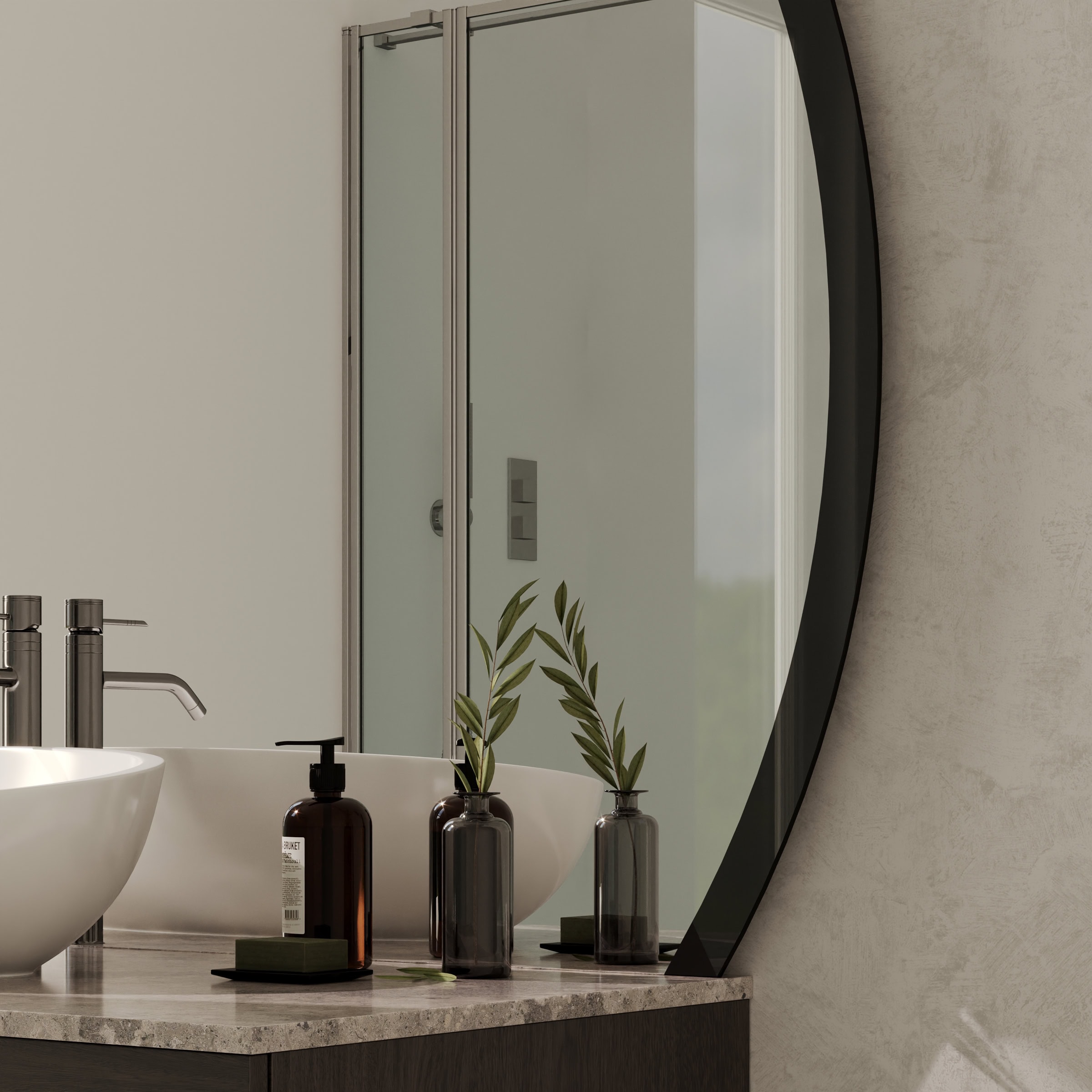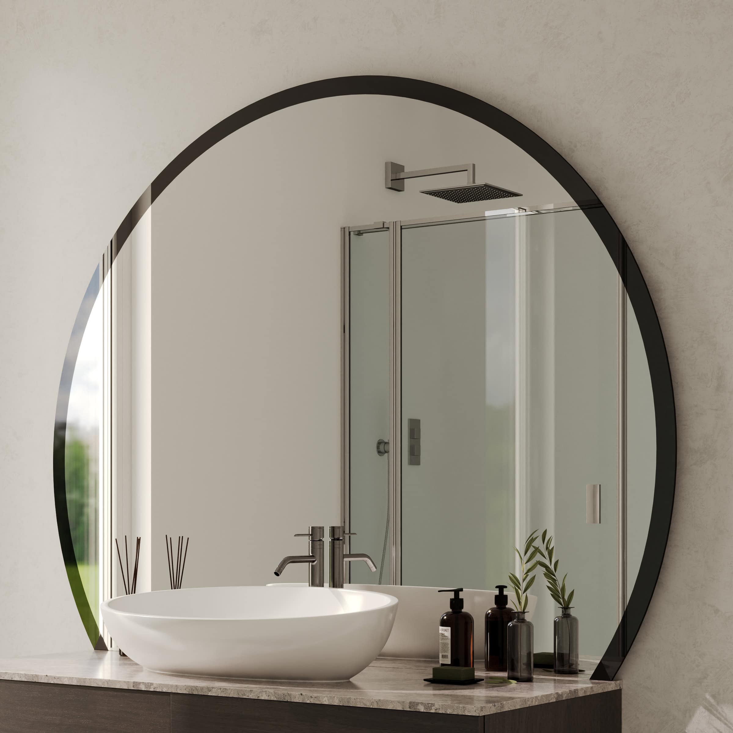 Der Badspiegel Cristal bricht mit Konventionen und wird zum zentralen Gestaltungselement in Ihrem anspruchsvollen Interieur. Seine charakteristische, angeschnittene runde Form ist eine stilvolle Lösung, die sich perfekt an Wände oder Waschtische anfügt und dabei eine einzigartige visuelle Spannung erzeugt. Der 40 mm breite Rahmen aus tiefschwarzem Glas fasst die Spiegelfläche elegant ein und schafft einen markanten Kontrast, der Tiefe und Charakter verleiht. Gefertigt aus 6 mm starkem Kristallspiegel, garantiert er eine brillante, unverfälschte Reflexion und eine beeindruckende Langlebigkeit. Dank der individuellen Maßanfertigung passt sich dieser exklusive Wandspiegel präzise Ihren räumlichen Gegebenheiten an. Jede Kante ist sorgfältig geschliffen und veredelt – ein Detail, das die hohe handwerkliche Qualität unterstreicht und für eine makellose Optik sorgt.