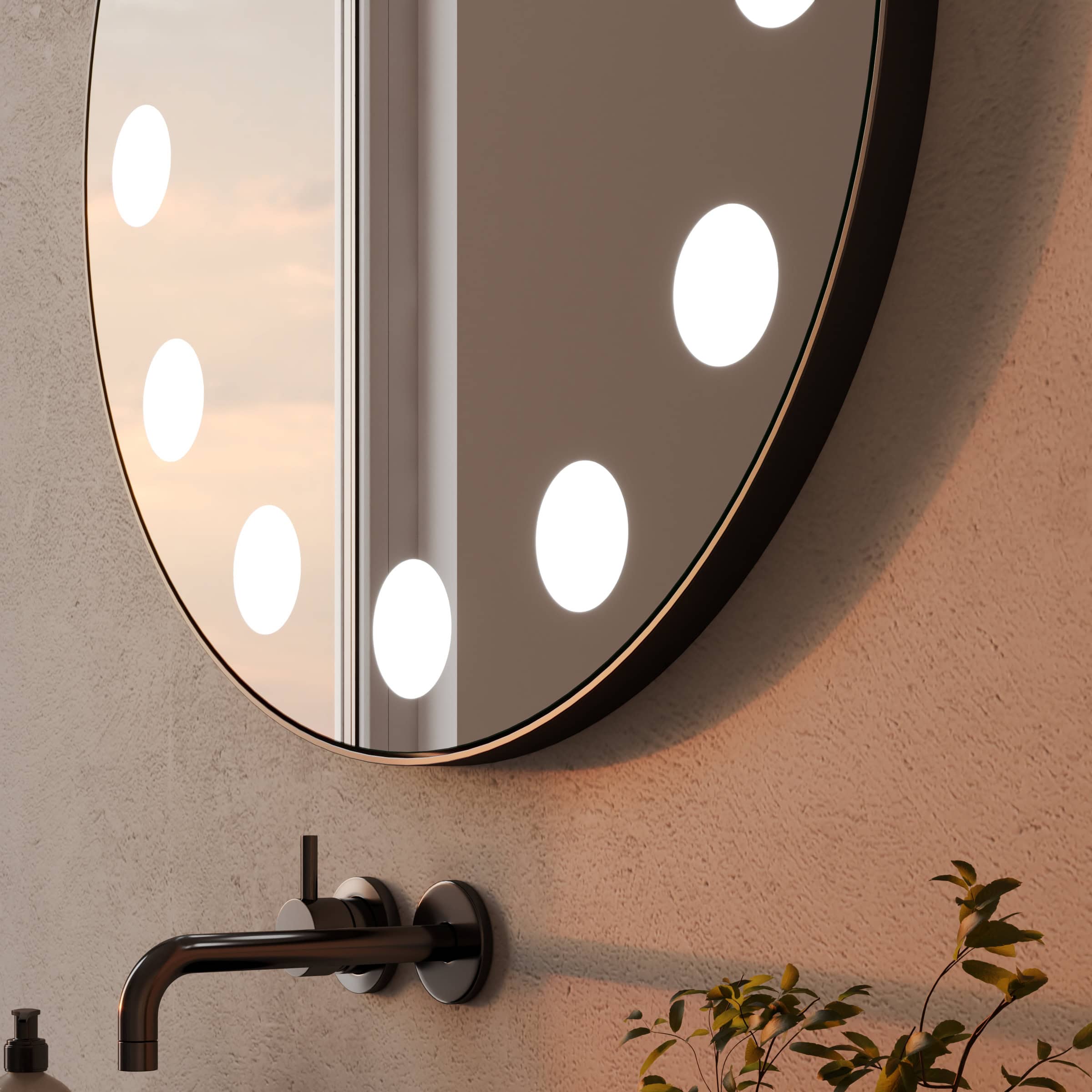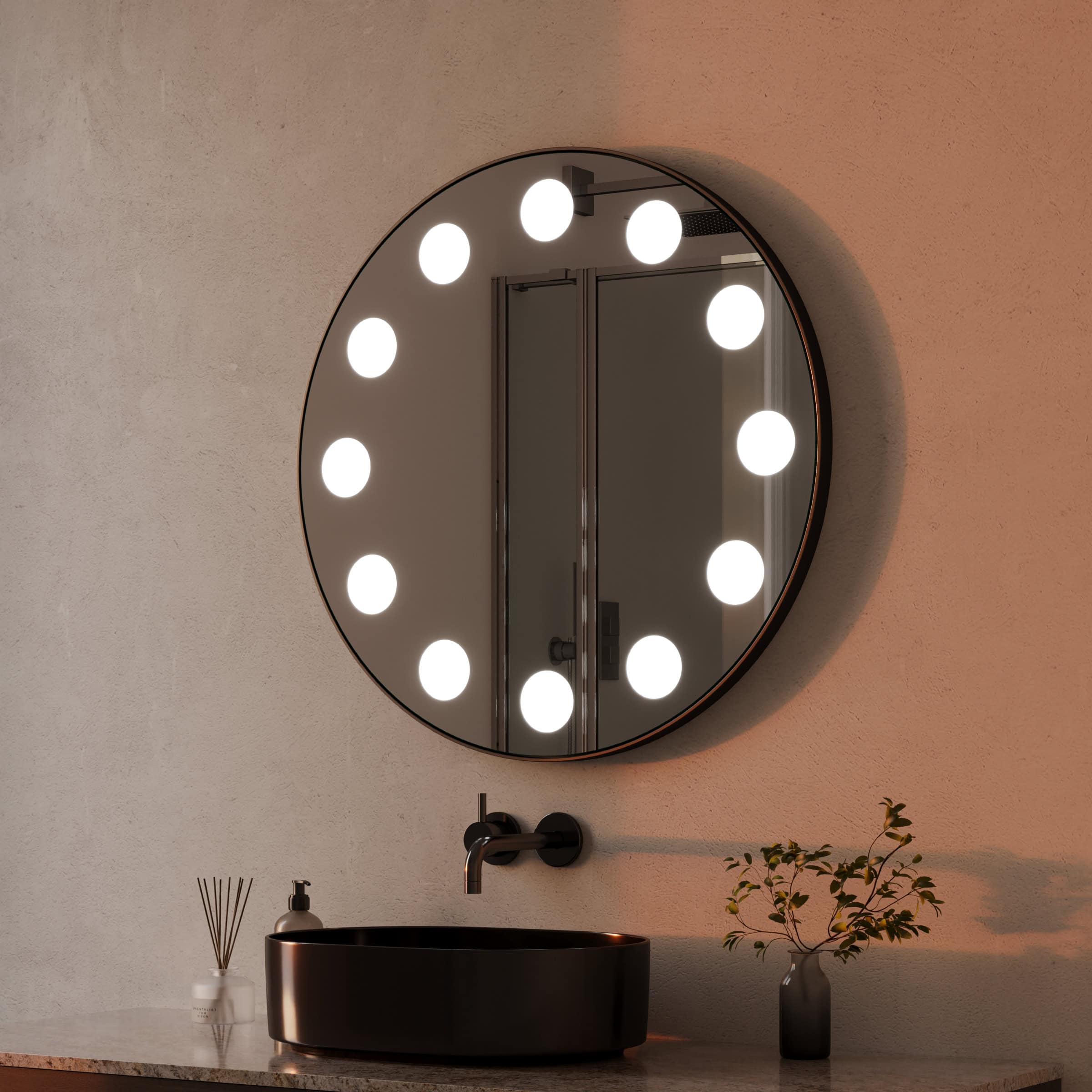Der Badspiegel Hollywood ist mehr als eine Reflexionsfläche; er ist ein zentrales Gestaltungselement, das Ihrem Raum Charakter und Tiefe verleiht. Sein Herzstück ist die umlaufende LED-Beleuchtung, die durch indirekt erhellte Leuchtfelder eine sanfte, schattenfreie Aura um den Spiegel legt. Dieses für kosmetische Anwendungen optimierte Licht gibt Hauttöne authentisch wieder und schafft ideale Bedingungen für Ihre tägliche Pflegeroutine. Gefertigt aus 6mm starkem Kristallspiegelglas, garantiert er eine brillante, verzerrungsfreie Sicht. Der filigrane, mattschwarze Metallrahmen fasst die runde Form präzise ein und setzt einen klaren, architektonischen Akzent. Als individuelle Maßanfertigung passt sich dieser runde Badspiegel mit Rahmen exakt Ihren Wünschen und den Gegebenheiten Ihres Badezimmers an – ein Statement für zeitlose Eleganz und kompromisslose Qualität.