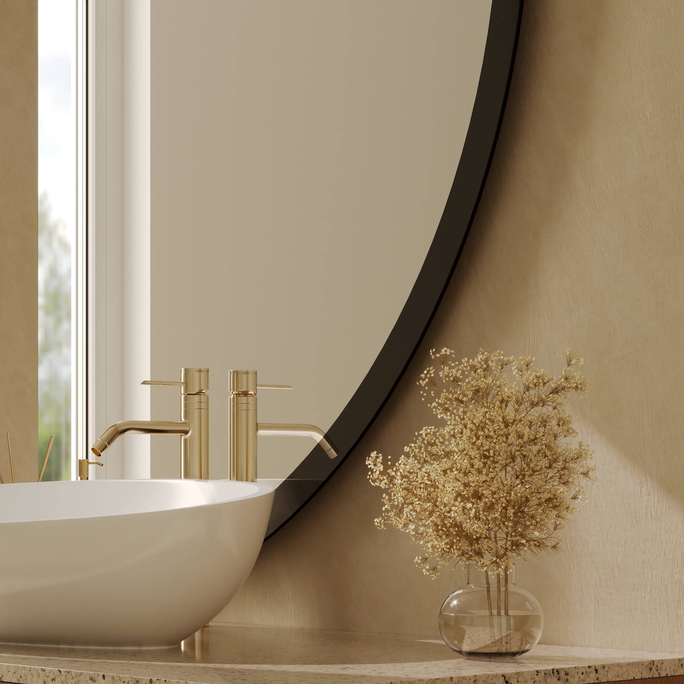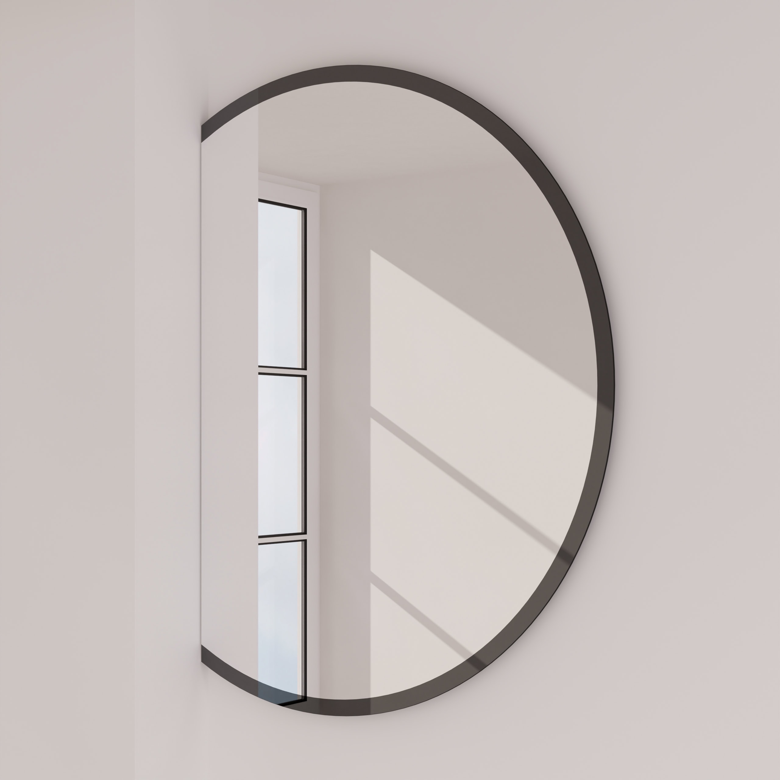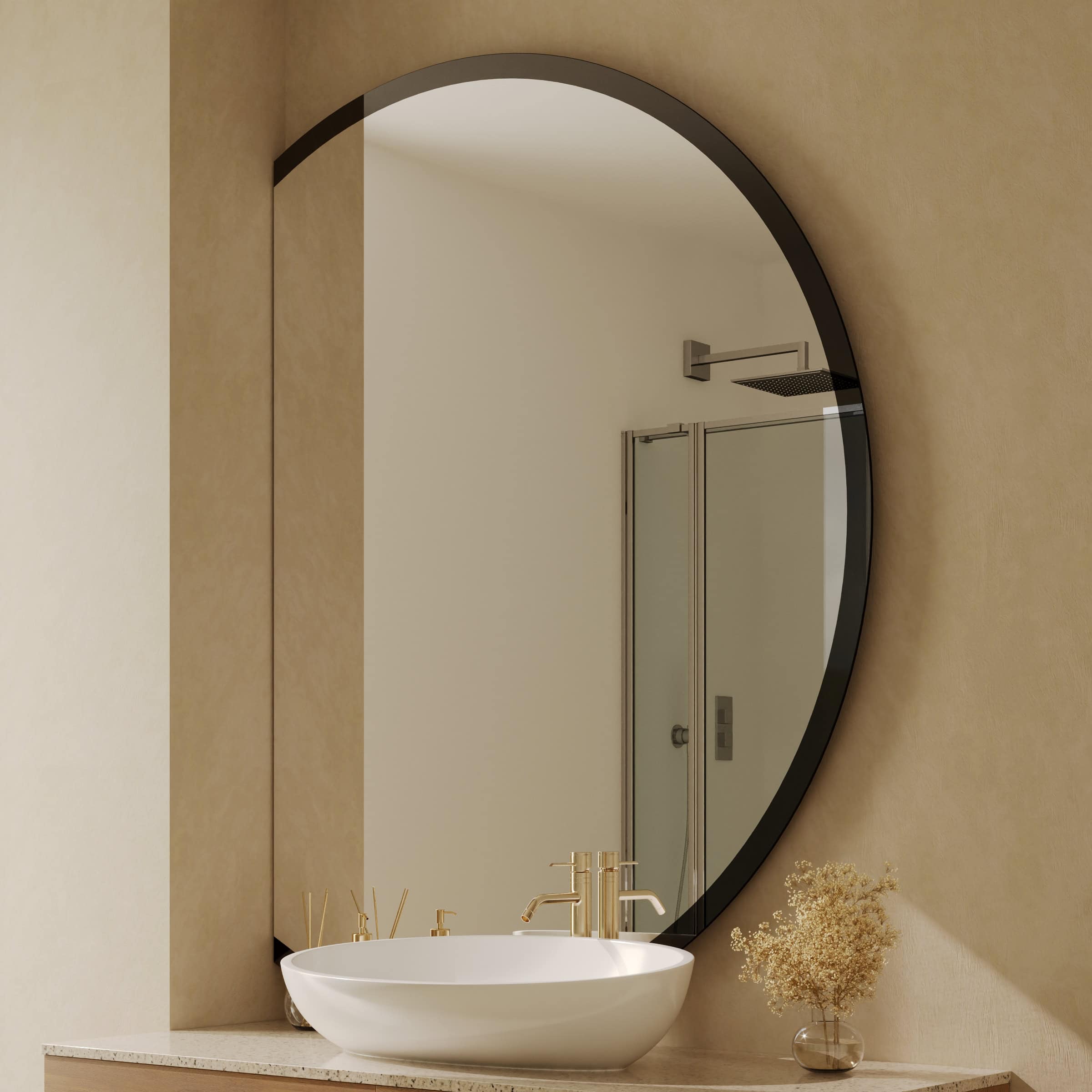 Der Badspiegel Cristal ist mehr als nur eine Spiegelfläche – er ist ein Statement für anspruchsvolles Design. Seine charakteristische, seitlich angeschnittene Form durchbricht bewusst die Symmetrie und verleiht jeder Wand eine faszinierende, skulpturale Präsenz. Gefertigt aus einem 6 mm starken Kristallspiegel, garantiert er eine außergewöhnlich klare und brillante Reflexion. Die Kanten sind sorgfältig geschliffen und veredelt, ein Detail, das die hohe Verarbeitungsqualität unterstreicht. Ein besonderes Highlight ist der 40 mm breite Rahmen, der ebenfalls aus tiefschwarzem Glas besteht. Diese nahtlose Materialeinheit schafft eine elegante, optische Tiefe und einen raffinierten Kontrast. Dank der individuellen Maßanfertigung integriert sich dieser runde Design-Spiegel perfekt in Ihr Raumkonzept und wird zum unverkennbaren Mittelpunkt Ihres Badezimmers.
