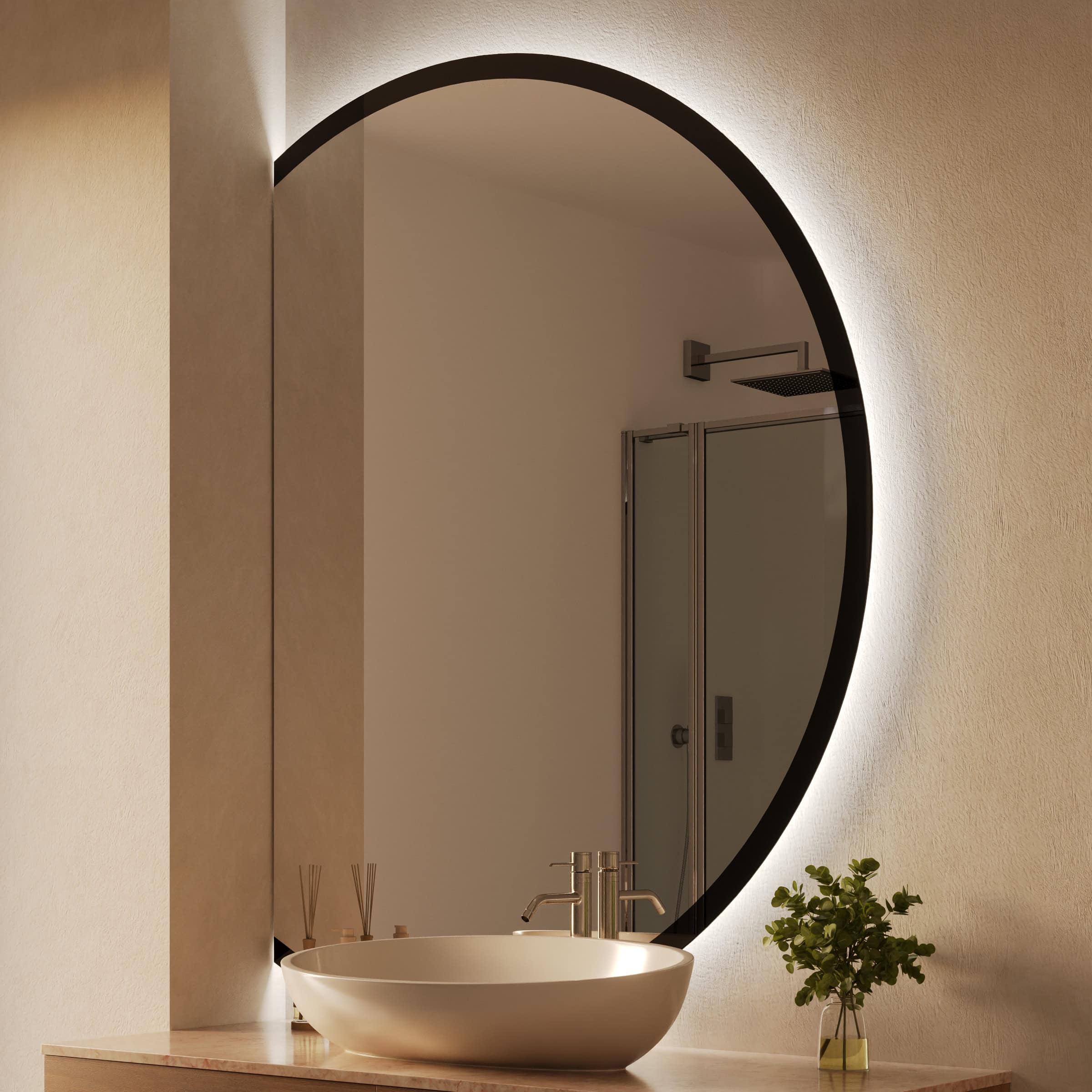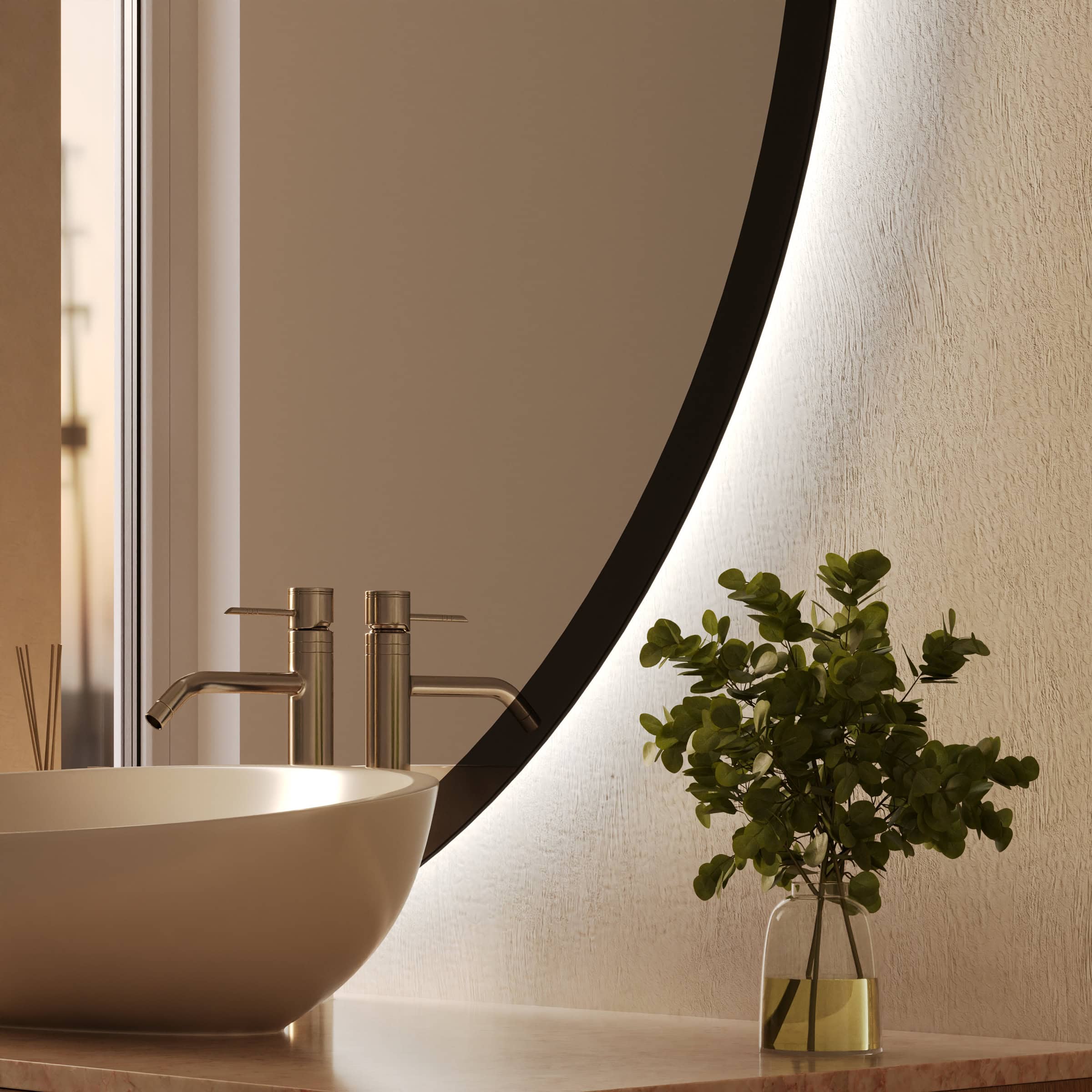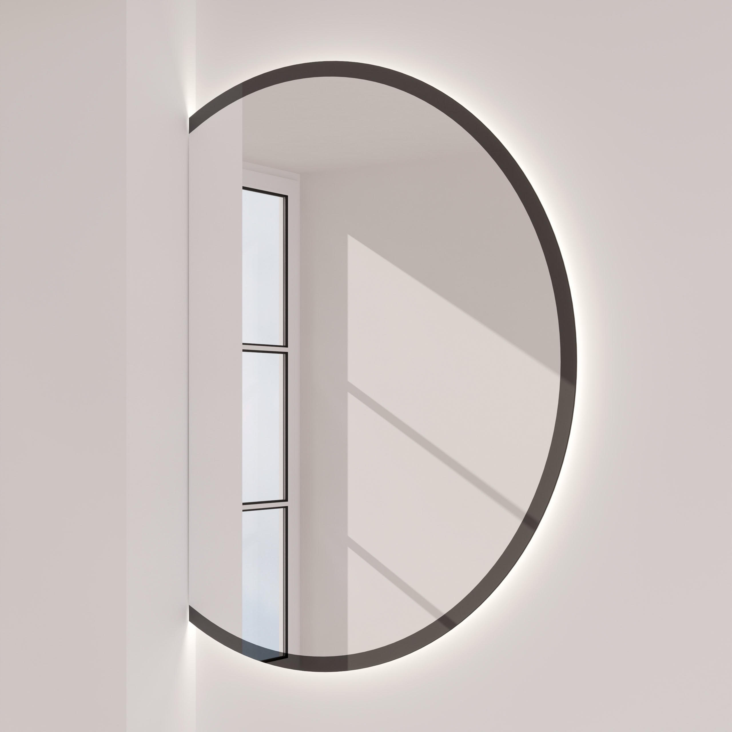 Der Badspiegel Aurea bricht bewusst mit Konventionen. Seine charakteristische, seitlich angeschnittene runde Form ist ein klares Bekenntnis zu individuellem Stil und architektonischer Klarheit, ideal für anspruchsvolle Raumkonzepte. Eingefasst von einem markanten, 40 mm breiten Rahmen aus tiefschwarzem Glas, entsteht ein beeindruckendes Designobjekt. Der Rahmen verschmilzt optisch mit der brillanten Oberfläche des 6 mm starken Kristallspiegels, dessen Kanten sorgfältig geschliffen und veredelt sind. Die umlaufende LED-Hintergrundbeleuchtung taucht die Wand hinter dem Spiegel in ein sanftes, schwebendes Licht und schafft eine Atmosphäre der Ruhe und Tiefe. Gleichzeitig ist die Lichtstärke präzise für die kosmetische Anwendung optimiert und leuchtet Ihr Gesicht schattenfrei und authentisch aus. Als individuelle Maßanfertigung wird dieser runde Spiegel mit Beleuchtung passgenau für Ihr Ambiente gefertigt und wird so zum unverwechselbaren Herzstück Ihres Badezimmers.