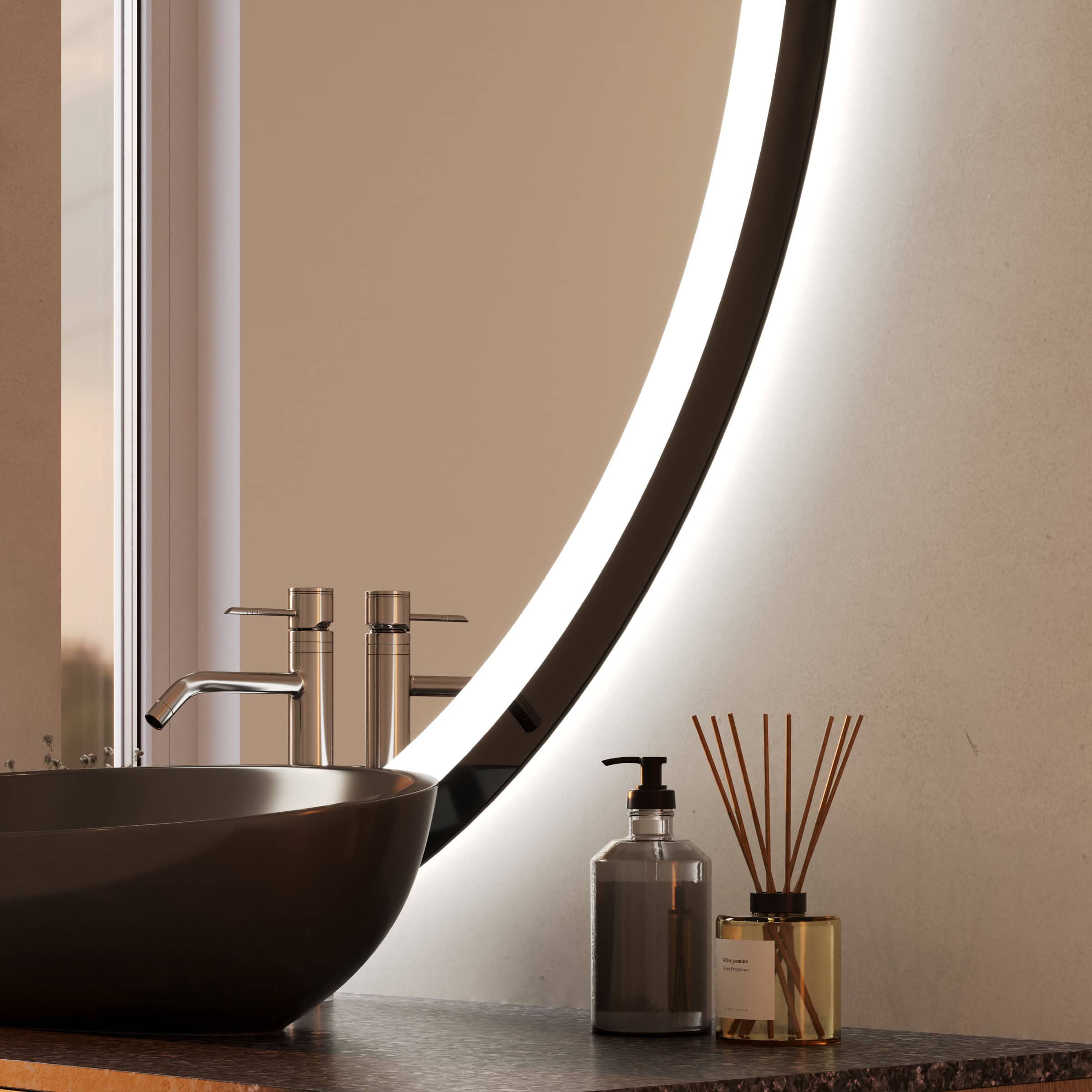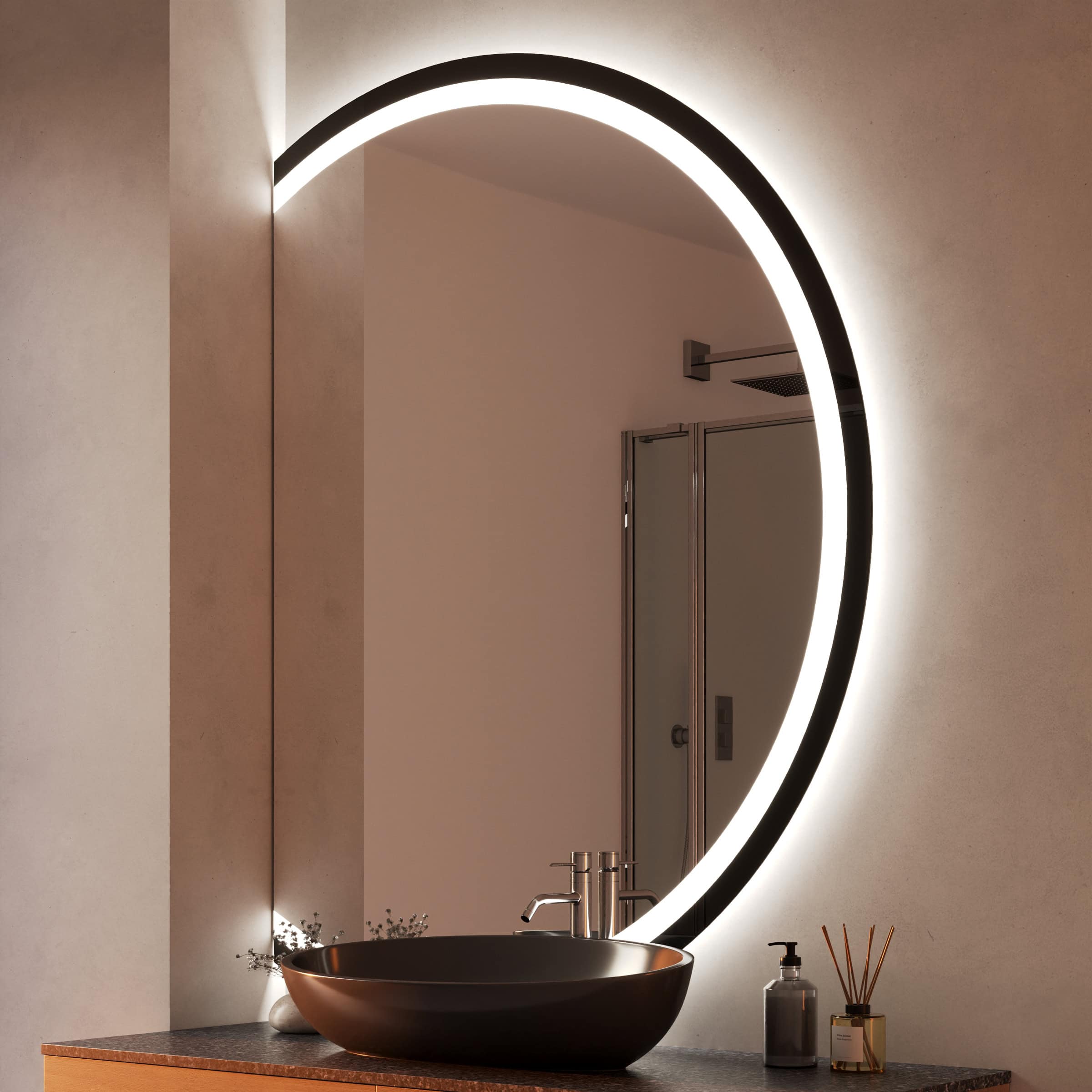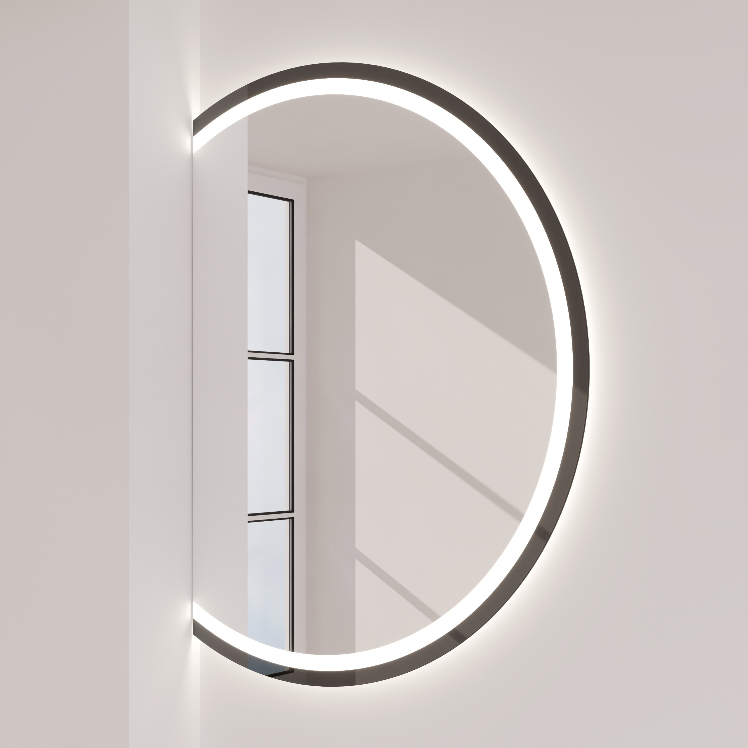 Der runde Badspiegel Noemi ist mehr als nur eine Reflexionsfläche – er ist ein skulpturales Designobjekt. Seine charakteristische, seitlich angeschnittene Form bricht mit Konventionen und fügt sich als architektonischer Akzent perfekt in Nischen oder an gerade Wandabschlüsse ein. Gefertigt als individuelle Maßanfertigung aus brillantem, 6 mm starkem Kristallspiegelglas, garantiert er eine makellose und verzerrungsfreie Ansicht. Der edle, 40 mm breite Rahmen aus schwarz hinterlackiertem Glas verleiht dem Spiegel eine markante Tiefe und eine zeitlose Eleganz. Die umlaufende LED-Beleuchtung wurde speziell für die kosmetische Anwendung optimiert und leuchtet Ihr Gesicht schattenfrei und authentisch aus. Im ausgeschalteten Zustand präsentieren sich die 4 cm breiten Leuchtfelder als dezent satinierte Flächen, die an Milchglas erinnern. Aktiviert, entfaltet sich ein indirektes, sanftes Licht, das eine angenehme und luxuriöse Atmosphäre schafft, ohne zu blenden. Die präzise geschliffenen und veredelten Kanten zeugen von höchster Handwerkskunst und vollenden das anspruchsvolle Gesamtbild.