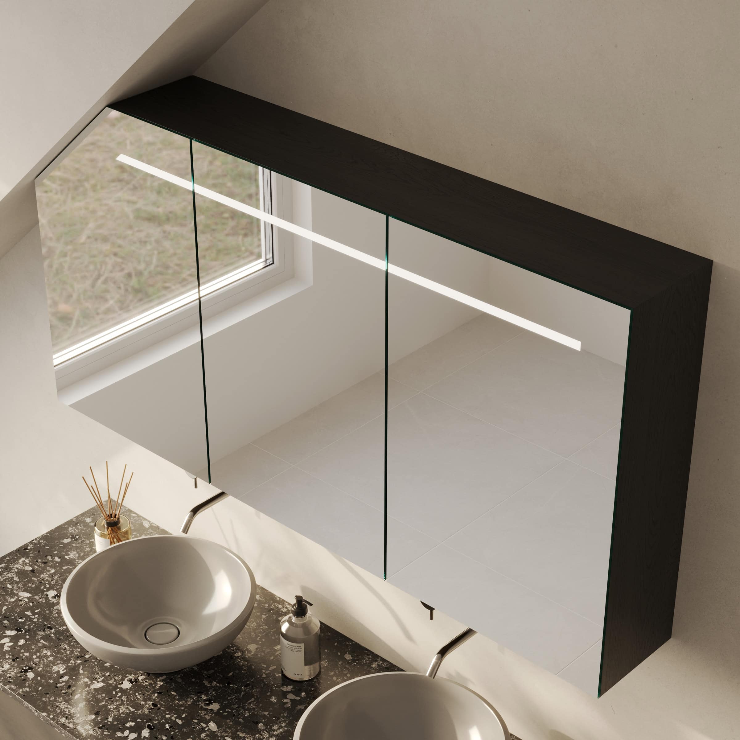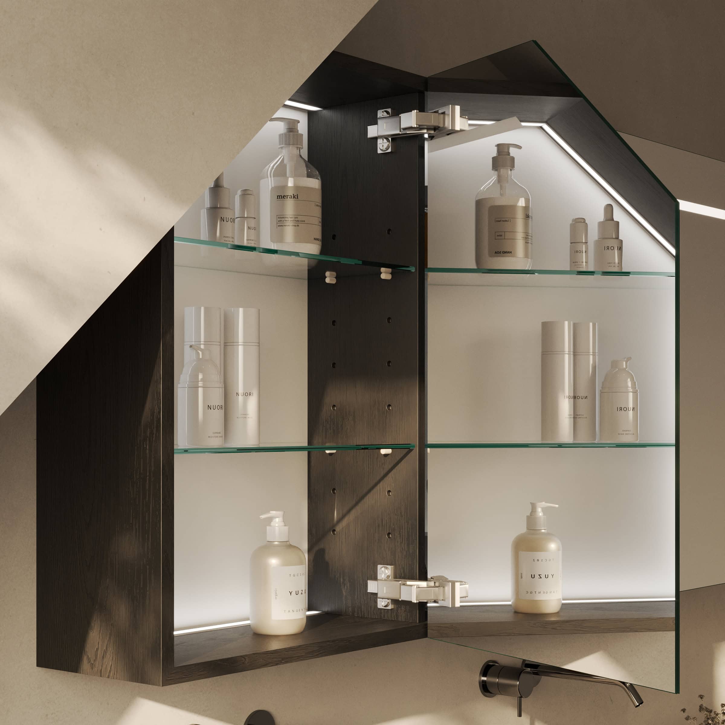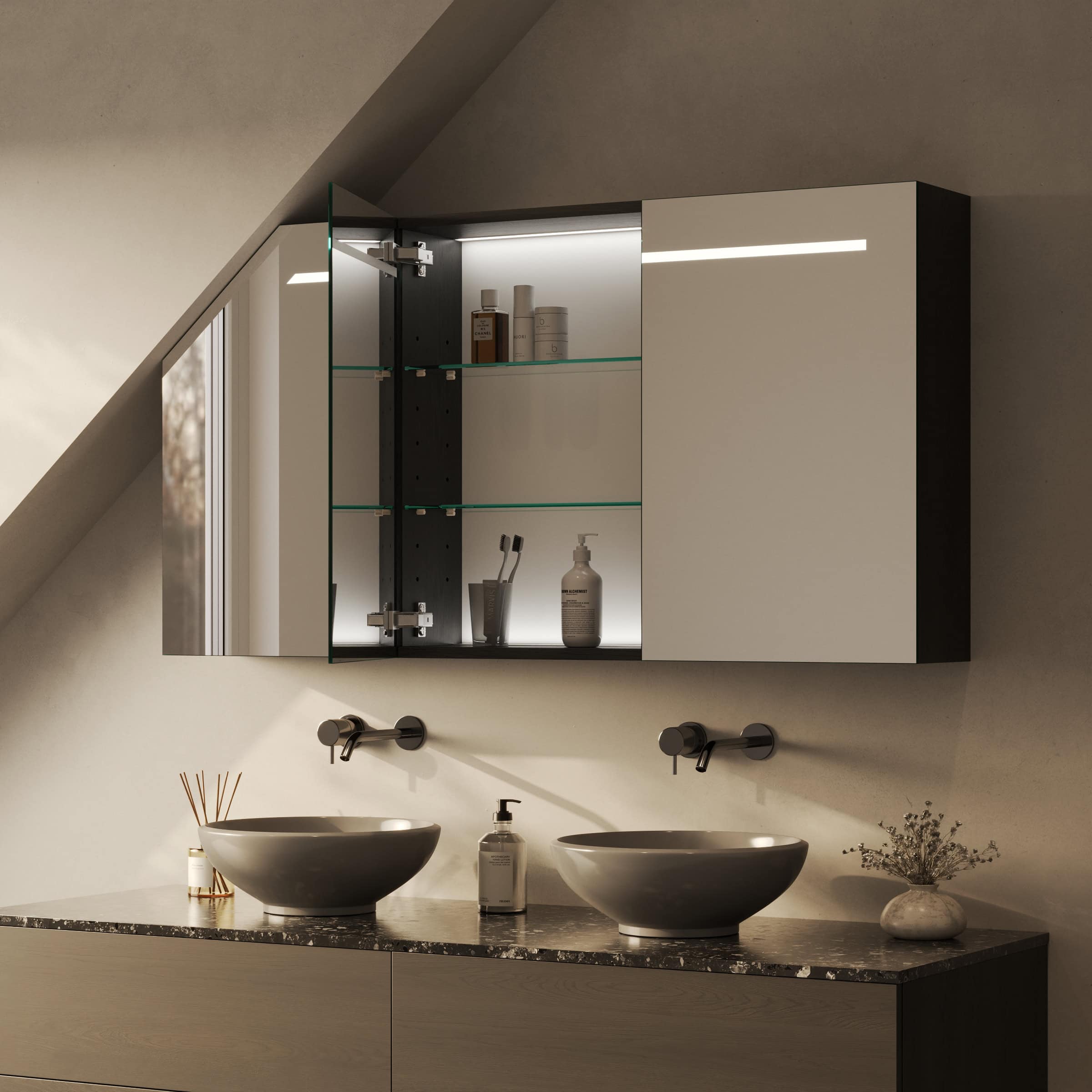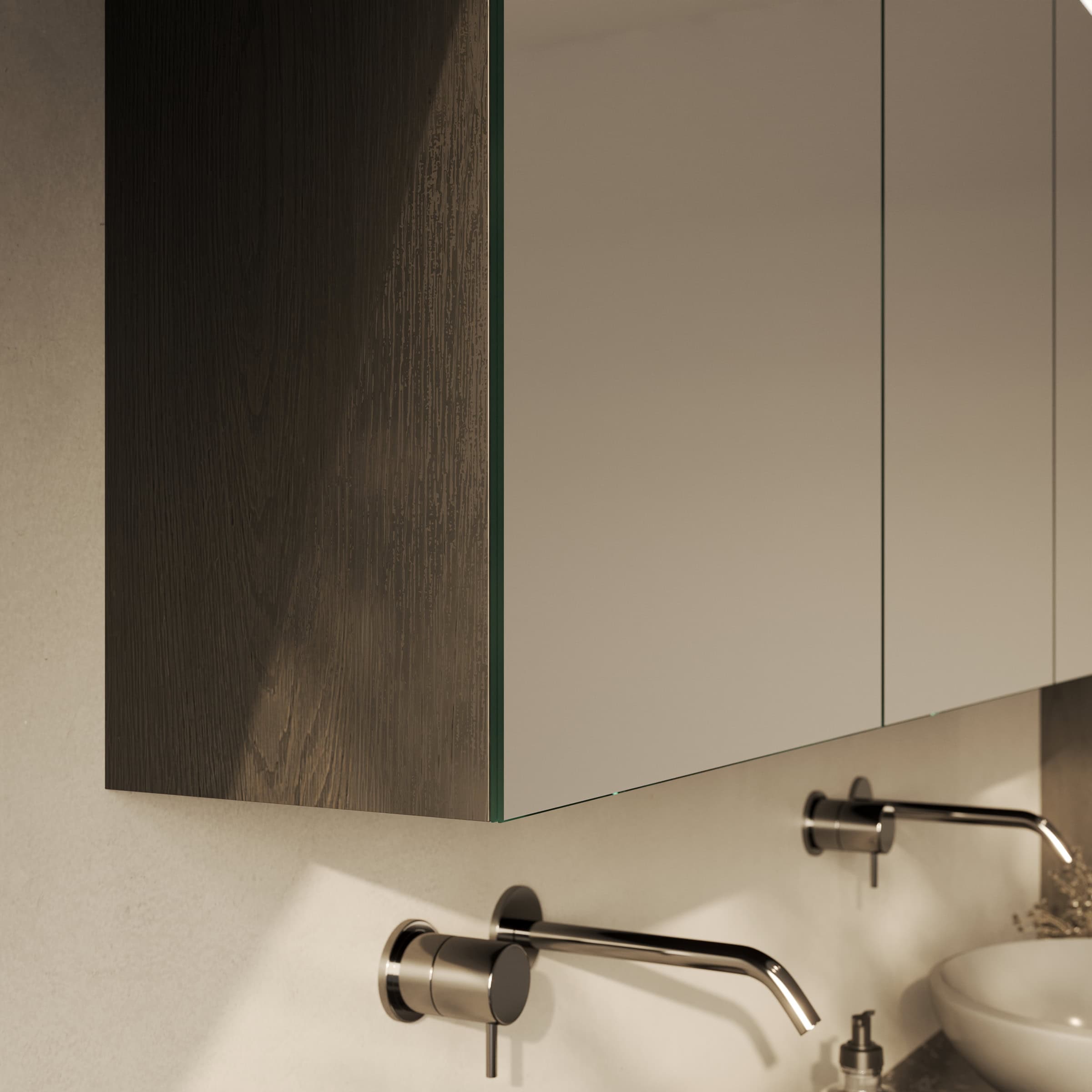 Der Spiegelschrank Modena ist die Antwort auf anspruchsvolle Raumsituationen. Exakt nach Ihren Maßen gefertigt, fügt er sich millimetergenau in Ihr Badezimmer mit Dachschräge ein und schafft so wertvollen Stauraum, wo Standardlösungen versagen. Das Herzstück bildet die integrierte LED-Beleuchtung im oberen Bereich. Ihr Licht ist speziell für kosmetische Anwendungen optimiert und erhellt Ihr Gesicht schattenfrei und authentisch. Dabei tritt das Licht sanft durch satinierte Glasflächen aus, die im ausgeschalteten Zustand wie edles Milchglas wirken und eingeschaltet eine homogene, indirekte Leuchtfläche bilden. Die Türen aus brillantem, 6 mm starkem Kristallspiegel mit veredelten Kanten gleiten dank hochwertiger Blum-Scharniere sanft und geräuschlos zu. Im Inneren offenbart der robuste Korpus aus 19 mm starken Holzdekorplatten eine durchdachte Aufteilung, die Sie ganz nach Ihren Wünschen konfigurieren können.