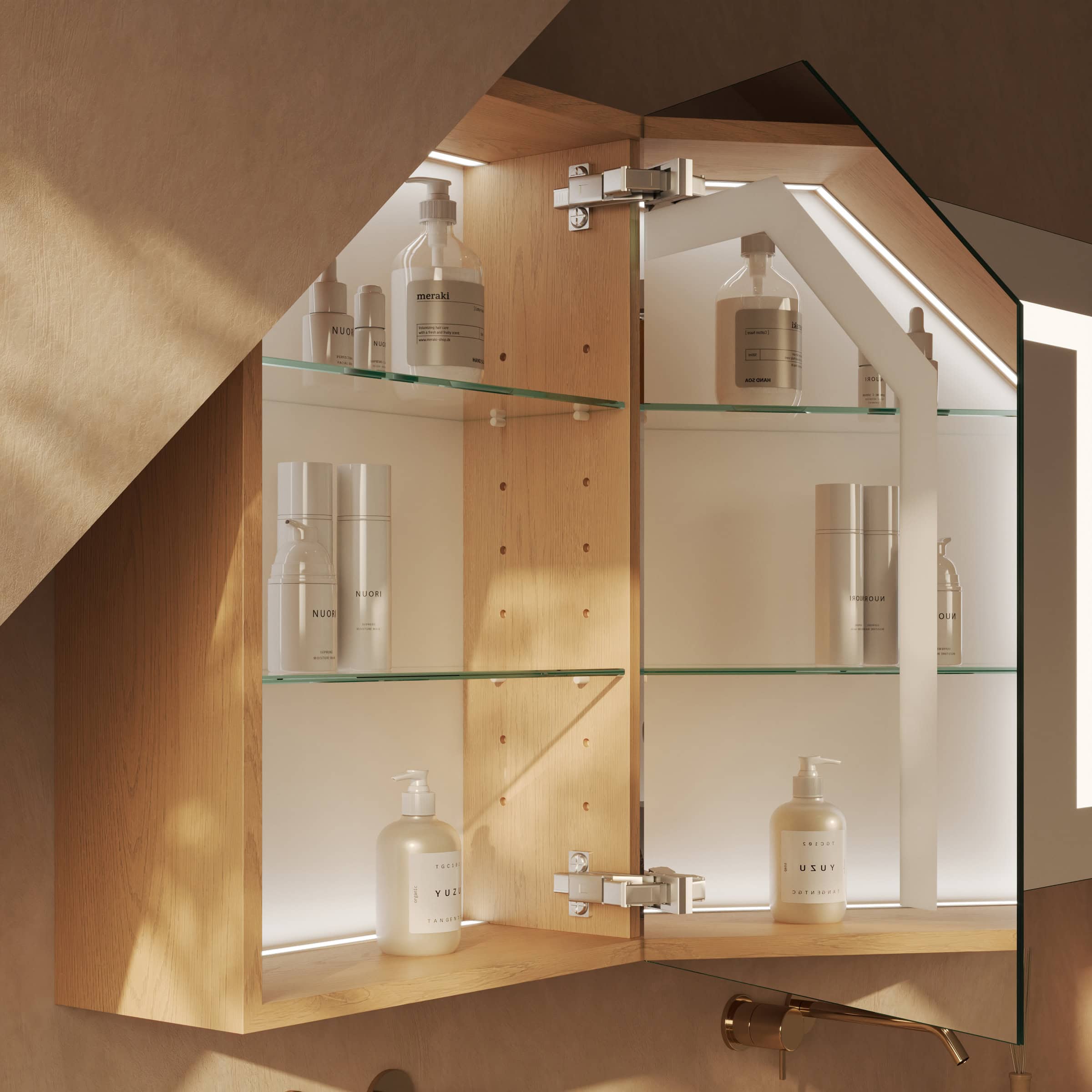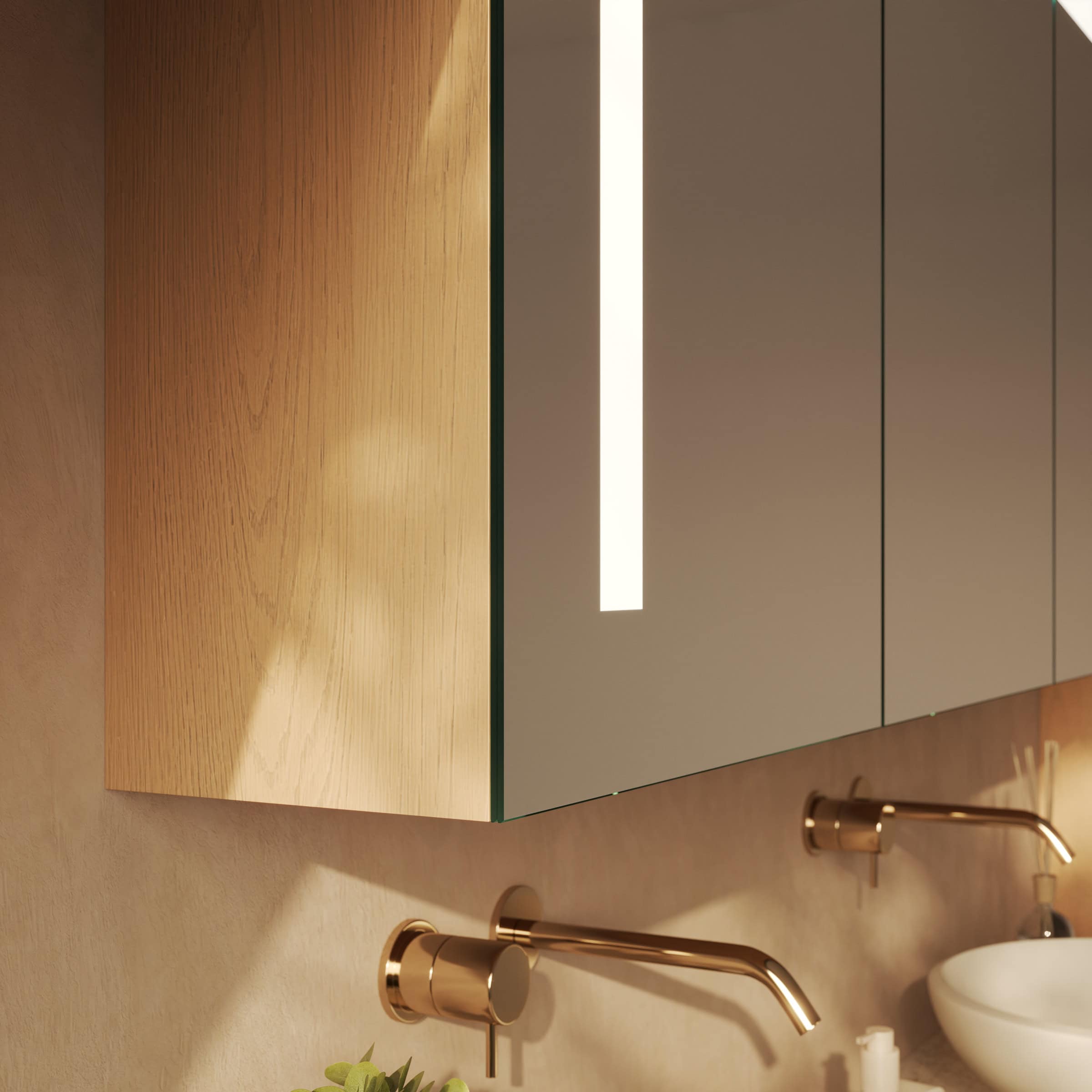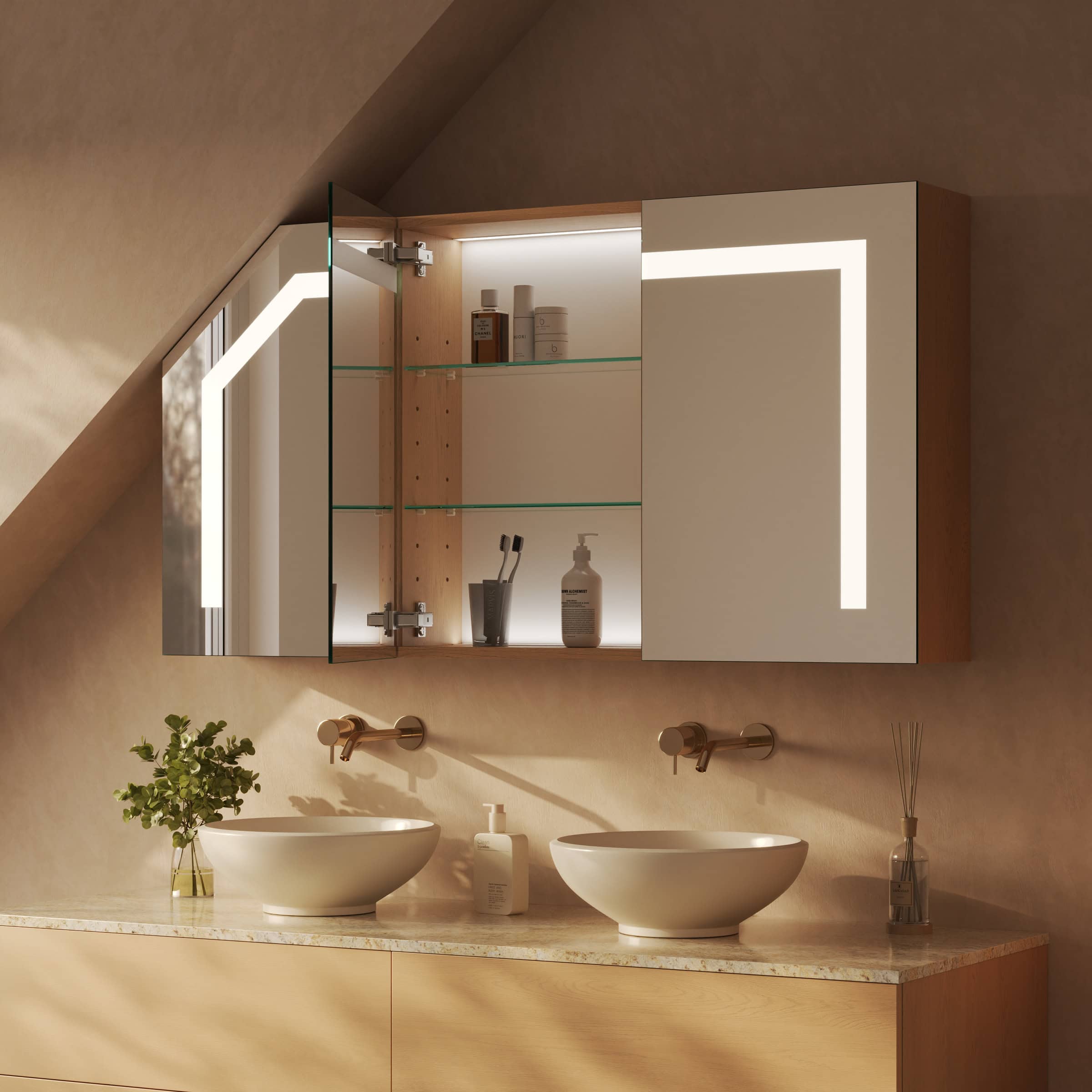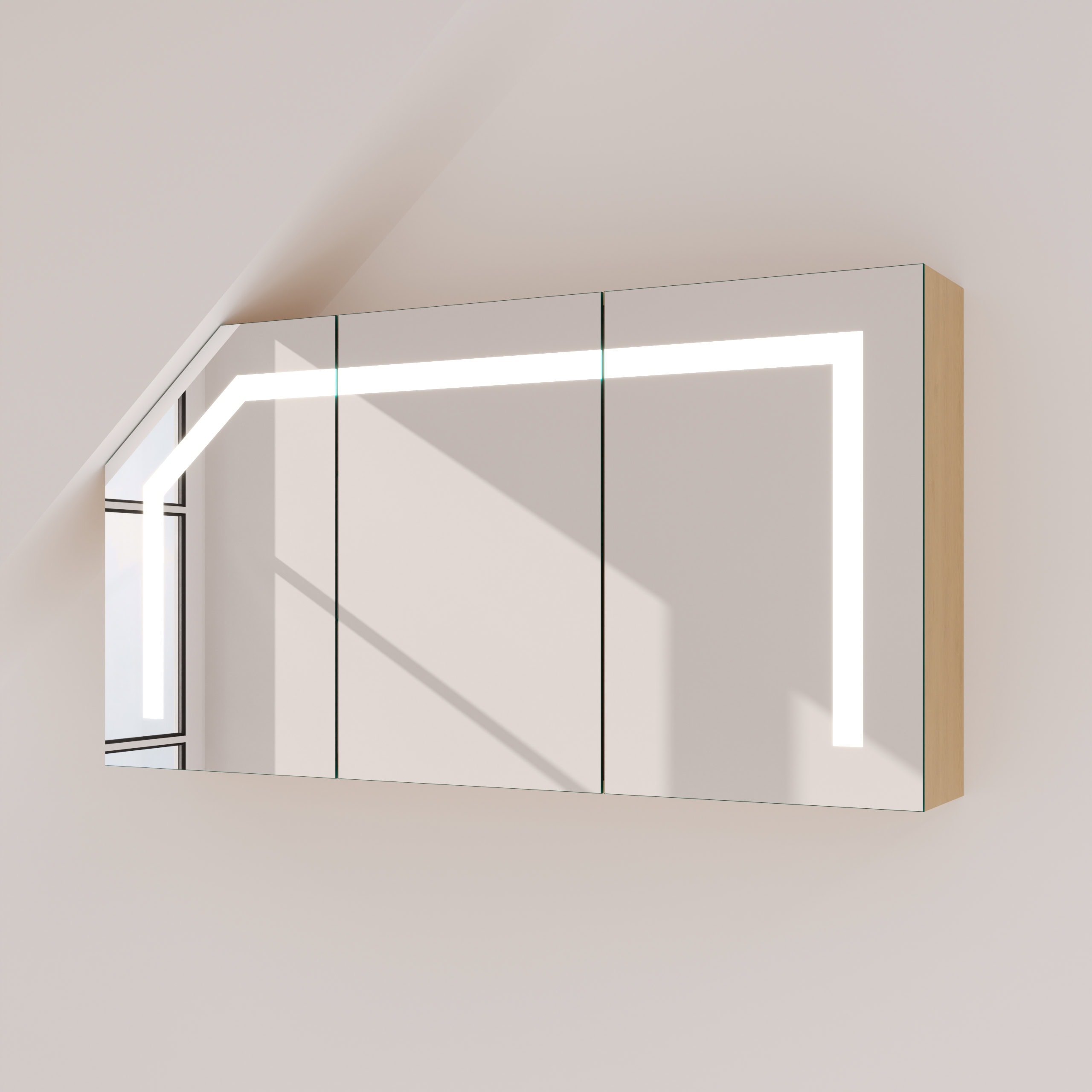 Der Spiegelschrank Noera wurde speziell konzipiert, um architektonische Herausforderungen wie Dachschrägen meisterhaft zu nutzen. Als individuelle Maßanfertigung fügt er sich millimetergenau in Ihr Badezimmer ein und schafft wertvollen Stauraum, wo zuvor keiner war. Der robuste Korpus aus 19mm starken Holzdekorplatten, dessen Farbe Sie frei wählen, bildet die stabile Basis für die edle Front aus 6mm starkem Kristallspiegel. Dessen geschliffene und veredelte Kanten zeugen von höchster Verarbeitungsqualität. Das integrierte LED-Lichtsystem mit seinen drei satinierten Leuchtfeldern rahmt Ihr Spiegelbild perfekt ein. Das indirekte, für die Kosmetik optimierte Licht sorgt für eine schattenfreie und authentische Ausleuchtung. Im ausgeschalteten Zustand präsentieren sich die Leuchtfelder in einer dezenten Milchglas-Optik und unterstreichen das puristische Design. Im Inneren garantieren hochwertige Blum-Scharniere mit Soft-Close-Mechanismus ein sanftes, geräuschloses Schließen der Türen – ein Detail, das Sie jeden Tag aufs Neue schätzen werden.