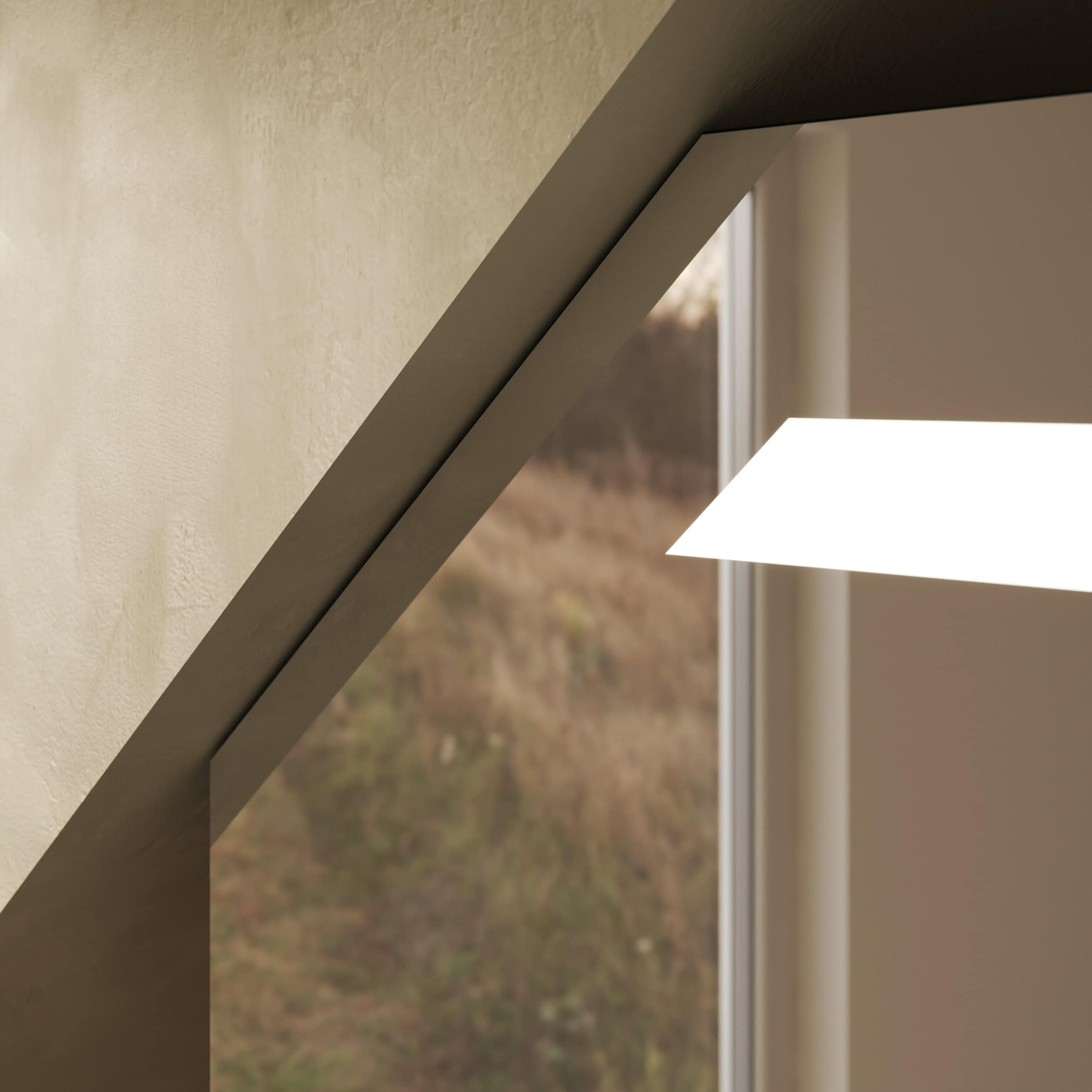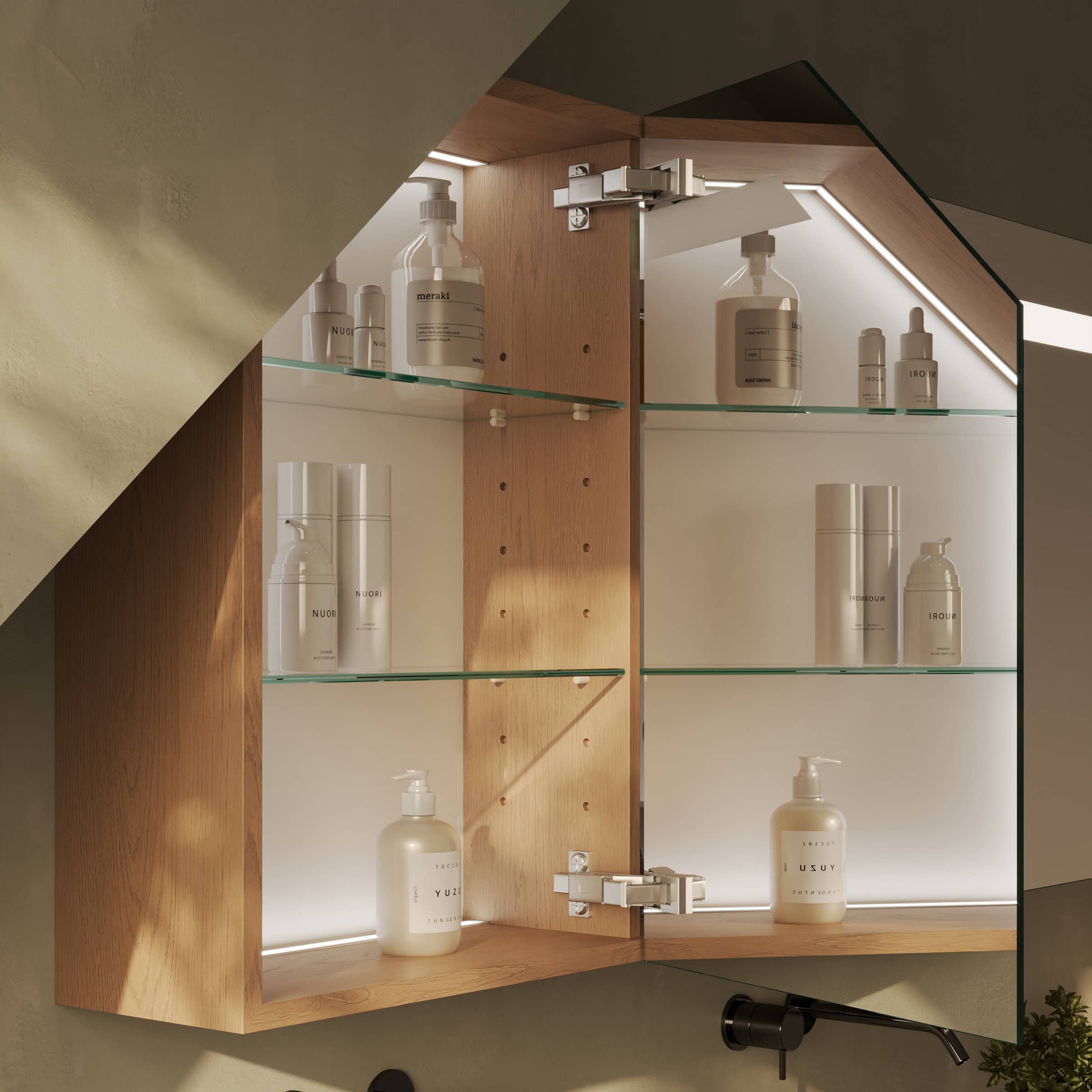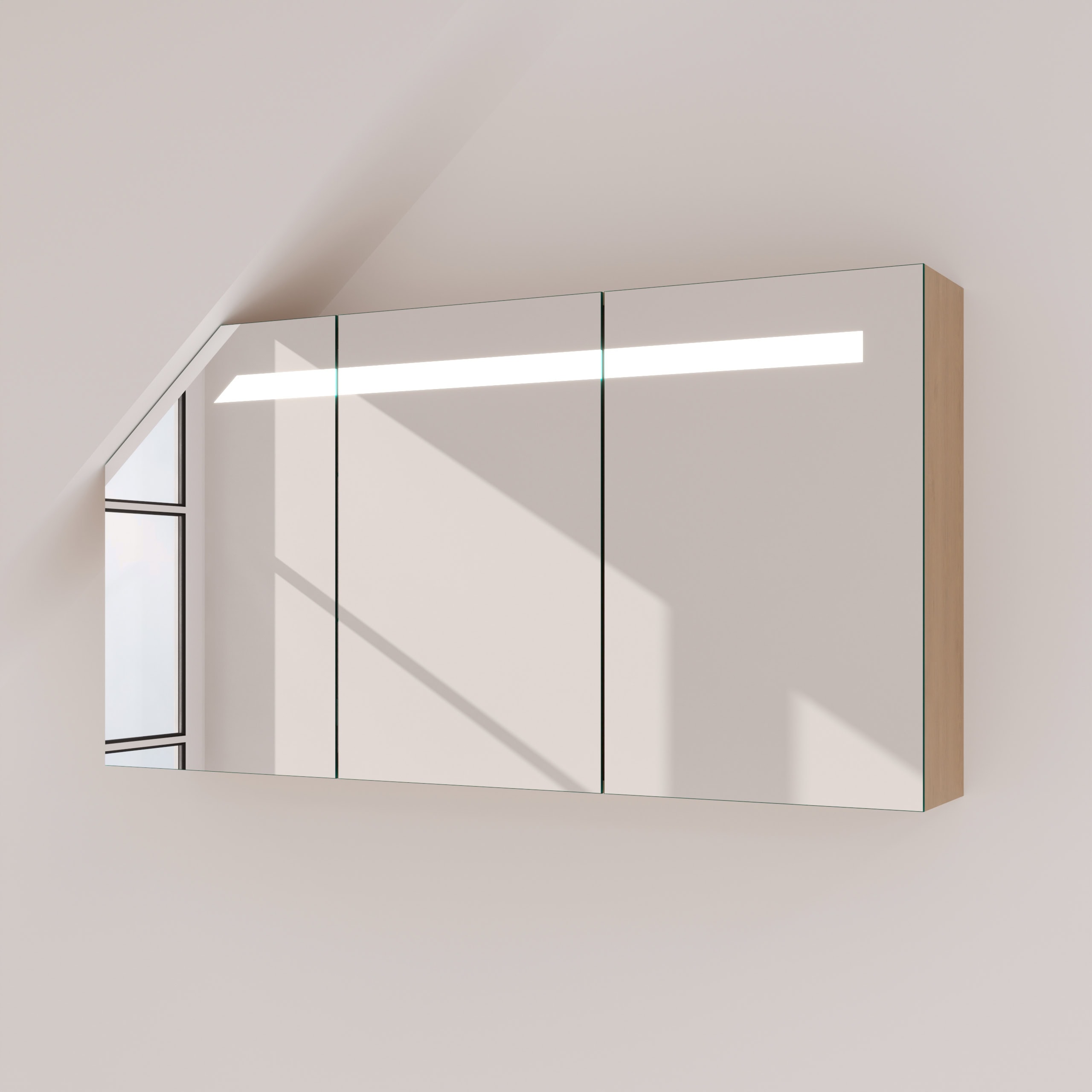 Der Spiegelschrank Noera für die Dachschräge ist die Antwort auf architektonische Herausforderungen. Als exakte Maßanfertigung nutzt er den Raum unter der Schräge optimal aus und verwandelt ihn in eleganten Stauraum. Der Korpus aus 19 mm starken Holzdekorplatten bürgt für Stabilität, während die Türen aus 6 mm starkem Kristallspiegel mit veredelten Kanten für ein brillantes, klares Spiegelbild sorgen. Im Inneren offenbart sich ein durchdachtes Konzept, das durch hochwertige Blum-Scharniere mit Soft-Close-Mechanismus abgerundet wird – für ein stets sanftes und geräuschloses Schließen. Das Highlight ist die integrierte LED-Beleuchtung an der Oberseite: Sie wirft durch 4 cm breite, satinierte Leuchtfelder ein indirektes, für die Kosmetik optimiertes Licht, das Ihr Gesicht schattenfrei ausleuchtet und eine behagliche Atmosphäre schafft. Ausgeschaltet fügen sich die Flächen dezent wie Milchglas in das Gesamtbild ein.