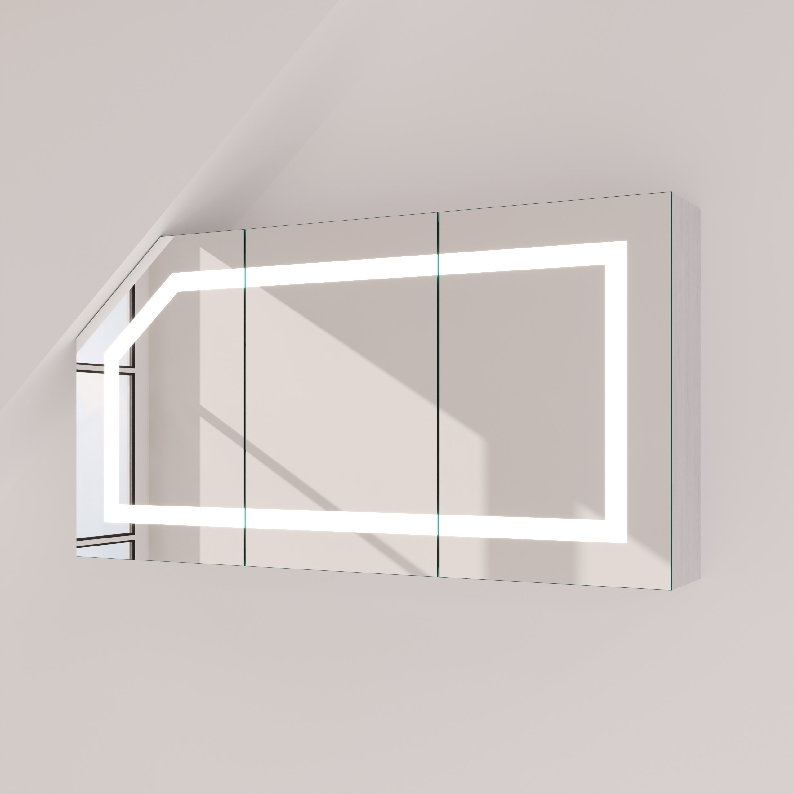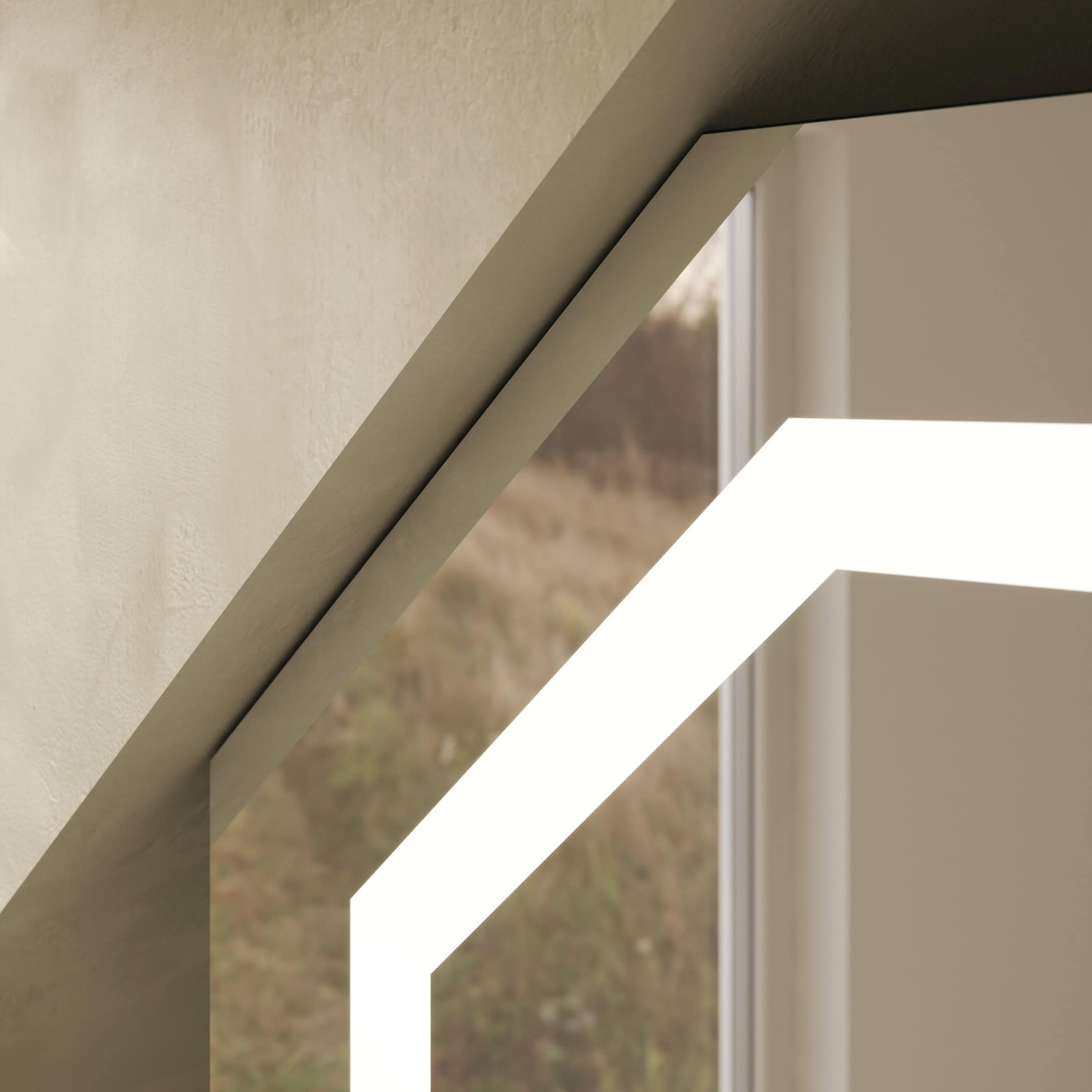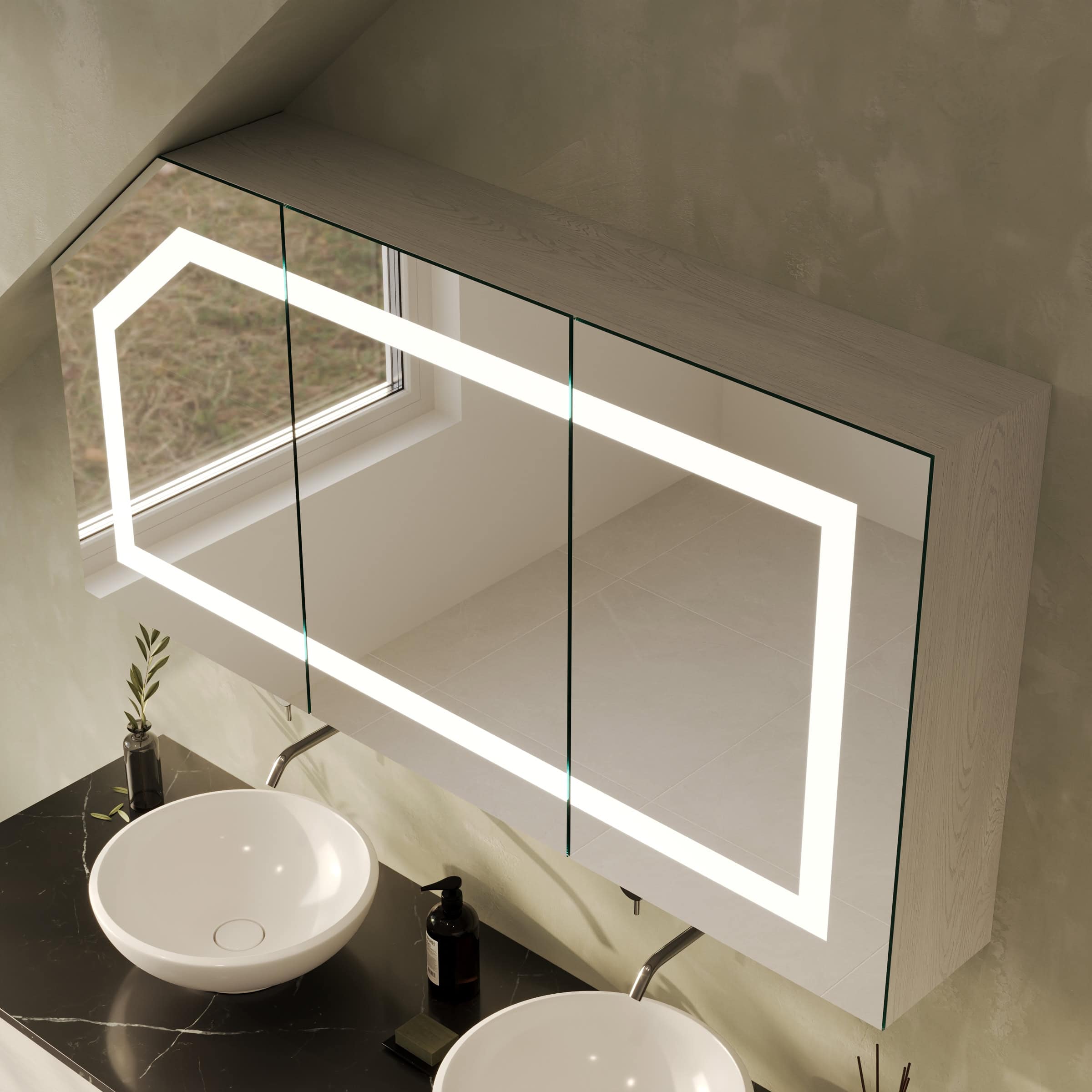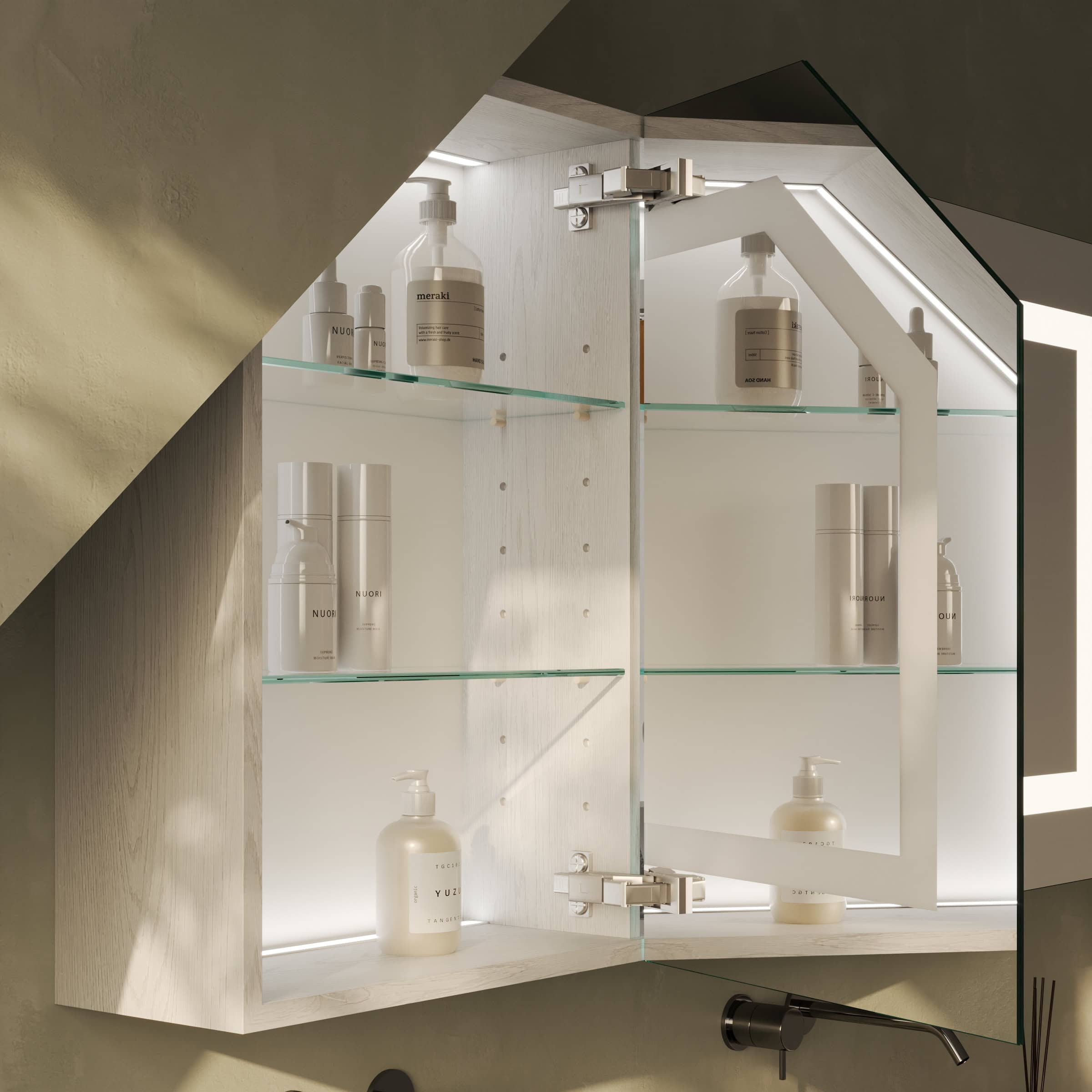 Der Spiegelschrank Noera wurde speziell für Räume mit Dachschrägen konzipiert und fügt sich als individuelle Maßanfertigung millimetergenau in Ihre Architektur ein. Vergessen Sie Kompromisse – jede Breite, Höhe und Tiefe wird exakt auf Ihre Wünsche abgestimmt. Der stabile Korpus aus 19 mm starken Holzdekorplatten bildet die Basis für ein langlebiges Möbelstück, dessen Herzstück die Türen aus 6 mm starkem Kristallspiegel sind. Ihre präzise geschliffenen und veredelten Kanten zeugen von höchster Verarbeitungsqualität und sorgen für eine brillante, klare Reflexion. Im Inneren offenbart sich durchdachte Funktionalität: Hochwertige Scharniere von Blum garantieren mit ihrem 110°-Öffnungswinkel bequemen Zugriff und schließen dank Soft-Close-Mechanismus stets sanft und leise. Die umlaufende LED-Beleuchtung schafft ein ideales, schattenfreies Licht für die tägliche Kosmetik. Indirekt erhellt sie die 4 cm breiten, satinierten Leuchtfelder, die im ausgeschalteten Zustand wie edles Milchglas wirken und eine stimmungsvolle Atmosphäre in Ihrem Bad erzeugen.