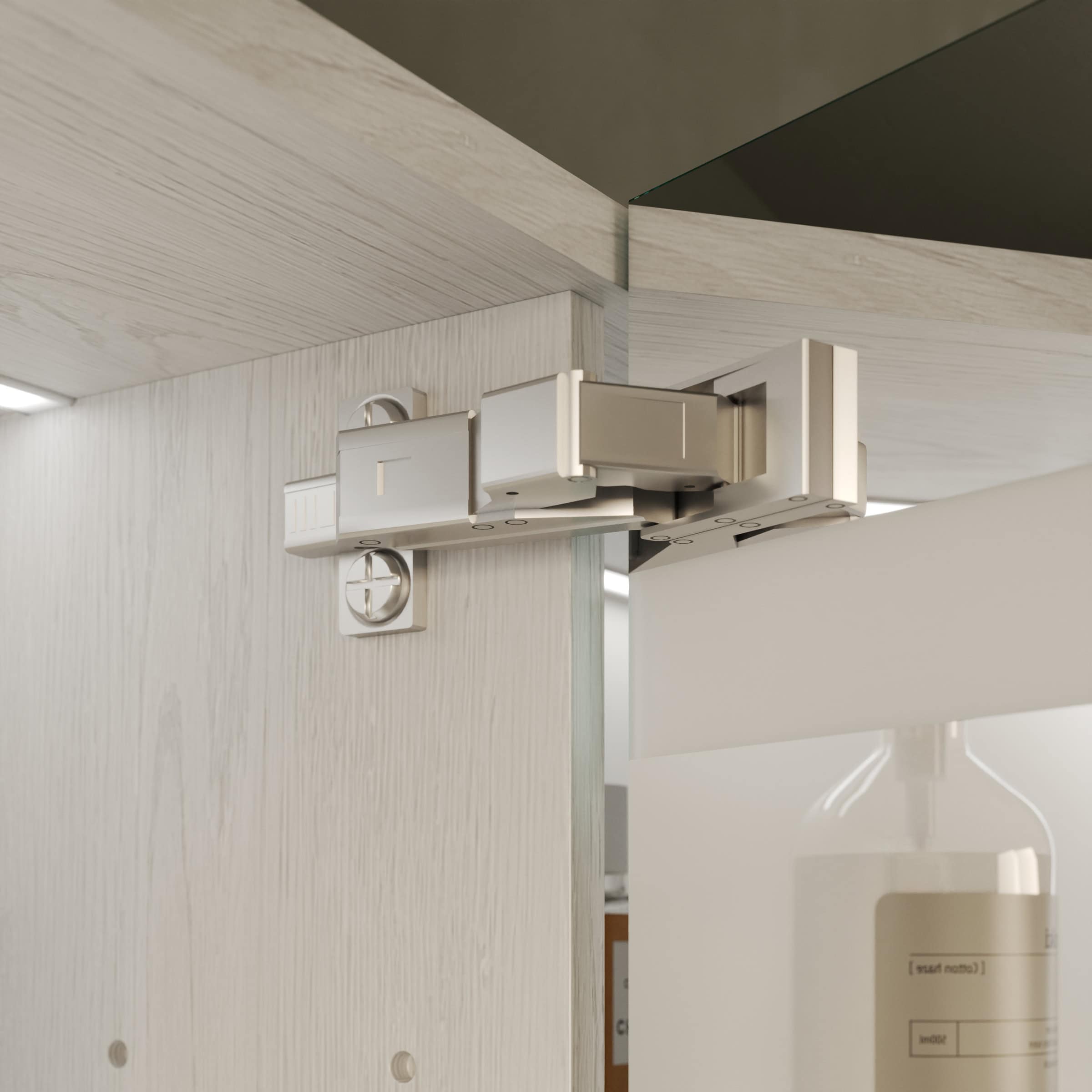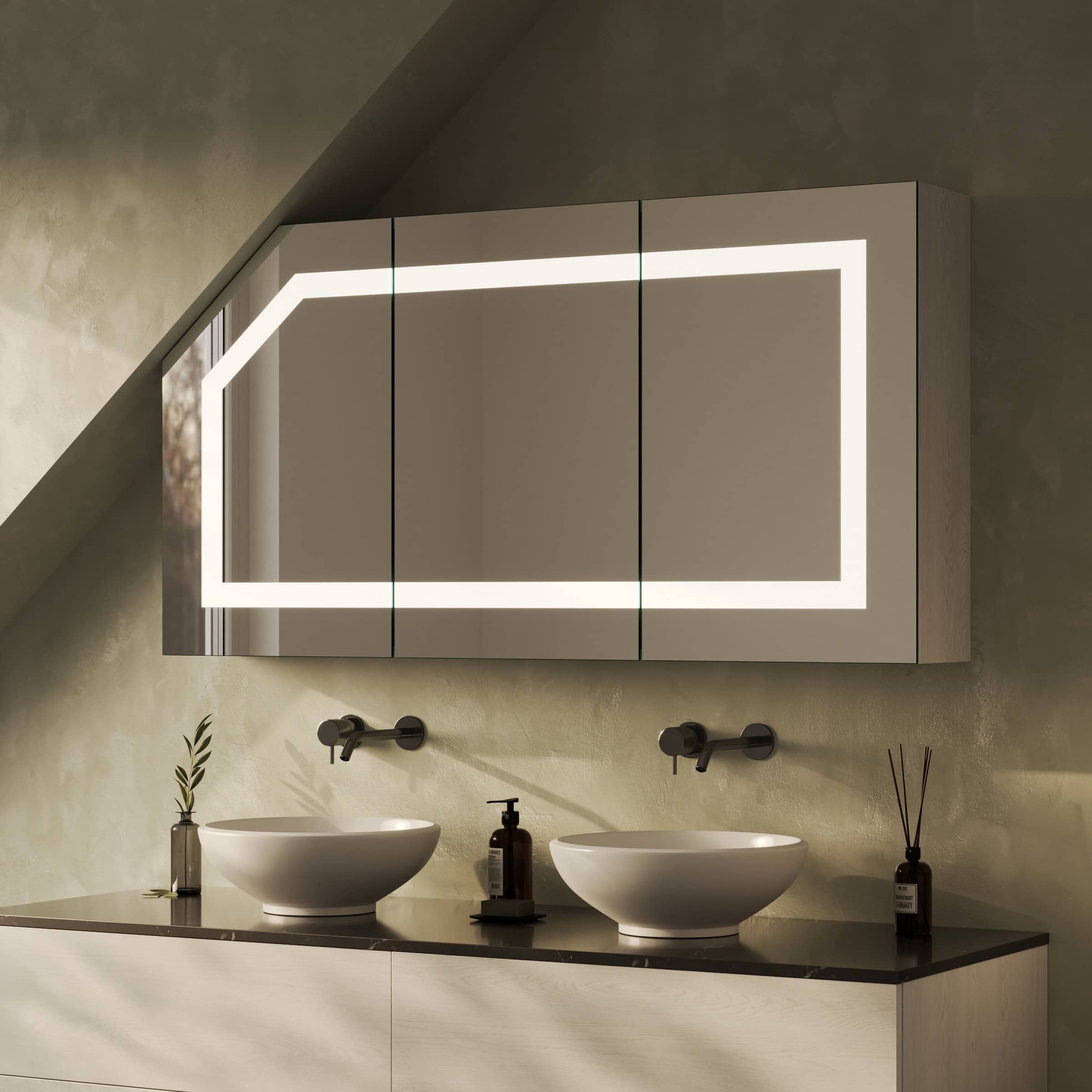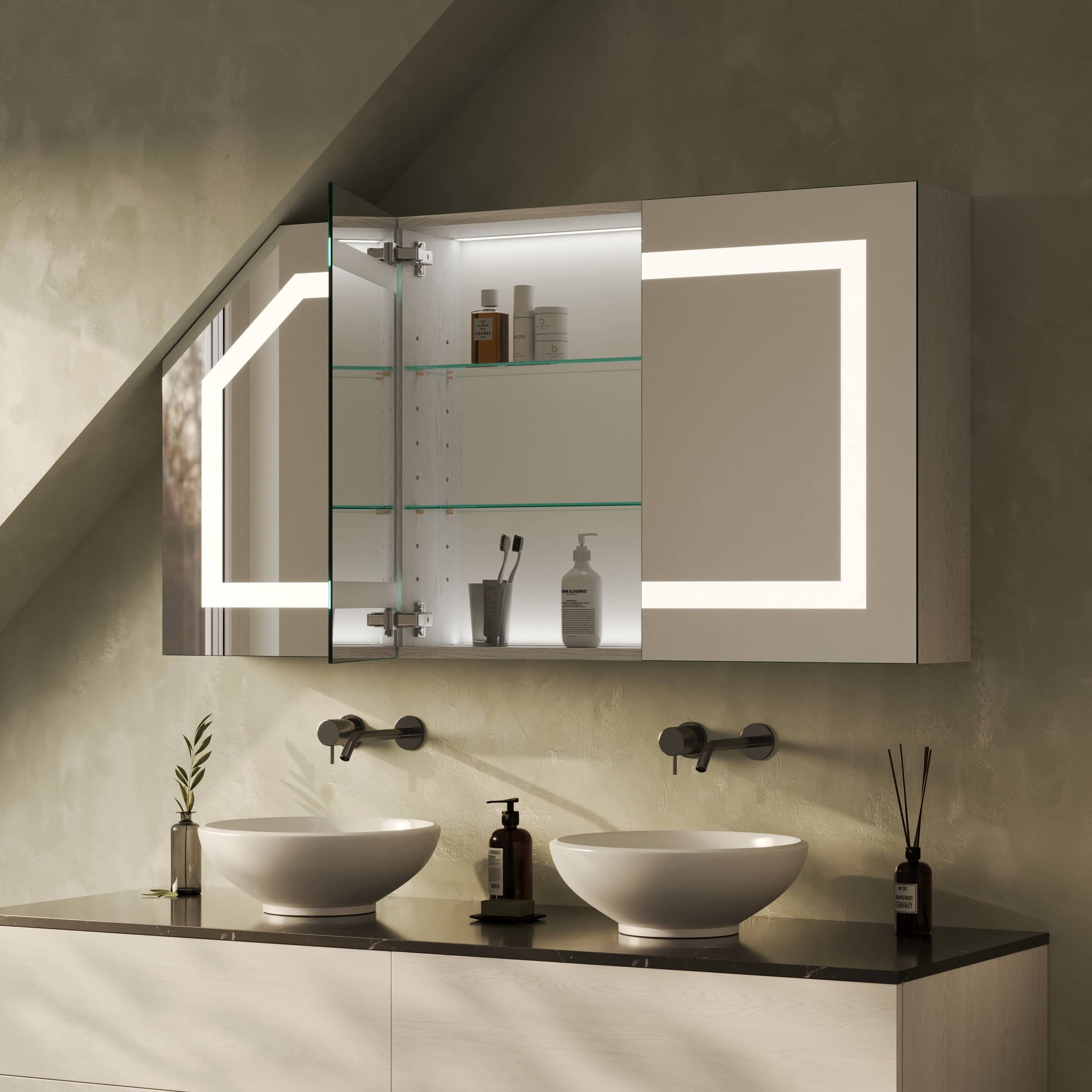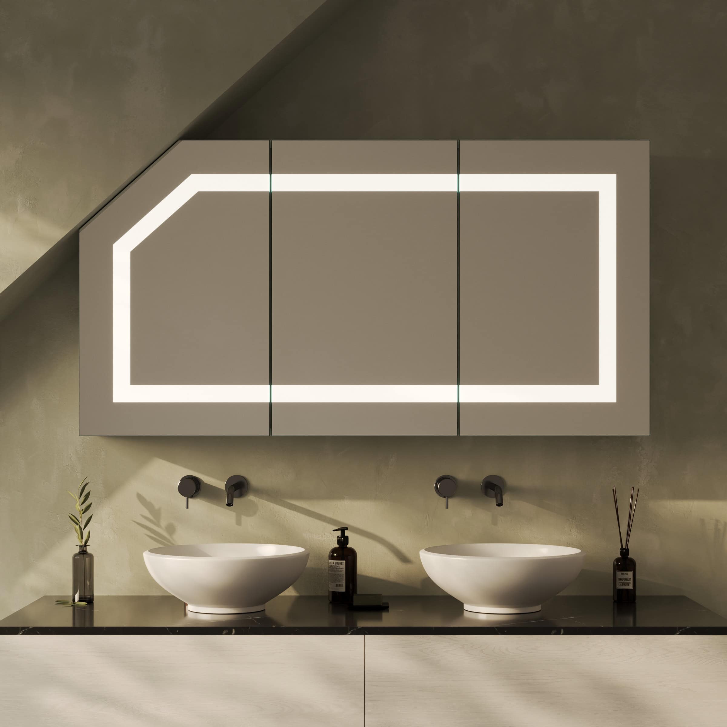 Der Spiegelschrank Noera wurde speziell für Räume mit Dachschrägen konzipiert und fügt sich als individuelle Maßanfertigung millimetergenau in Ihre Architektur ein. Vergessen Sie Kompromisse – jede Breite, Höhe und Tiefe wird exakt auf Ihre Wünsche abgestimmt. Der stabile Korpus aus 19 mm starken Holzdekorplatten bildet die Basis für ein langlebiges Möbelstück, dessen Herzstück die Türen aus 6 mm starkem Kristallspiegel sind. Ihre präzise geschliffenen und veredelten Kanten zeugen von höchster Verarbeitungsqualität und sorgen für eine brillante, klare Reflexion. Im Inneren offenbart sich durchdachte Funktionalität: Hochwertige Scharniere von Blum garantieren mit ihrem 110°-Öffnungswinkel bequemen Zugriff und schließen dank Soft-Close-Mechanismus stets sanft und leise. Die umlaufende LED-Beleuchtung schafft ein ideales, schattenfreies Licht für die tägliche Kosmetik. Indirekt erhellt sie die 4 cm breiten, satinierten Leuchtfelder, die im ausgeschalteten Zustand wie edles Milchglas wirken und eine stimmungsvolle Atmosphäre in Ihrem Bad erzeugen.