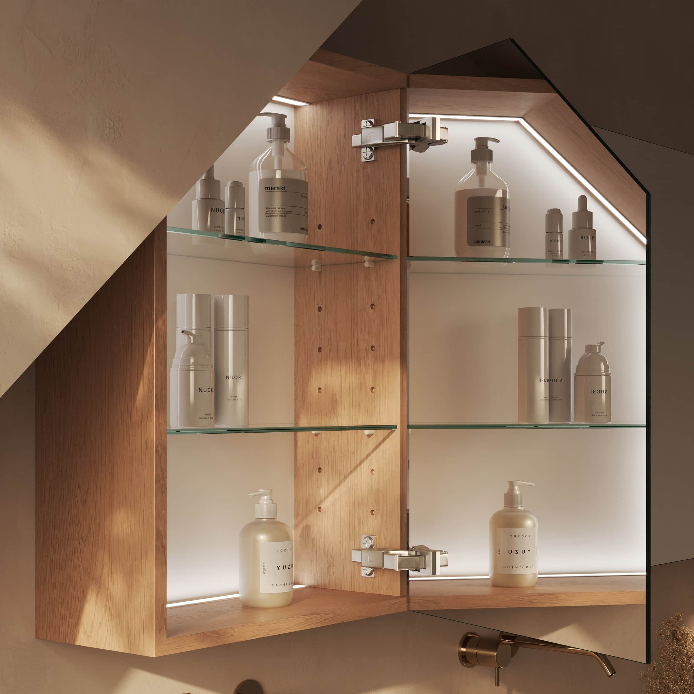 Der Spiegelschrank Aurea ist die Antwort auf die architektonische Herausforderung von Bädern mit Dachschrägen. Statt eines Kompromisses erhalten Sie ein Meisterstück der Raumökonomie, das sich nahtlos und passgenau in Ihre Gegebenheiten einfügt. Gefertigt aus robusten, 19mm starken Holzdekorplatten, bildet der Korpus eine solide und langlebige Basis, dessen Farbe und Tiefe Sie individuell bestimmen. Die Front aus brillantem, 6mm starkem Kristallspiegel mit veredelten Kanten sorgt für eine verzerrungsfreie, klare Reflexion und verleiht dem Raum optische Weite. Beim Öffnen der Türen enthüllt sich das wahre Highlight: Eine dezente, für die Kosmetik optimierte Innenbeleuchtung, die Ihr Gesicht schattenfrei erhellt und eine angenehme Atmosphäre schafft. Jede Bewegung wird zum Genuss, denn die hochwertigen Blum-Scharniere mit Soft-Close-Mechanismus lassen die Türen sanft und nahezu lautlos gleiten. Der Aurea ist nicht nur ein Spiegelschrank für die Dachschräge – er ist ein Bekenntnis zu durchdachtem Design und kompromissloser Qualität.