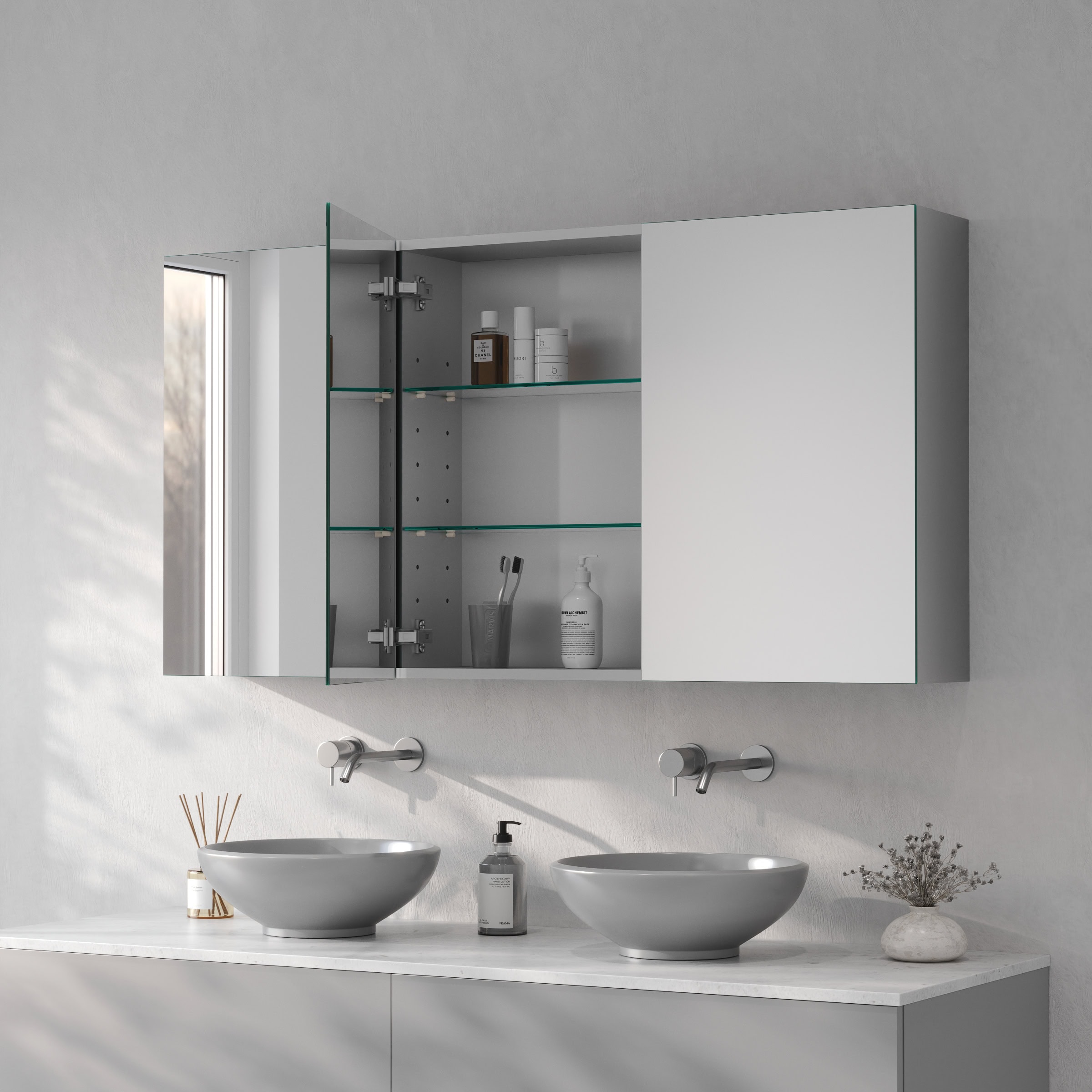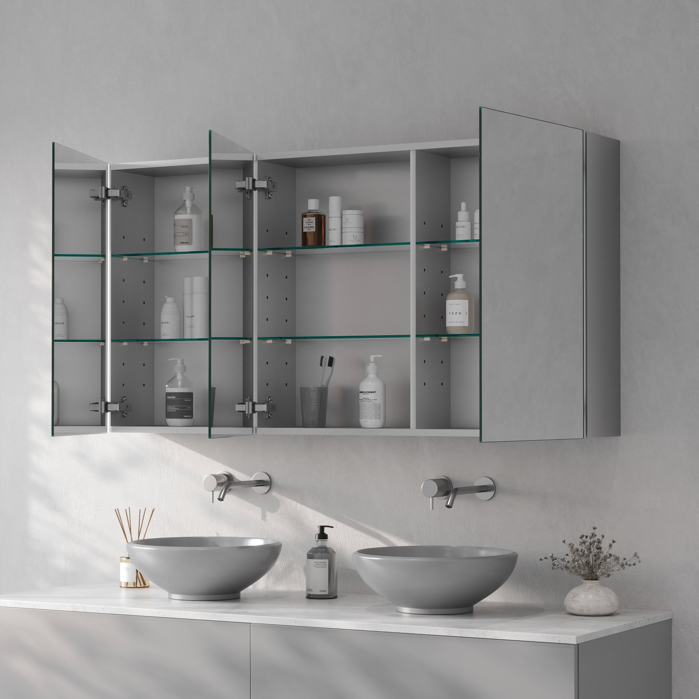 Der Alumira Spiegelschrank aus Aluminium verbindet Manufakturqualität mit zeitlosem Design. Konfigurieren Sie jetzt Ihr persönliches Unikat für ein Badezimmer von bleibendem Wert.