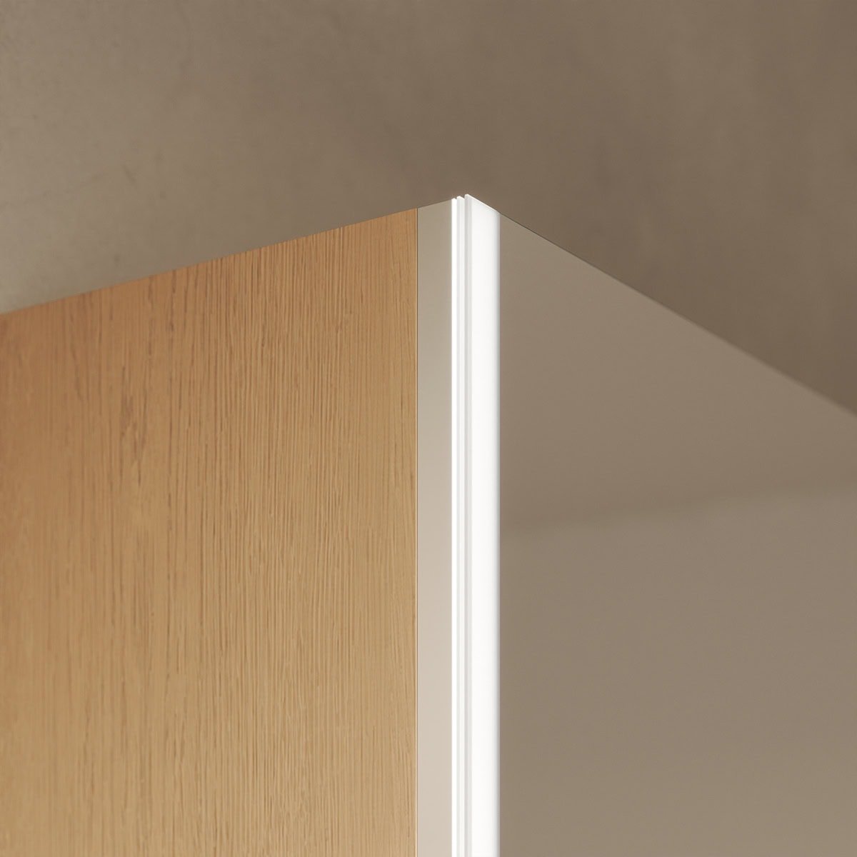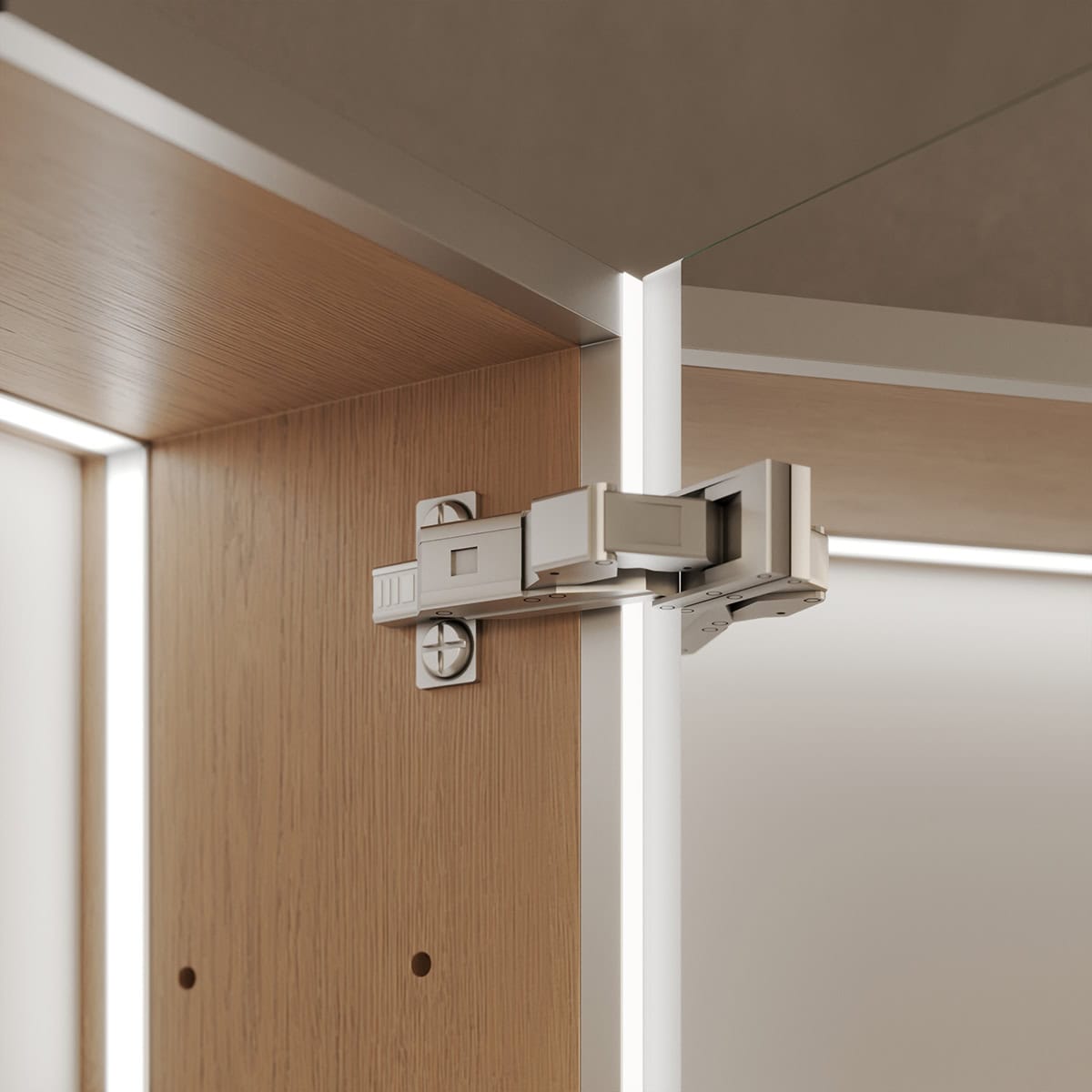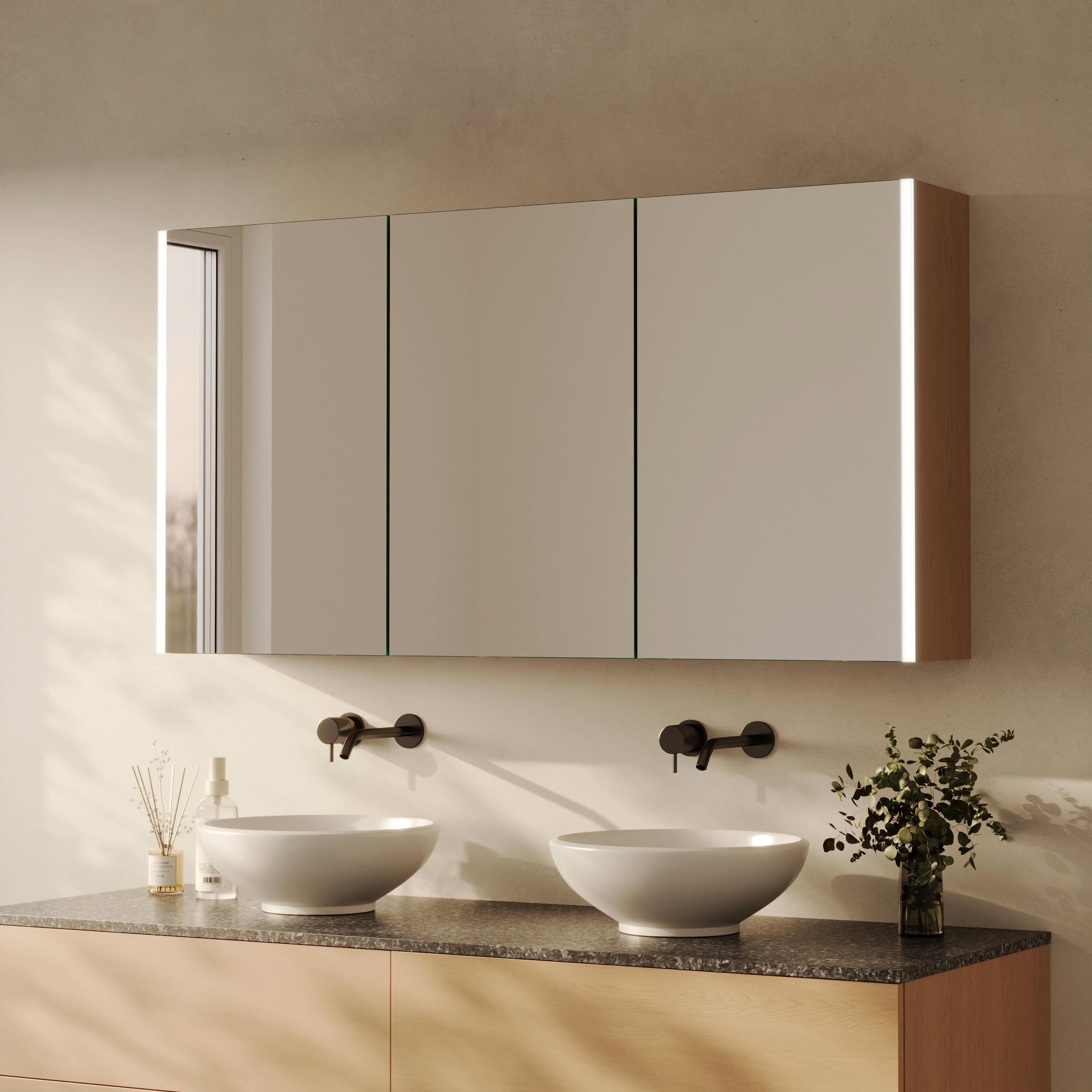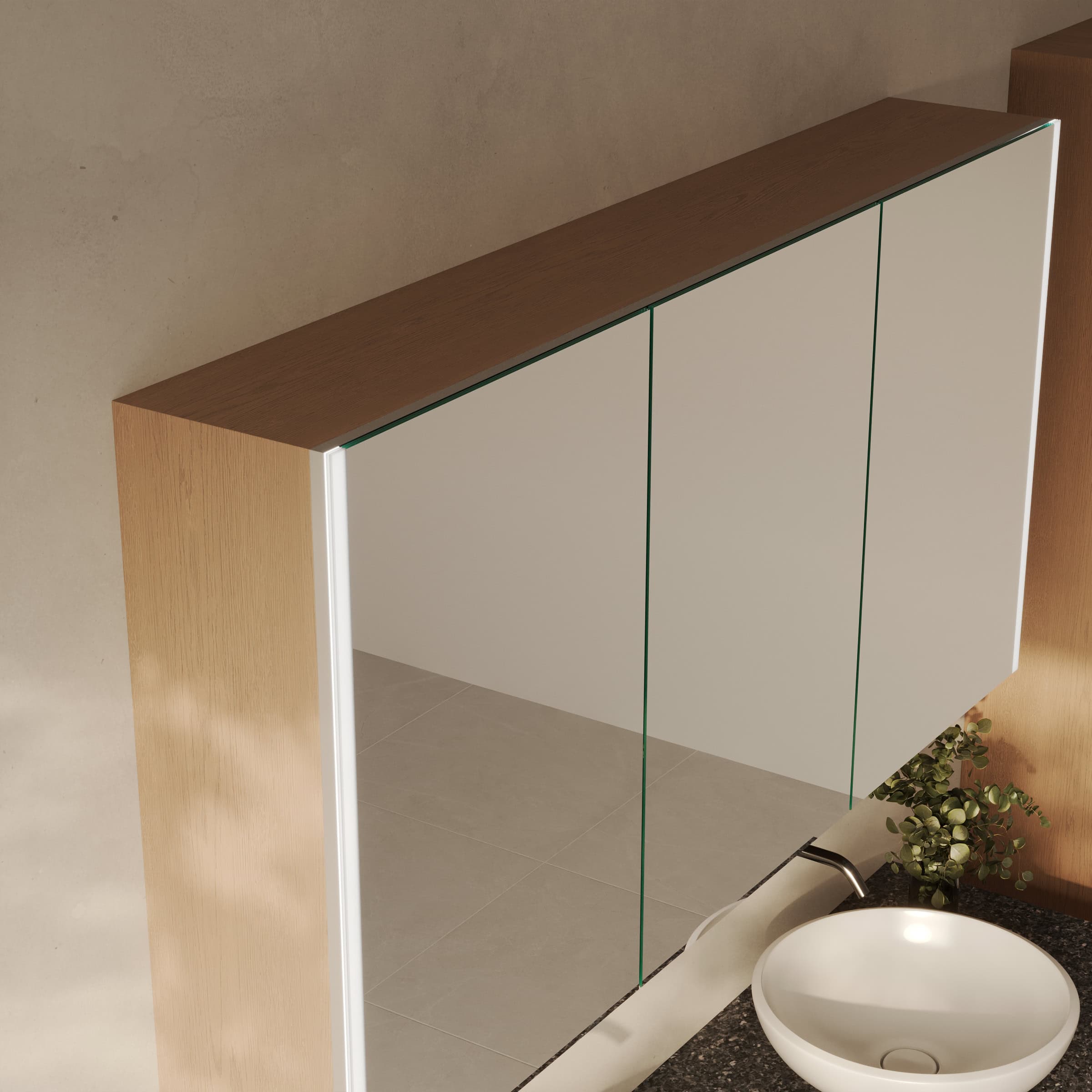 Der Spiegelschrank Lumira ist mehr als nur Stauraum – er ist ein zentrales Gestaltungselement für Ihr anspruchsvolles Badezimmer. Gefertigt als individuelle Maßanfertigung, fügt er sich nahtlos in Ihre Raumarchitektur ein. Der 19mm starke Korpus aus hochwertigen Holzdekorplatten, dessen Farbe Sie frei bestimmen, bildet einen warmen und soliden Rahmen für den brillanten, 6mm starken Kristallspiegel. Dessen präzise geschliffene Kanten unterstreichen die Wertigkeit und sorgen für eine klare, verzerrungsfreie Reflexion. Das Herzstück dieses Spiegelschranks fürs Bad ist die beidseitig integrierte LED Beleuchtung. Sie wurde speziell für kosmetische Anwendungen optimiert und leuchtet Ihr Gesicht schattenfrei und in authentischen Farben aus – die ideale Voraussetzung für die tägliche Pflege. Im Inneren offenbart sich durchdachte Funktionalität: Die Türen bewegen sich dank erstklassiger Blum-Scharniere mit integriertem Soft-Close-Mechanismus sanft und nahezu geräuschlos und schaffen bei jeder Nutzung ein Gefühl von Luxus.