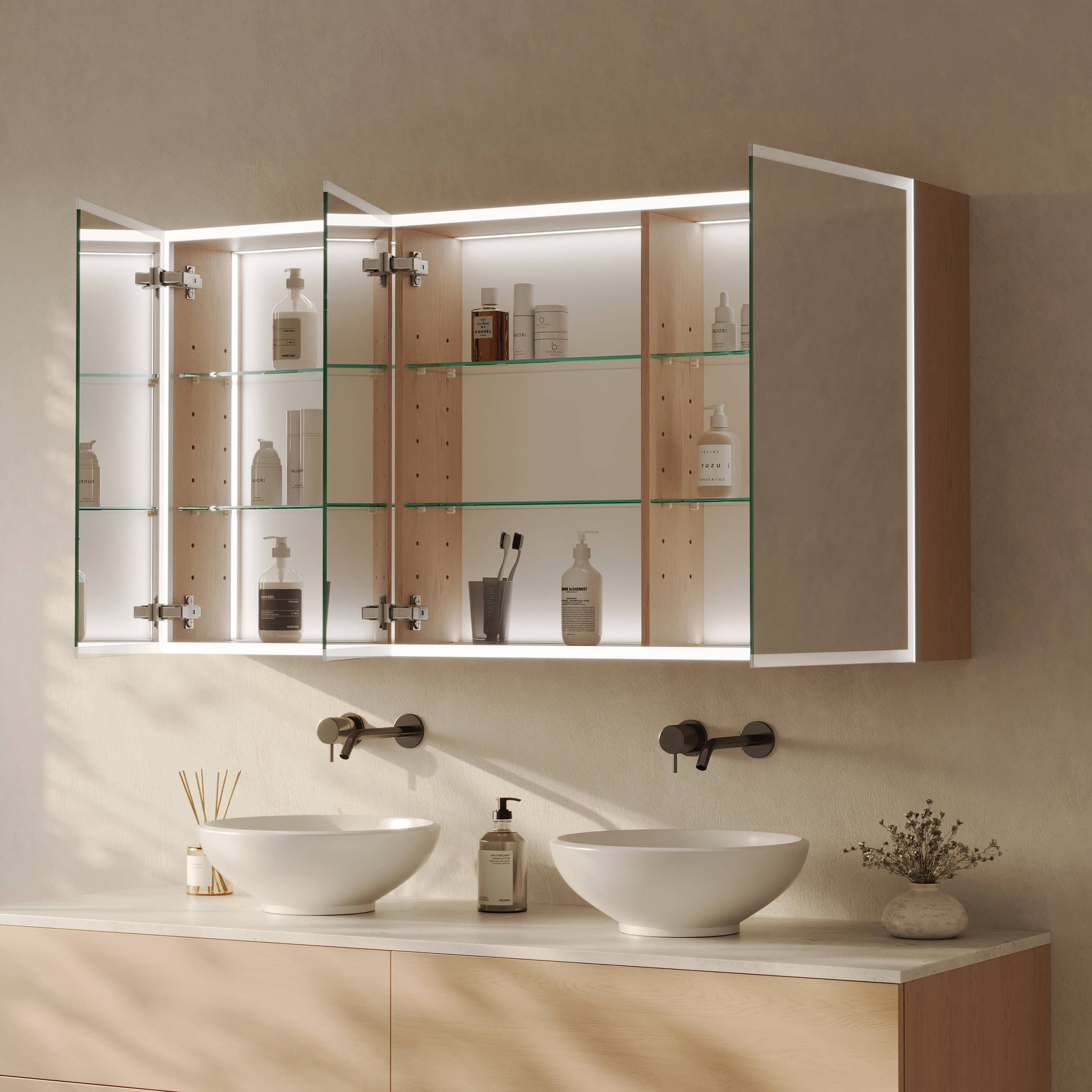 Erleben Sie die Symbiose aus handwerklicher Präzision und innovativem Lichtdesign. Konfigurieren Sie jetzt Ihren persönlichen Lumira Spiegelschrank fürs Bad und vollenden Sie Ihre Raumvision.