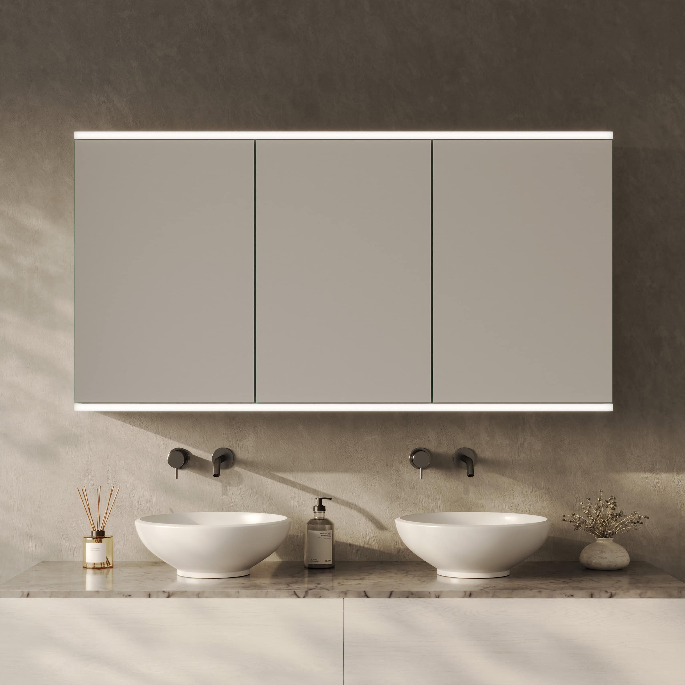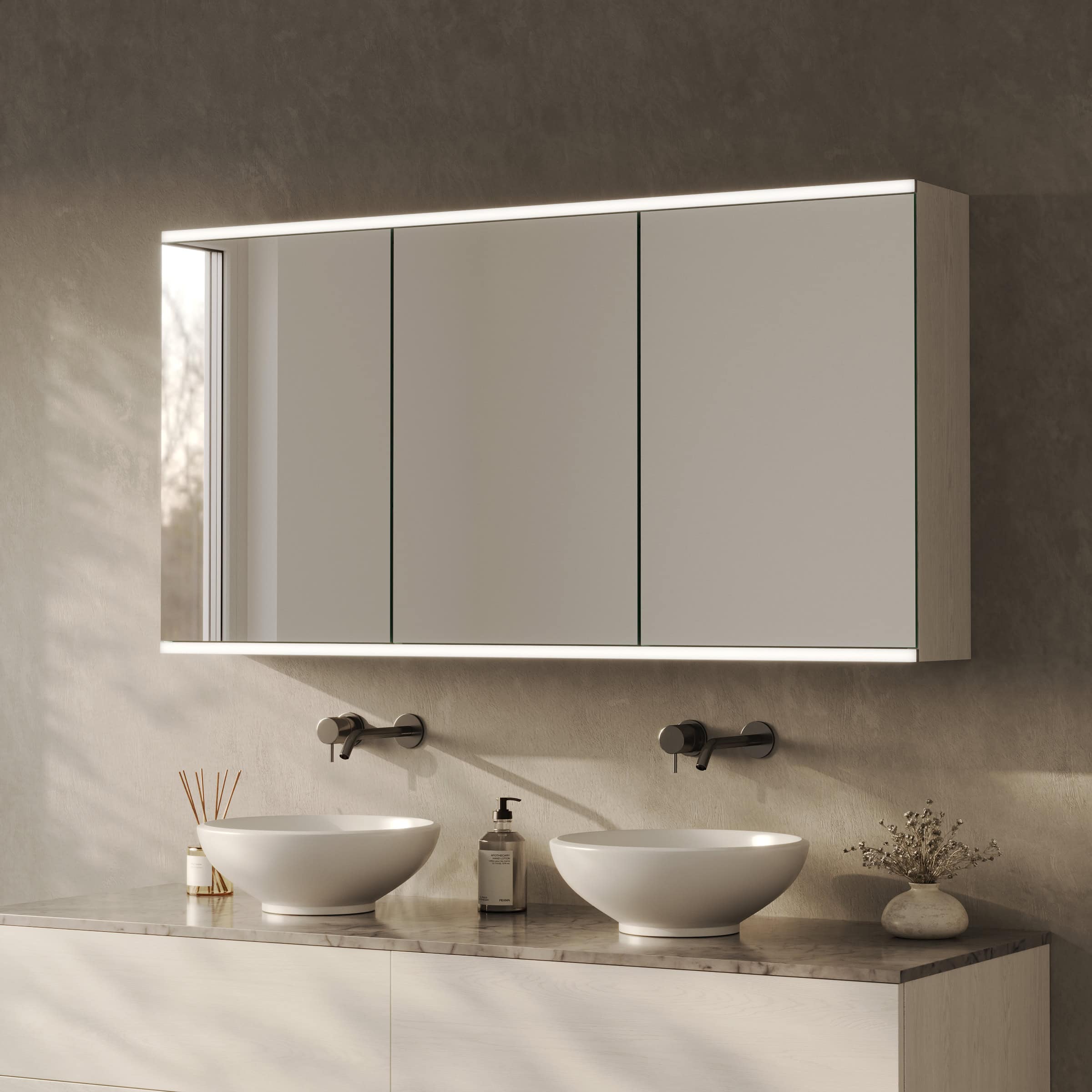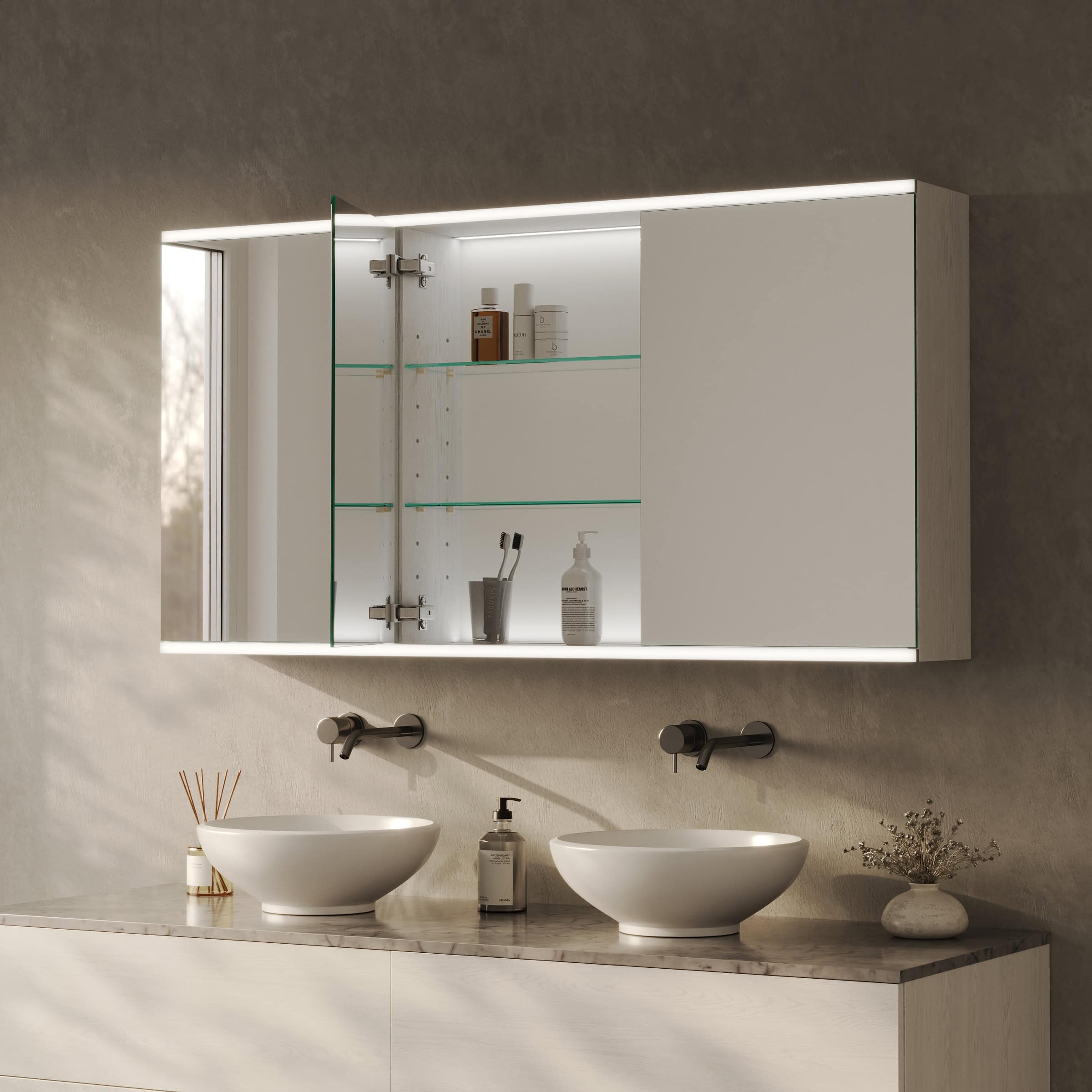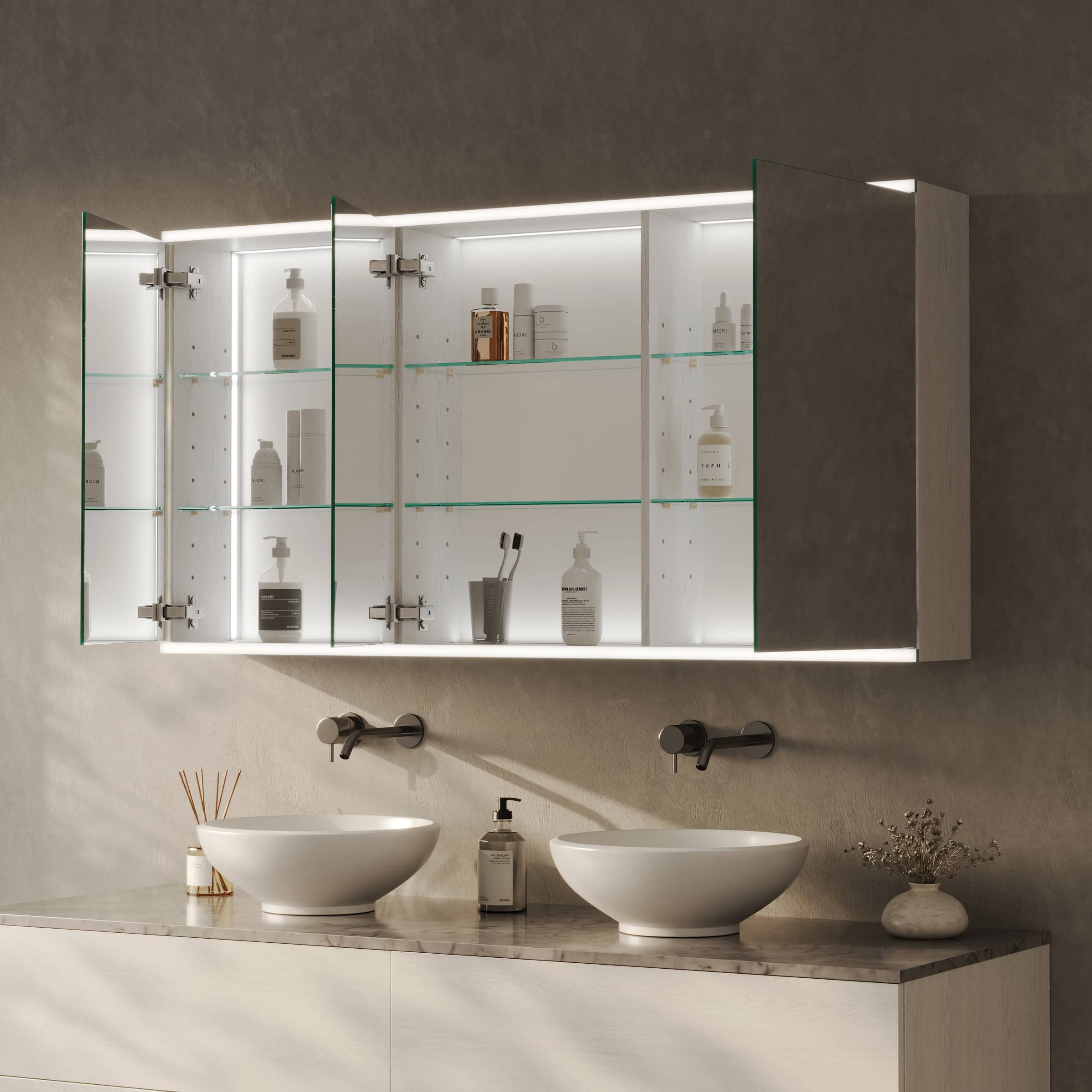 Gestalten Sie einen Spiegelschrank, der nicht nur aufbewahrt, sondern Ihr Bad mit brillantem Licht und Präzision veredelt.
