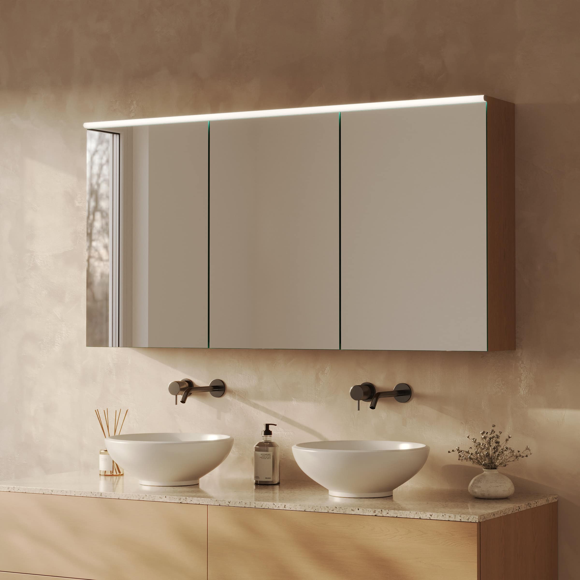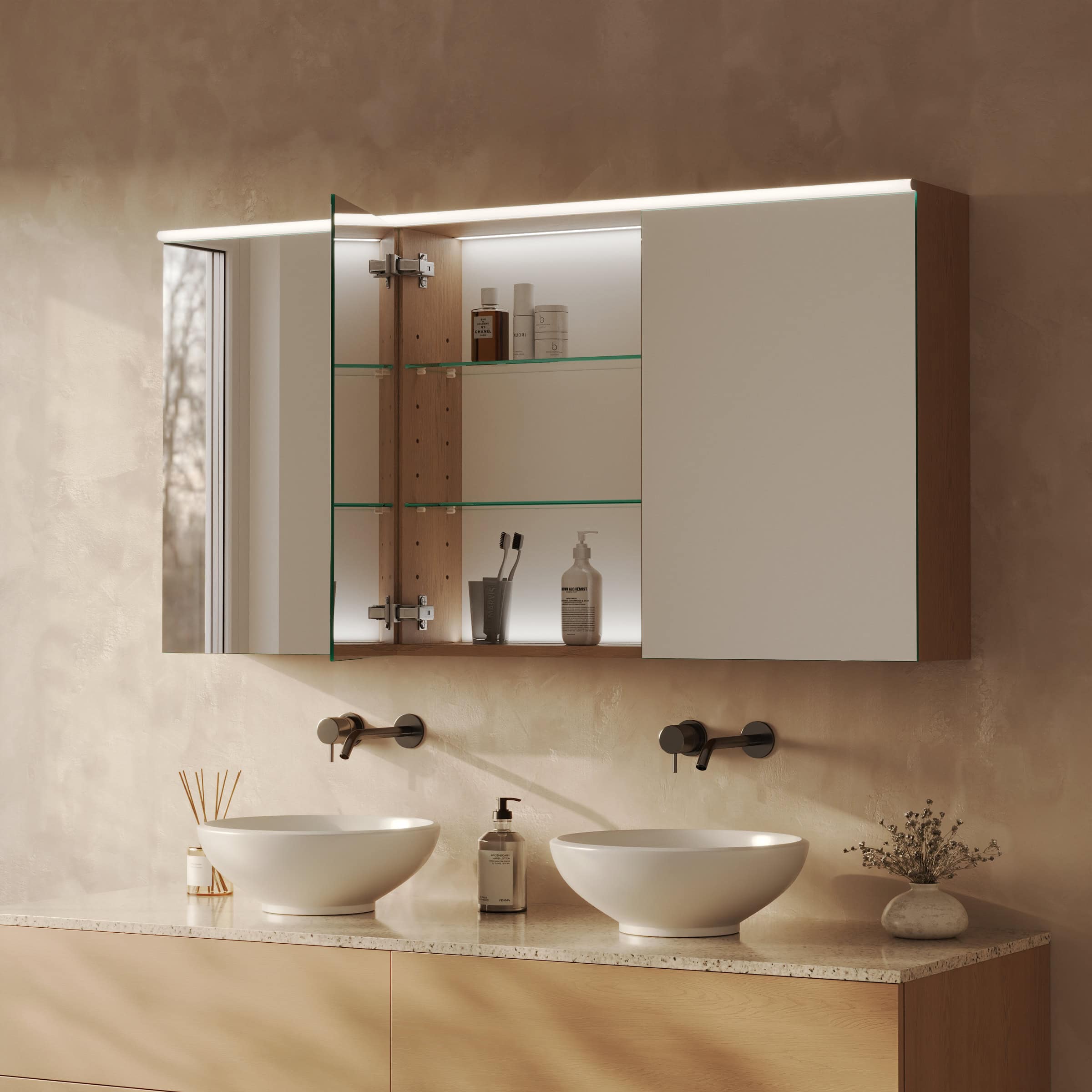 Der Luvera Spiegelschrank vereint meisterhafte Maßanfertigung mit zeitloser Ästhetik. Erleben Sie jeden Tag die Symbiose aus Funktion und Design und konfigurieren Sie Ihr persönliches Unikat.