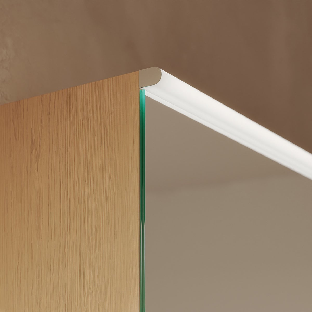 Der Spiegelschrank Luvera ist mehr als nur Stauraum; er ist ein Statement für individuellen Stil und kompromisslose Qualität. Gefertigt nach Ihren exakten Breiten-, Höhen- und Tiefenvorgaben, fügt er sich nahtlos in jede Badarchitektur ein. Das Herzstück bildet der brillante, 6 mm starke Kristallspiegel, dessen geschliffene und veredelte Kanten das Licht elegant brechen und für eine makellose, unverfälschte Reflexion sorgen. Die oben positionierte LED-Beleuchtung wurde speziell für kosmetische Anwendungen optimiert und taucht Ihr Gesicht in ein schattenfreies, klares Licht – für eine perfekte Vorbereitung auf den Tag. Im Inneren offenbart sich durchdachte Funktionalität: Die Türen schließen dank hochwertiger Blum-Scharniere mit integrierter Soft-Close-Dämpfung sanft und beinahe lautlos. Der robuste, 19 mm starke Korpus aus edlen Holzdekorplatten ist in zahlreichen Farben wählbar und bietet zusammen mit der variablen Rückwandgestaltung maximale Freiheit, um Ihren persönlichen Badtraum zu verwirklichen.