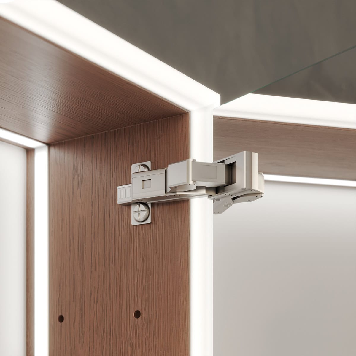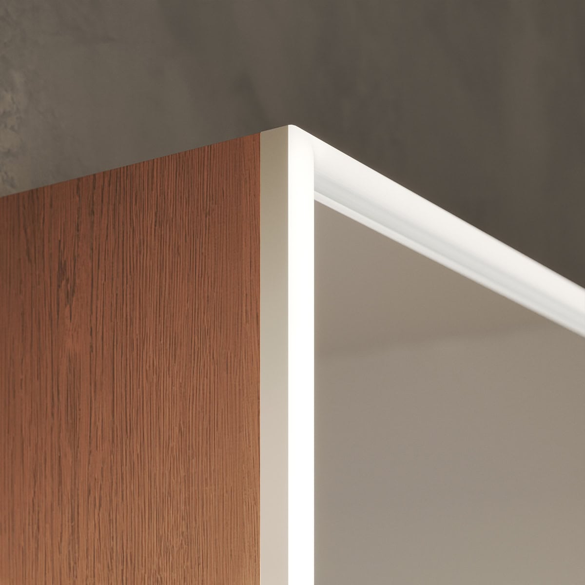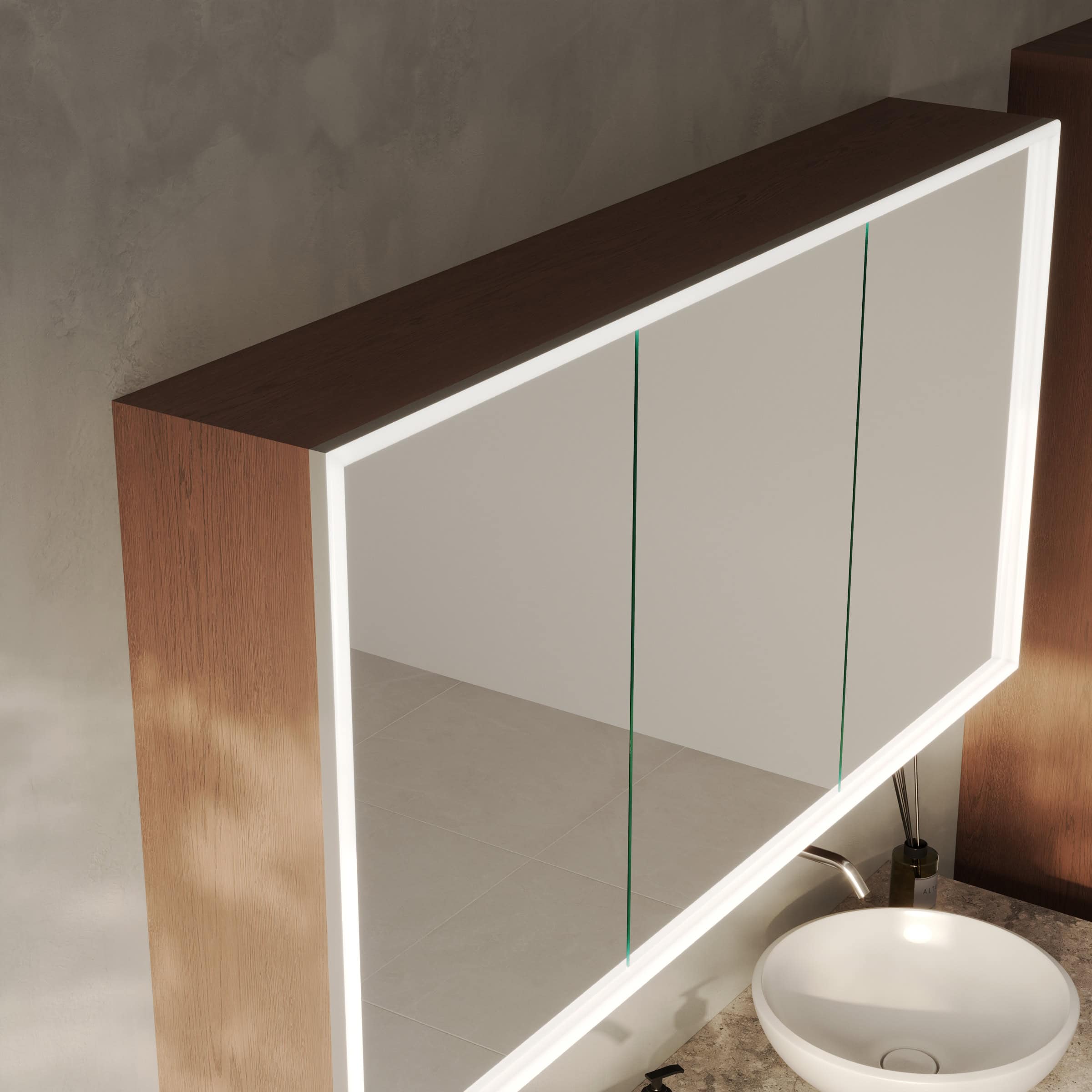 Der Spiegelschrank Luvera umrahmt Sie mit einer rundum laufenden LED-Beleuchtung, die speziell für kosmetische Anwendungen optimiert wurde. Dieses schattenfreie Licht schafft ideale Bedingungen für Ihre tägliche Pflegeroutine und gibt Hauttöne naturgetreu wieder. Hinter der makellosen Front aus 6 mm starkem Kristallspiegel verbirgt sich ein durchdachter Stauraum. Der Korpus aus robusten, 19 mm starken Holzdekorplatten wird in Farbe und Tiefe exakt an Ihre Wünsche angepasst und fügt sich so nahtlos in Ihr Raumkonzept ein. Jedes Detail zeugt von höchstem Anspruch: Die Türen, ausgestattet mit Qualitäts-Scharnieren von Blum, schließen dank des Soft-Close-Mechanismus sanft und beinahe lautlos. Dieser Spiegelschrank ist mehr als ein Möbelstück – er ist ein Statement für individuelle Eleganz und kompromisslose Funktionalität, maßgefertigt für Ihr Badezimmer.