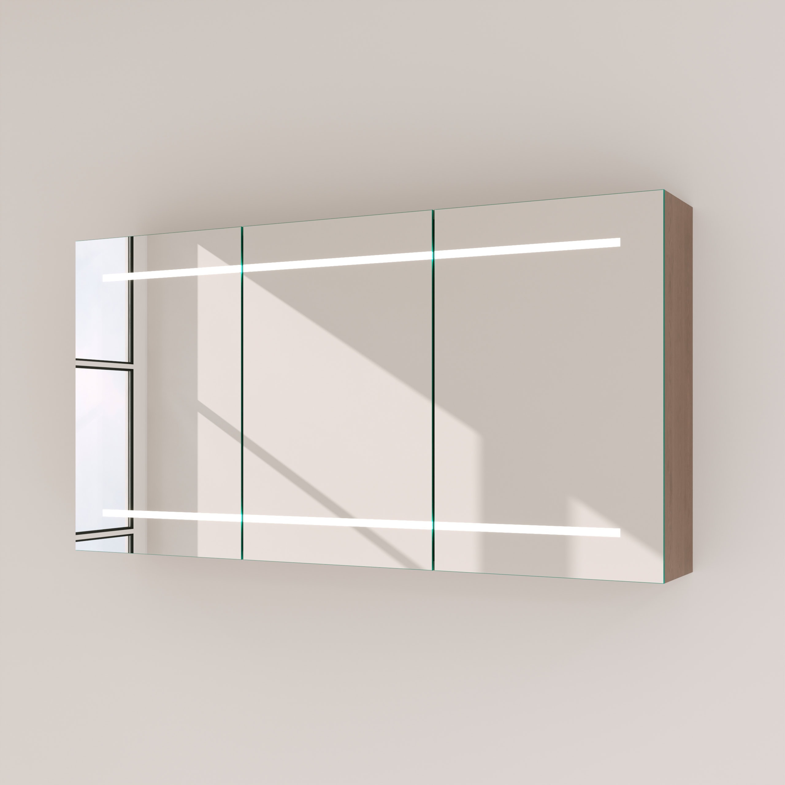 Der Spiegelschrank Modena verwandelt Ihr Badezimmer in eine Oase des Wohlbefindens. Seine charakteristische LED-Beleuchtung oben und unten taucht Ihr Gesicht in ein schmeichelhaftes, schattenfreies Licht, das speziell für die kosmetische Anwendung optimiert wurde. Die indirekt erhellten, satinierten Leuchtfelder wirken im ausgeschalteten Zustand wie edles Milchglas und entfalten eingeschaltet ihre volle, blendfreie Leuchtkraft. Jedes Detail dieses Schranks zeugt von höchster Qualität: Das brillante Spiegelbild verdanken Sie einem 6 mm starken Kristallspiegel, dessen Kanten sorgfältig geschliffen und poliert sind. Der robuste, 19 mm starke Korpus wird nach Ihren Wünschen in Farbe und Tiefe gefertigt, sodass sich der Spiegelschrank harmonisch in Ihr Raumkonzept einfügt. Im Inneren sorgen hochwertige Blum-Scharniere mit Soft-Close-Mechanismus für ein sanftes und geräuschloses Schließen der Türen – ein Hauch von Luxus bei jeder Berührung. Als individuelle Maßanfertigung wird der Modena zu einem einzigartigen Element Ihres Zuhauses.