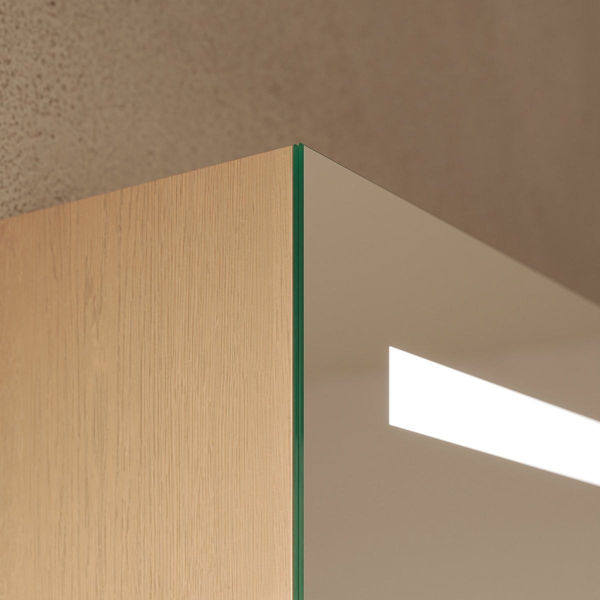 Der Spiegelschrank Noera oben definiert Individualität neu. Gefertigt nach Ihren exakten Breiten-, Höhen- und Tiefenmaßen, fügt er sich harmonisch in jede Badarchitektur ein. Der Korpus aus robusten 19mm Holzdekorplatten, dessen Farbe Sie frei wählen, bildet die stabile Basis für die eleganten Spiegeltüren. Diese bestehen aus 6mm starkem Kristallspiegel, dessen sorgfältig geschliffene und veredelte Kanten ein klares Bekenntnis zu Qualität und Detailverliebtheit sind. Im Inneren sorgt die bewährte Soft-Close-Technologie von Blum für ein sanftes und geräuschloses Schließen der Türen – ein täglicher Komfort, der den Unterschied macht. Das Highlight ist die oben positionierte LED-Beleuchtung: Sie illuminiert indirekt satinierte Leuchtfelder und schafft so ein blendfreies, für kosmetische Anwendungen optimiertes Licht. Ausgeschaltet präsentieren sich die 4cm breiten Felder in einer dezenten Milchglas-Optik, die das puristische Design unterstreicht.