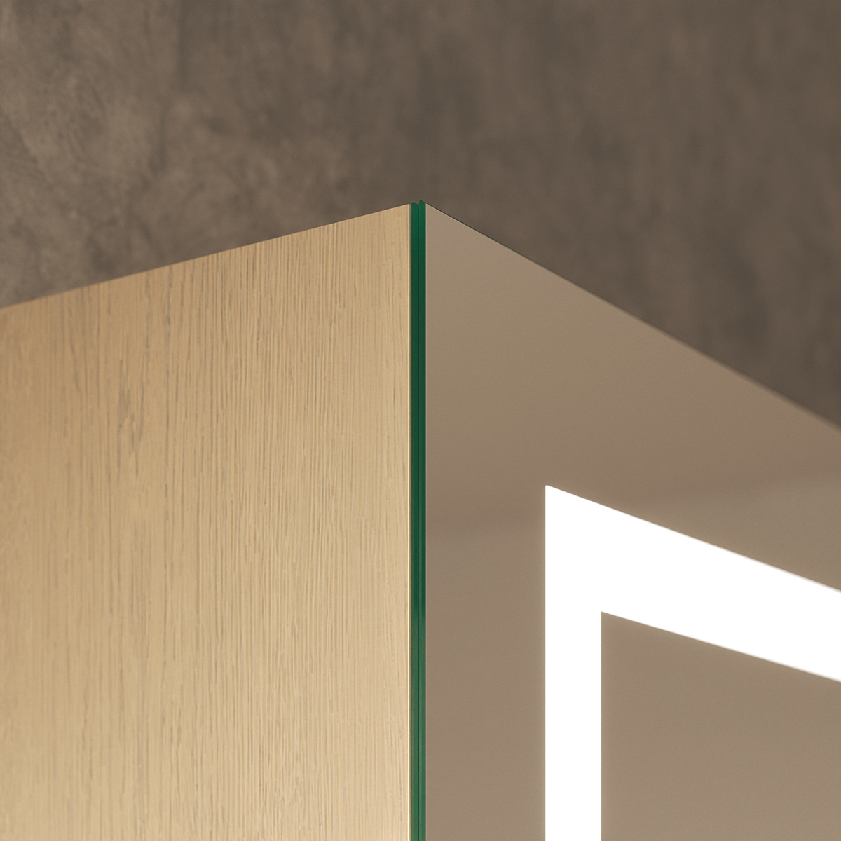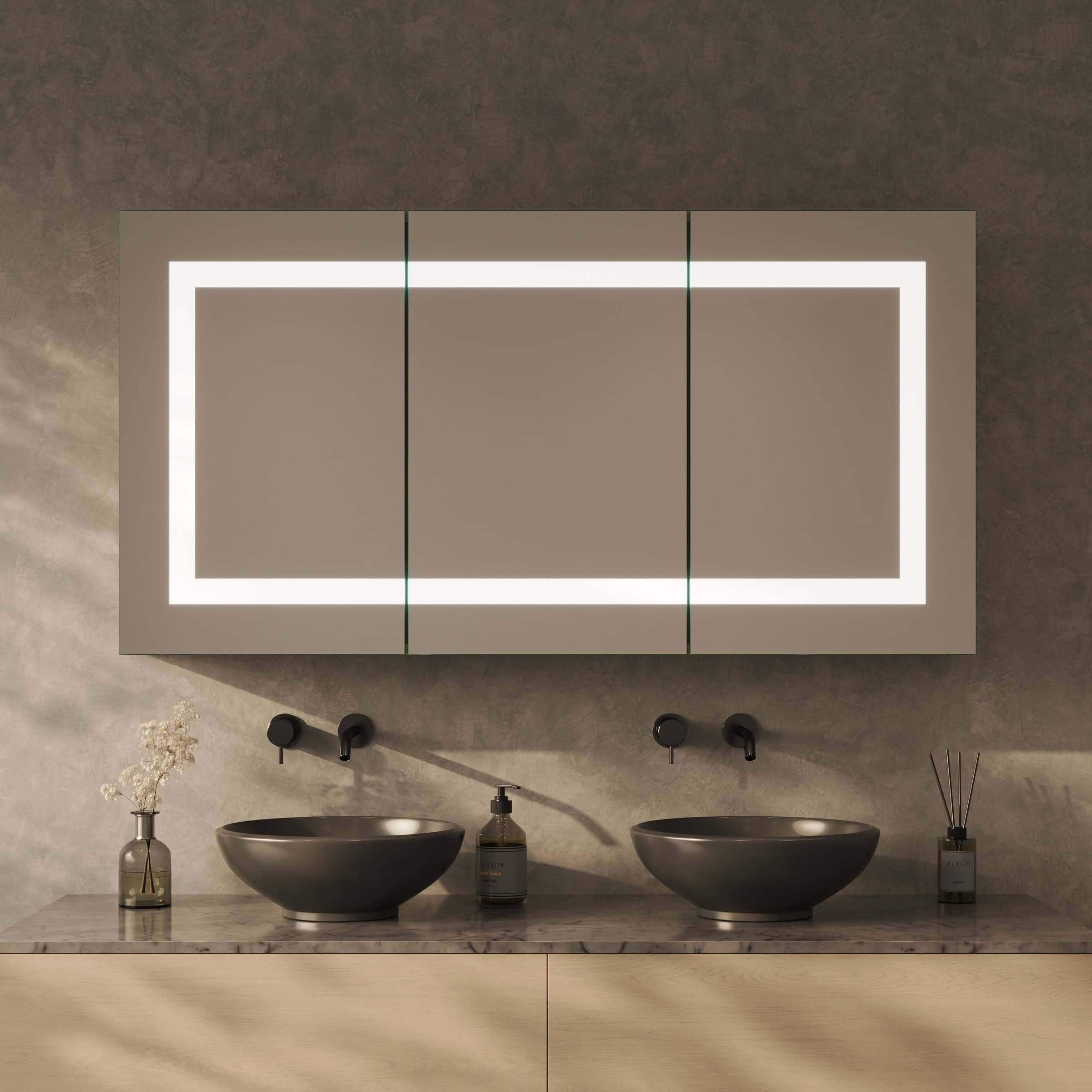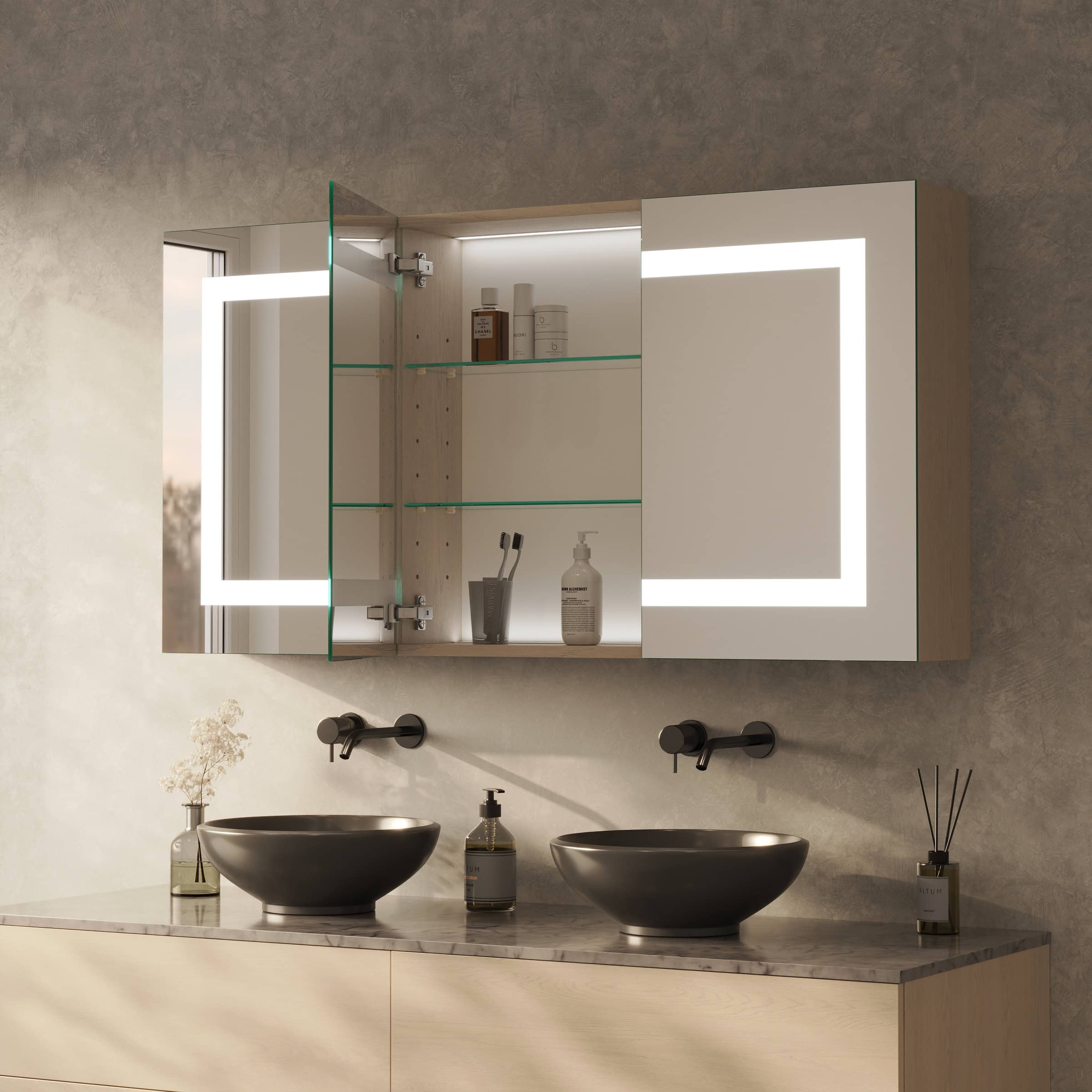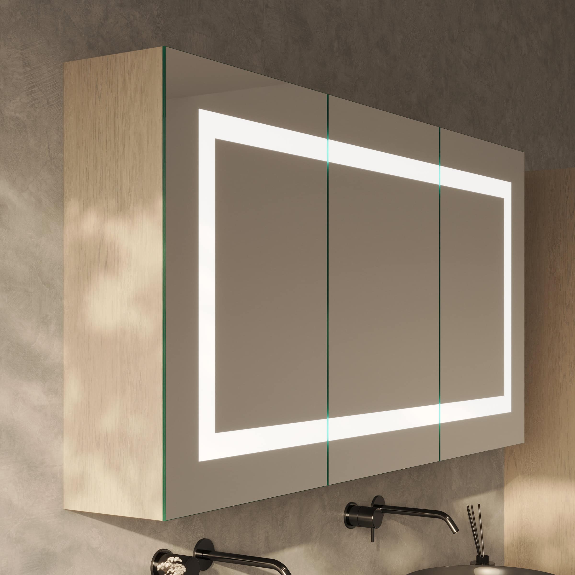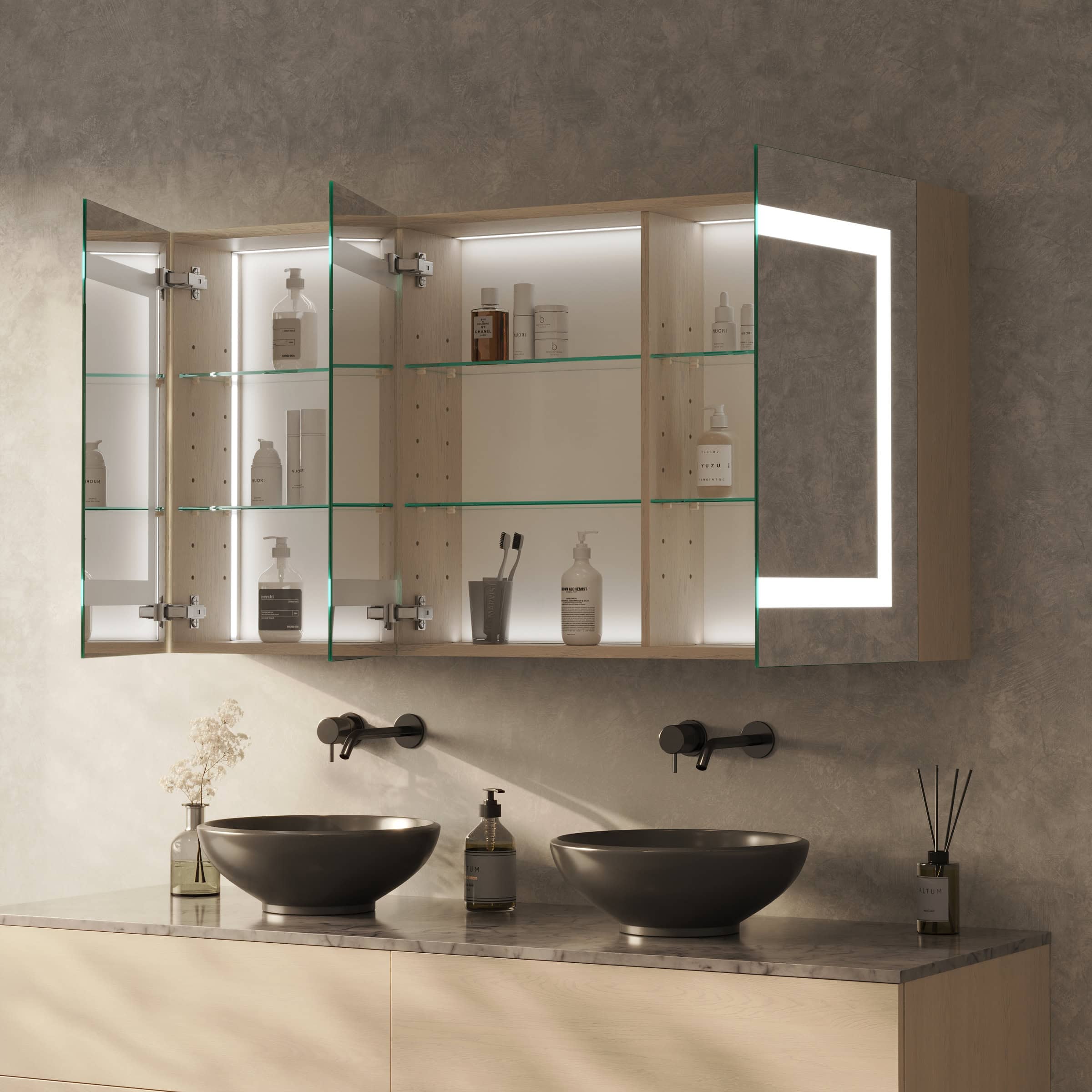Der Spiegelschrank Noera definiert Ihr Badambiente neu, indem er exzellente Funktionalität mit einer Aura von Luxus verbindet. Die rundherum laufende LED-Beleuchtung taucht Ihr Spiegelbild in ein schattenfreies, für kosmetische Anwendungen optimiertes Licht. Hinter 4 cm breiten, satinierten Leuchtfeldern verbirgt sich eine innovative Lichttechnik, die im ausgeschalteten Zustand an edles Milchglas erinnert und eingeschaltet eine weiche, indirekte Helligkeit verströmt. Gefertigt aus 6 mm starkem Kristallspiegelglas mit veredelten Kanten, garantiert Noera eine brillante, verzerrungsfreie Ansicht. Der Korpus aus 19 mm starken Holzdekorplatten wird individuell nach Ihrer Farbwahl und Ihren Maßen gefertigt und fügt sich nahtlos in Ihre Raumgestaltung ein. Im Inneren zeugen hochwertige Scharniere von Blum mit Soft-Close-Mechanismus von kompromissloser Qualität – für ein sanftes, geräuschloses Schließen der Türen bei jedem Gebrauch.