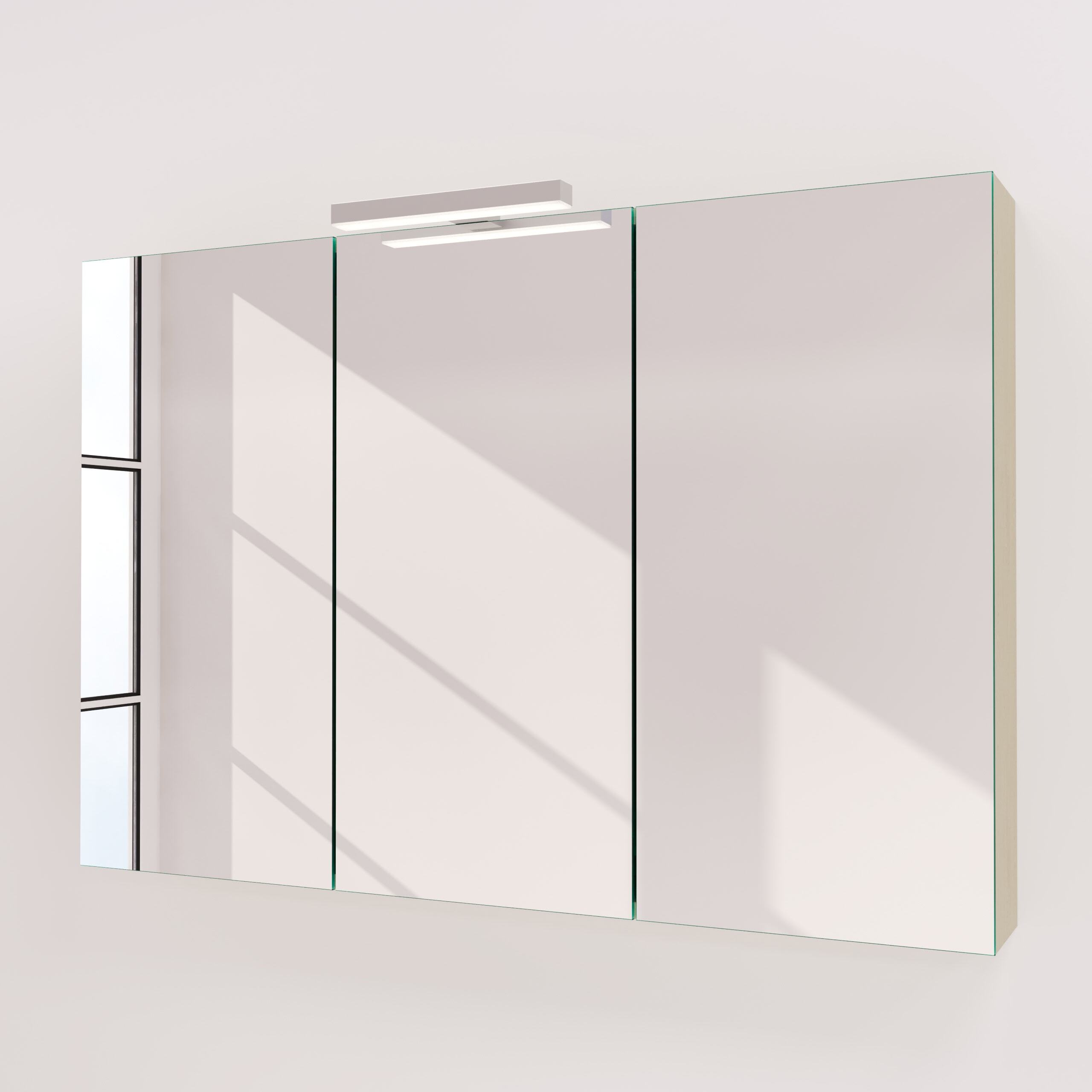 Der Spiegelschrank Lunea ist mehr als nur ein Möbelstück – er ist Ausdruck Ihres individuellen Stils. Als exakte Maßanfertigung fügt er sich millimetergenau und harmonisch in die Architektur Ihres Badezimmers ein. Der Korpus aus robusten, 19 mm starken Holzdekorplatten und die frei wählbare Farbe erlauben eine perfekte Abstimmung auf Ihr Raumkonzept. Hinter den Türen, die dank hochwertiger Blum-Scharniertechnik mit Soft-Close-Funktion sanft und lautlos schließen, verbirgt sich durchdachter Stauraum. Das Herzstück bildet der brillante, 6 mm dicke Kristallspiegel mit geschliffenen und veredelten Kanten, der für ein klares, verzerrungsfreies Spiegelbild sorgt. Die integrierte LED-Aufsatzleuchte ist speziell für kosmetische Anwendungen optimiert und taucht Ihr Gesicht in schattenfreies, angenehmes Licht – für Präzision und Wohlbefinden bei der täglichen Pflegeroutine.